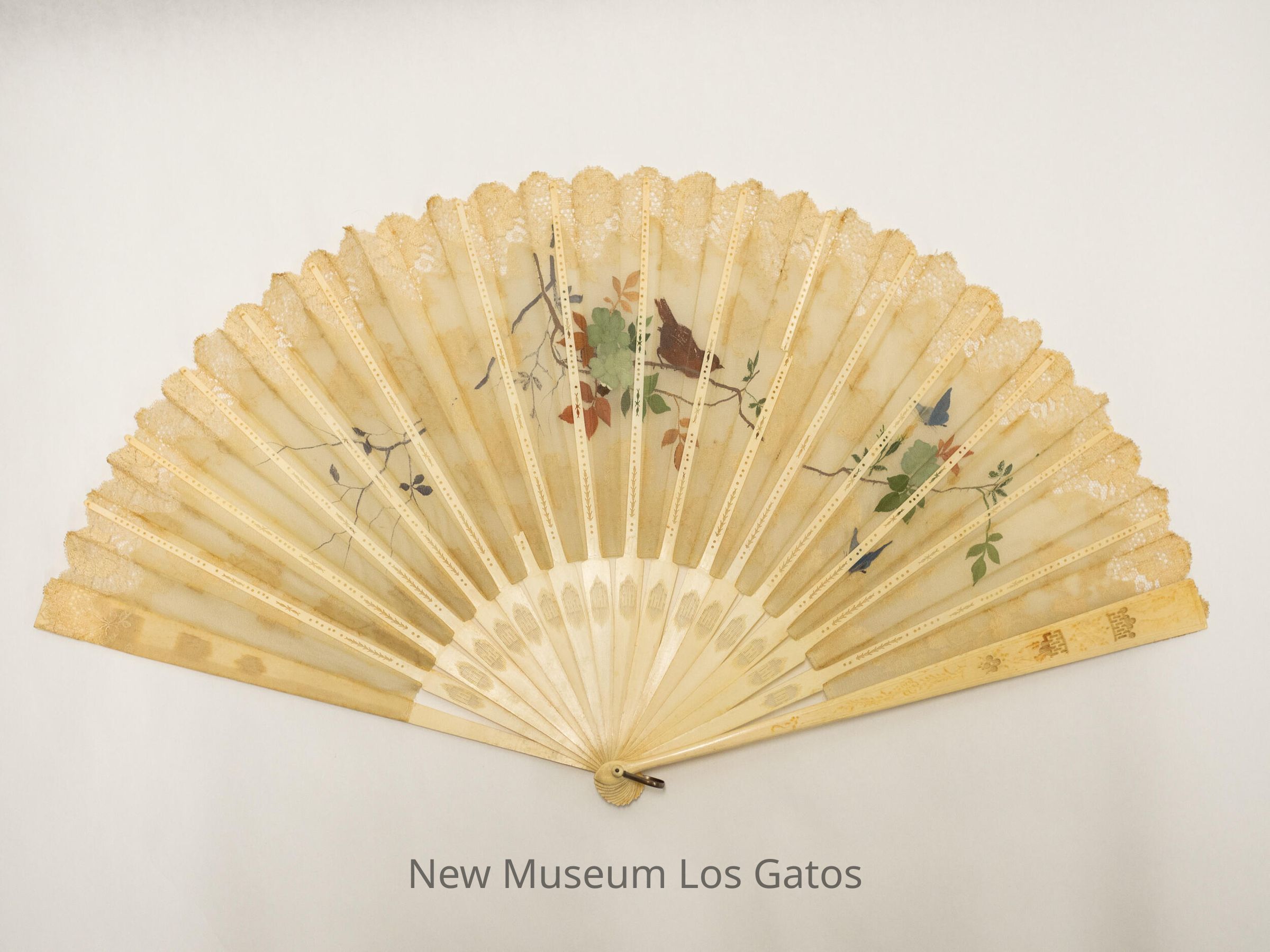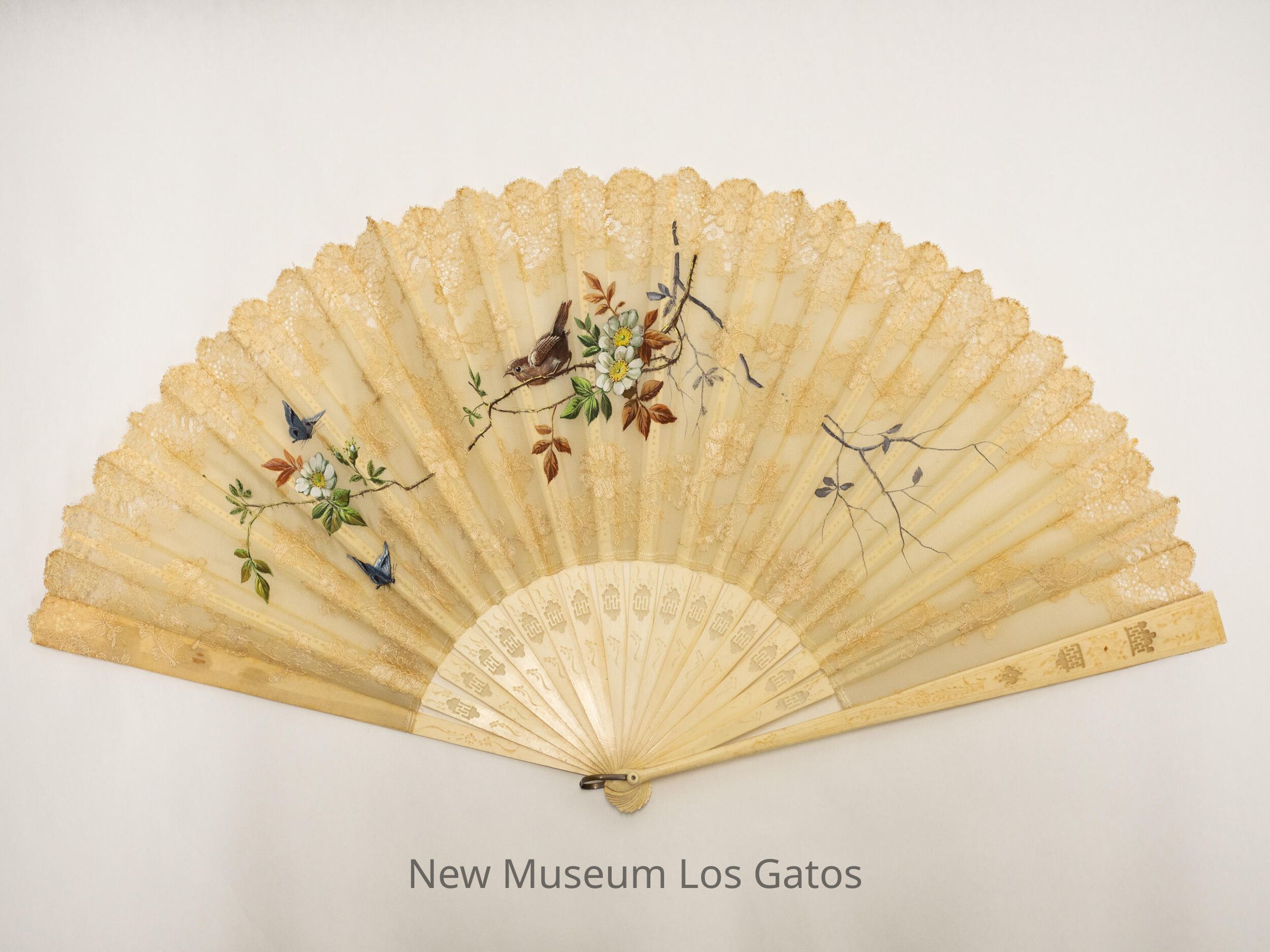 A cream colored, silk hand fan, with lace detailing along the edges as well as throughout the fan. A decorative scene is hand-painted on the fan, depicting a brown bird perched on a branch, various branches and white flowers, and two blue butterflies.Collection