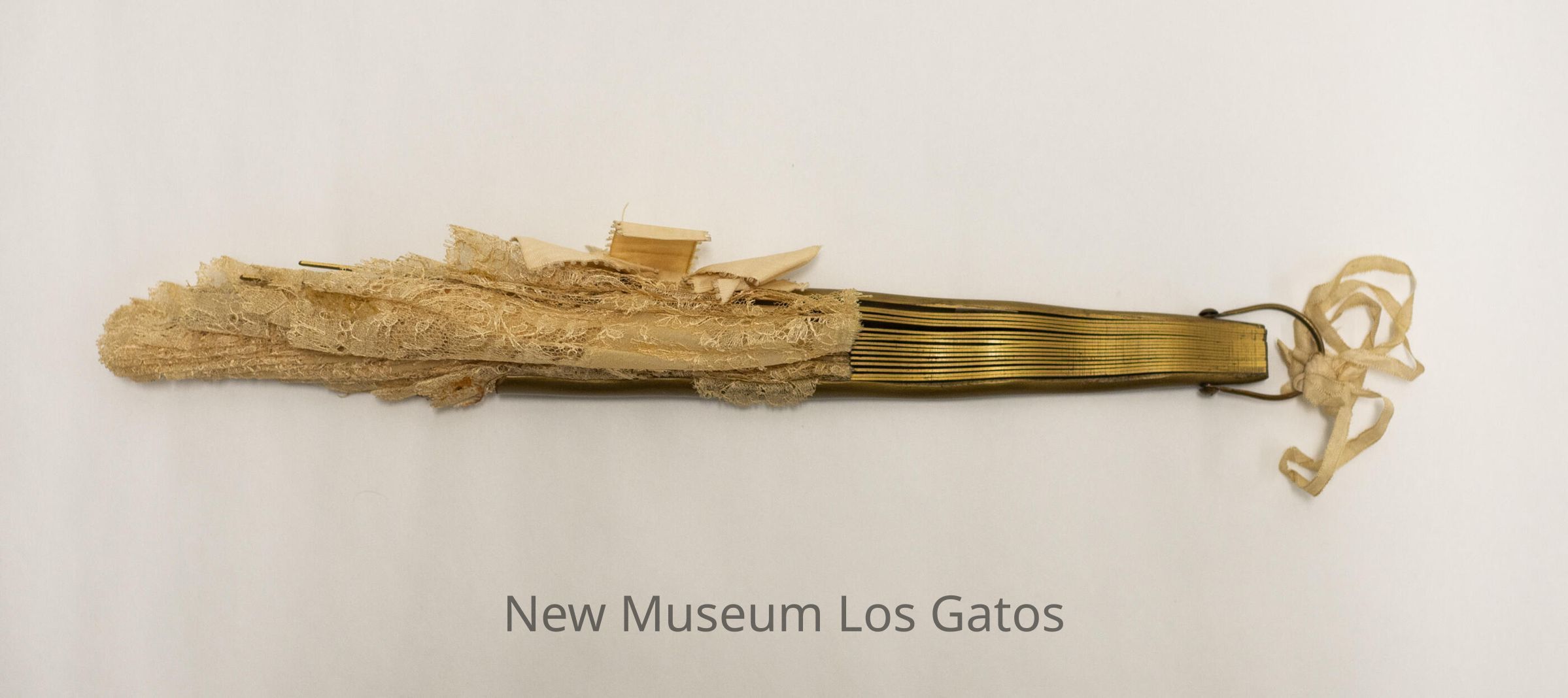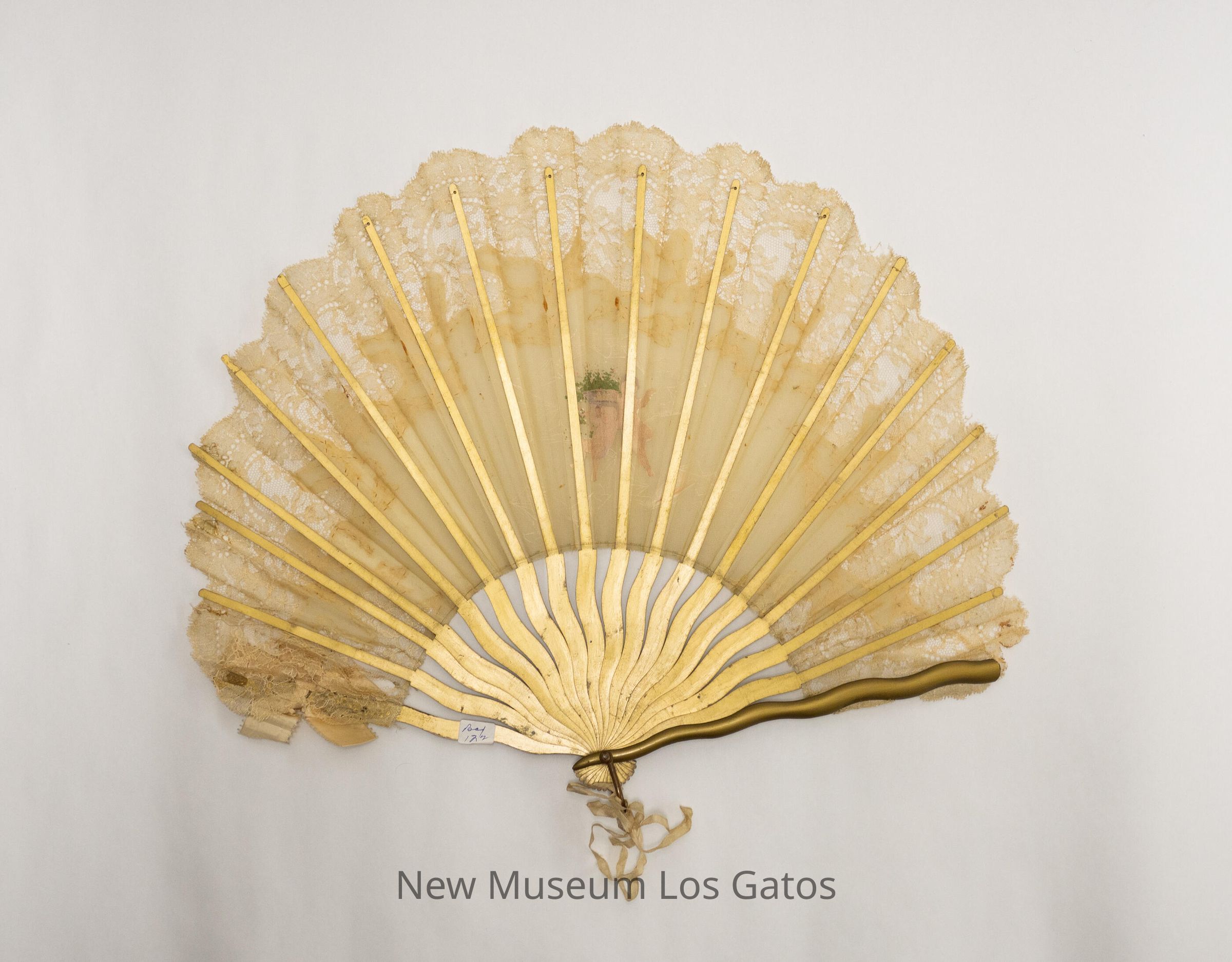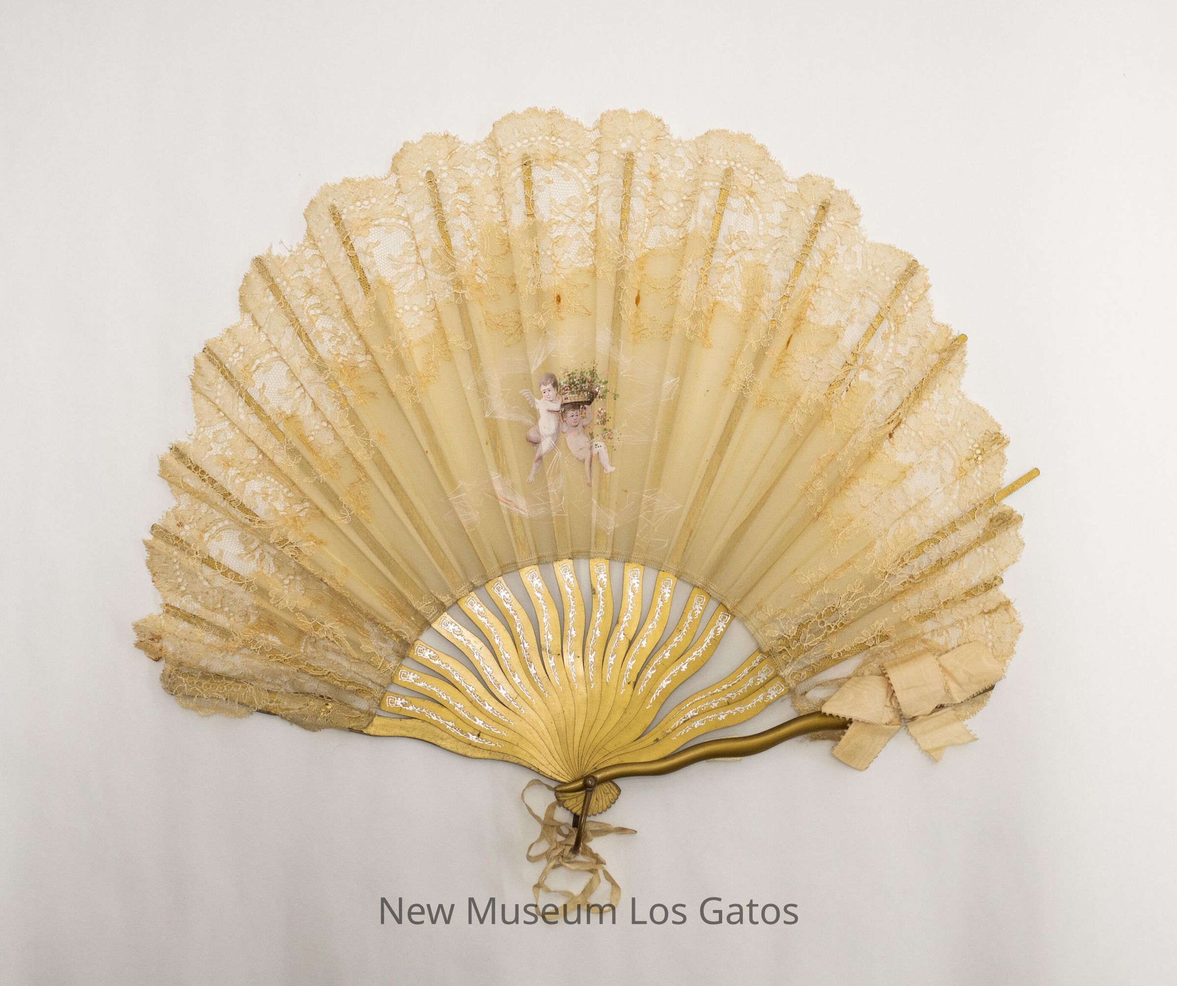 A cream colored silk hand fan, with a large swath of lace detailing along the edges of the fan. There are two hand-painted angels in the center of silk, one of which is carrying a basket of flowers. The sticks are gold-painted plastic, and there is a fabric bow on the right (viewer's) guard.Collection