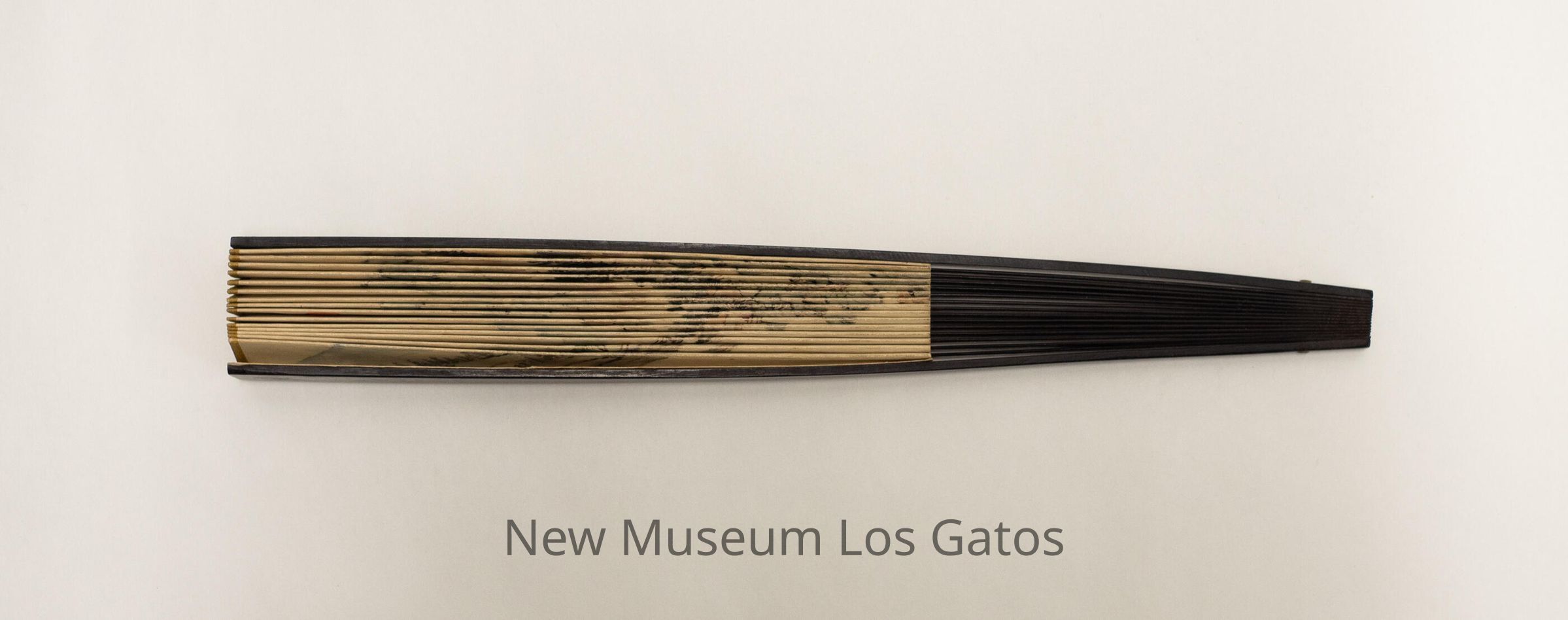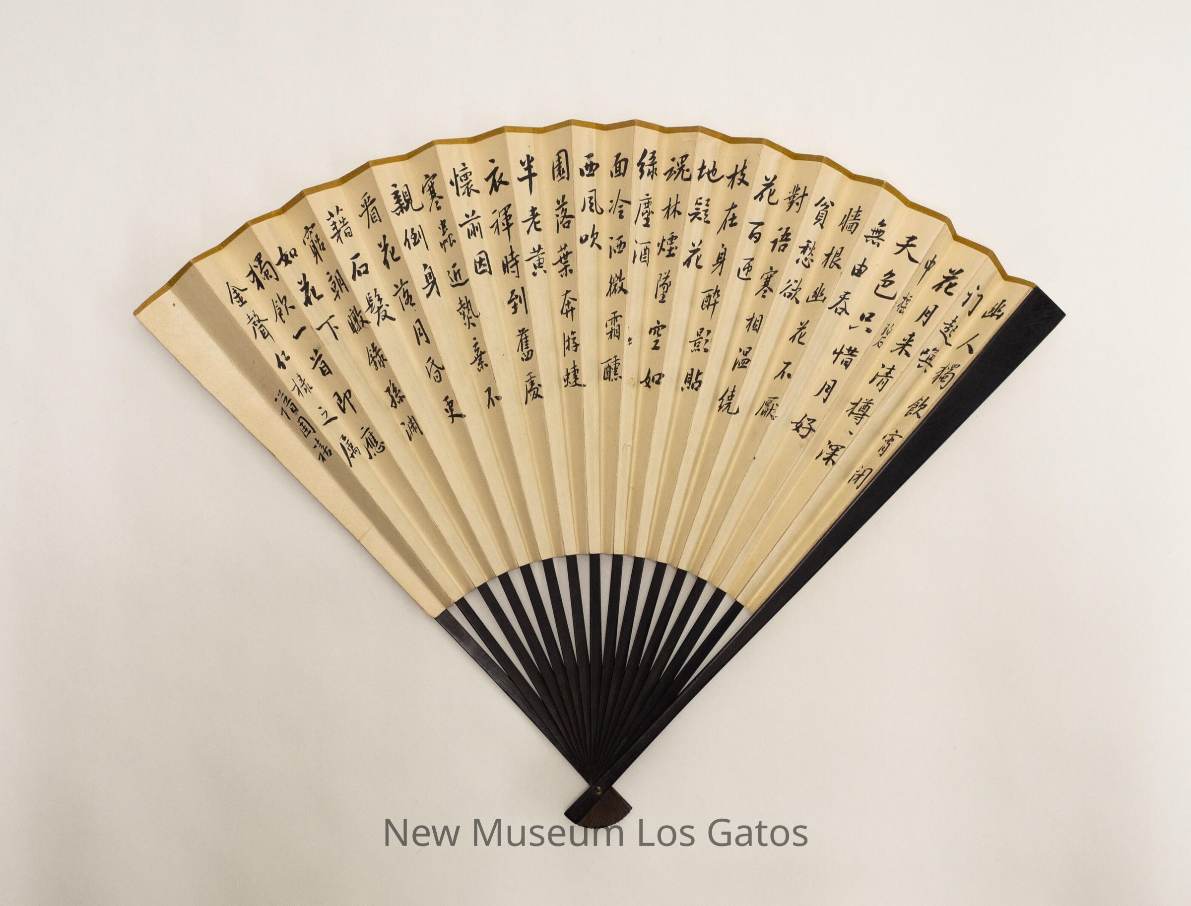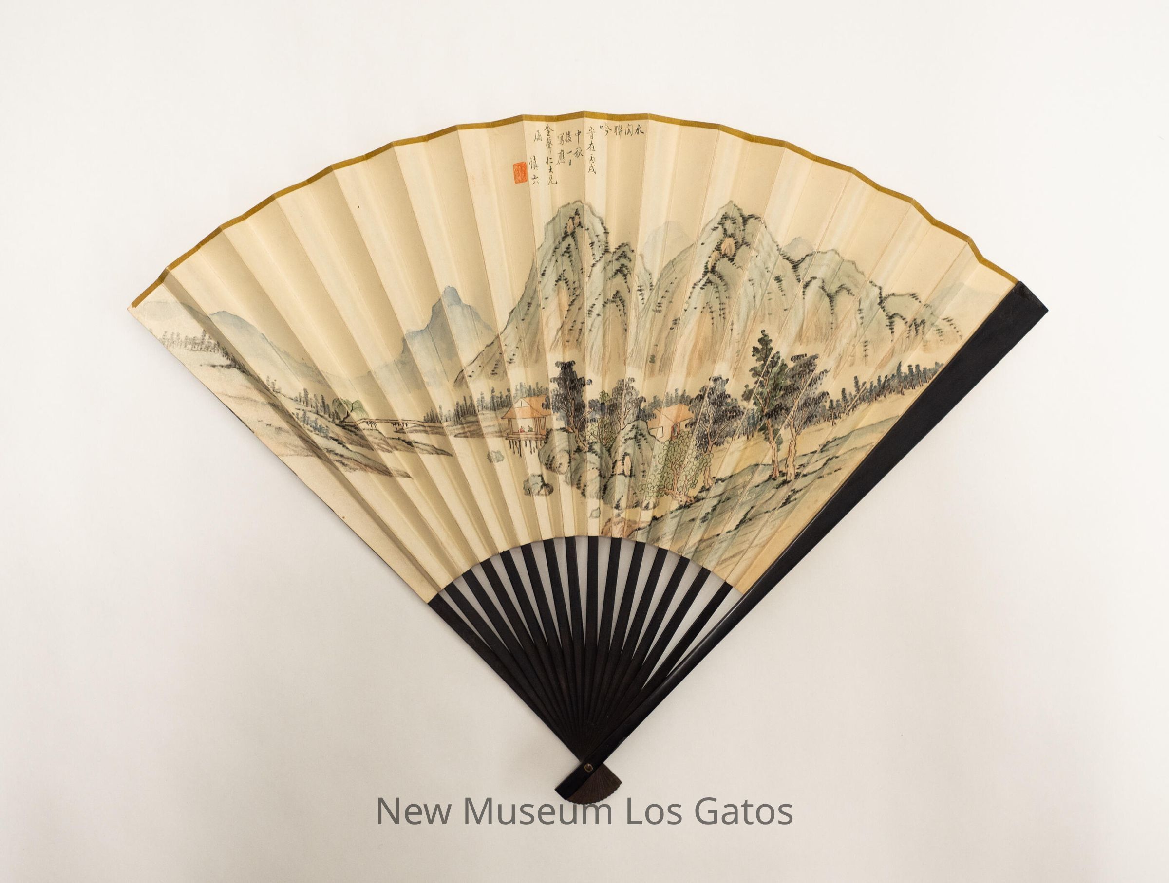 A wood and paper hand fan. The fan is white, with a thin gold stripe along the top edge. The front of the fan features a hand-painted scene with large mountains and a forest in the background, and hills, trees, and two buildings in the foreground; one of the buildings has two people inside. The back of the fan features hand-painted writing. The sticks and guards are a very dark brown wood.Collection