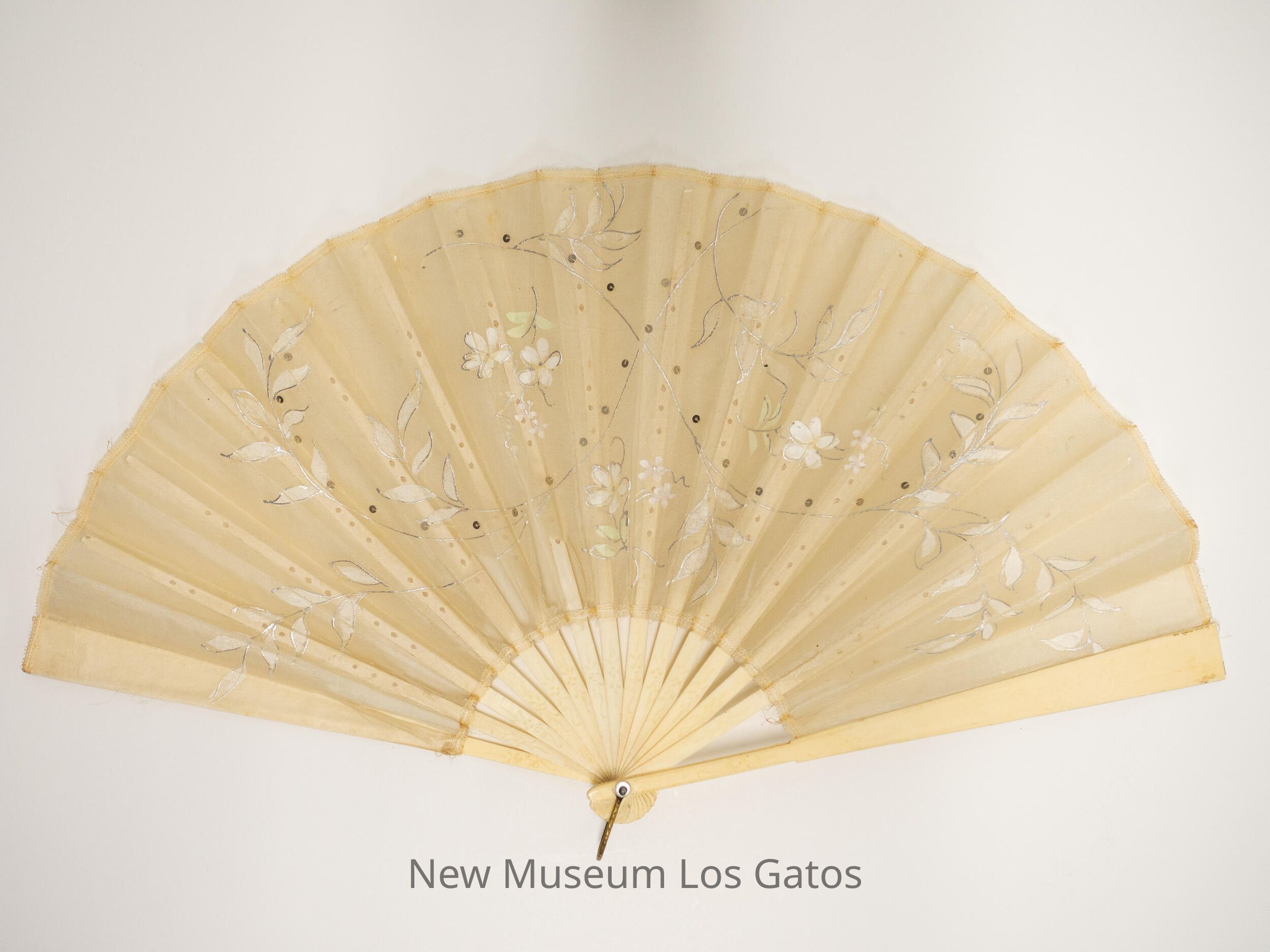 White decorative hand fan. Handles are white/cream colored with flower pattern engraved on them. The fan portion is white/beige and sheer, with white and silver flowers painted on.Collection
