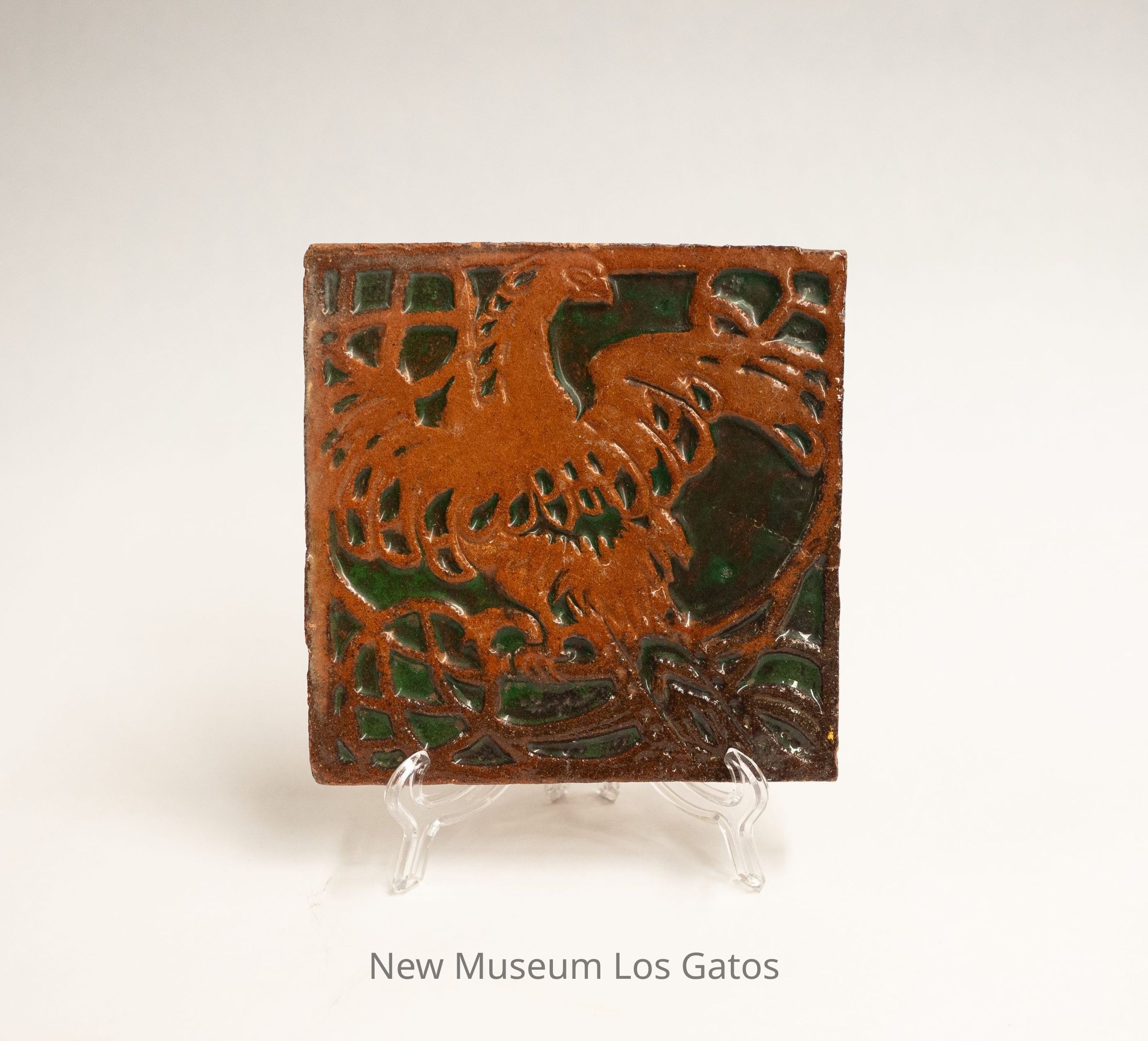 A square, decorative tile. The tile itself is red/terracotta in color, and features a phoenix rising through geometric shapes on its face. The phoenix and geometric lines are glazed red/brown, with the negative space a glazed green.