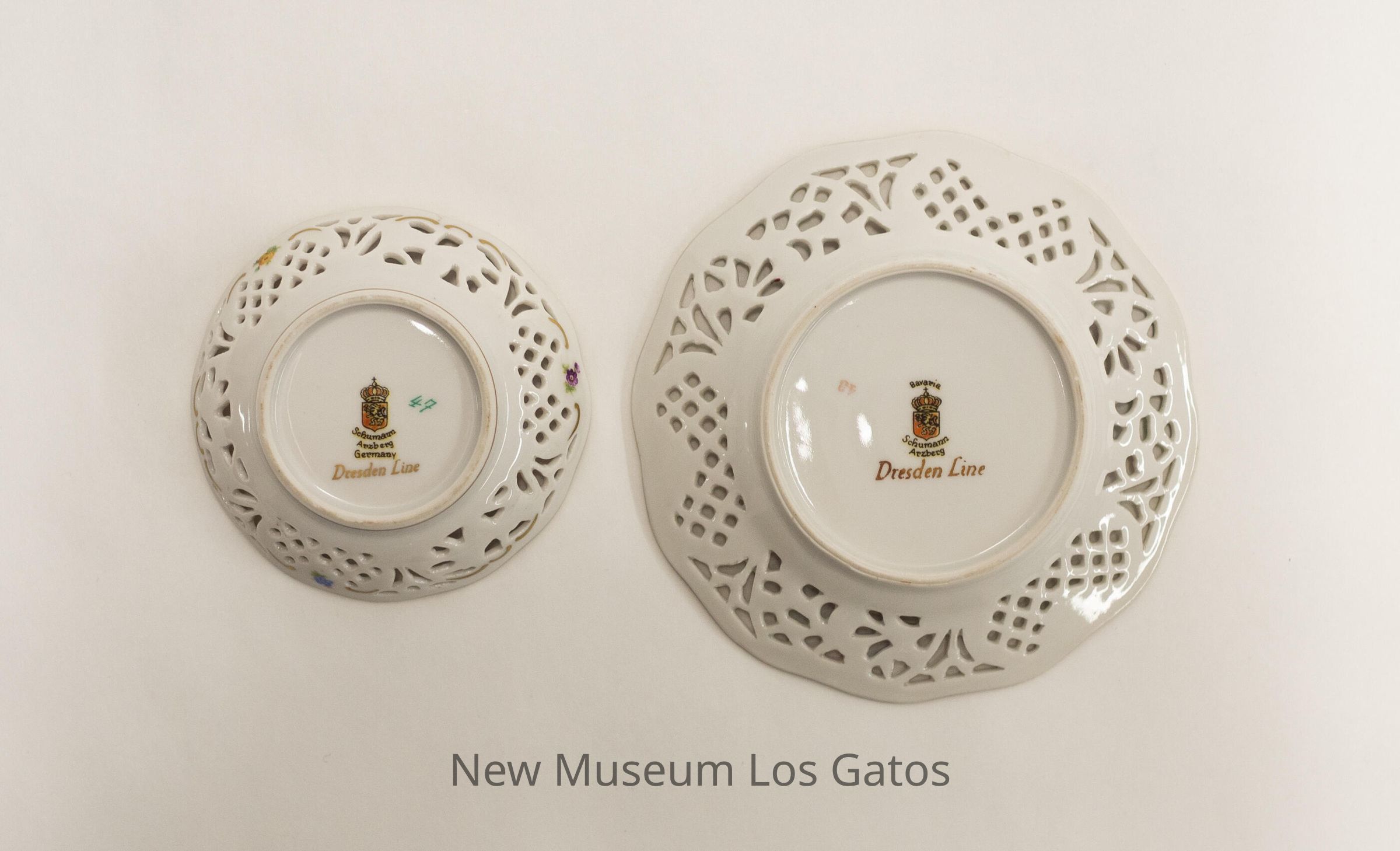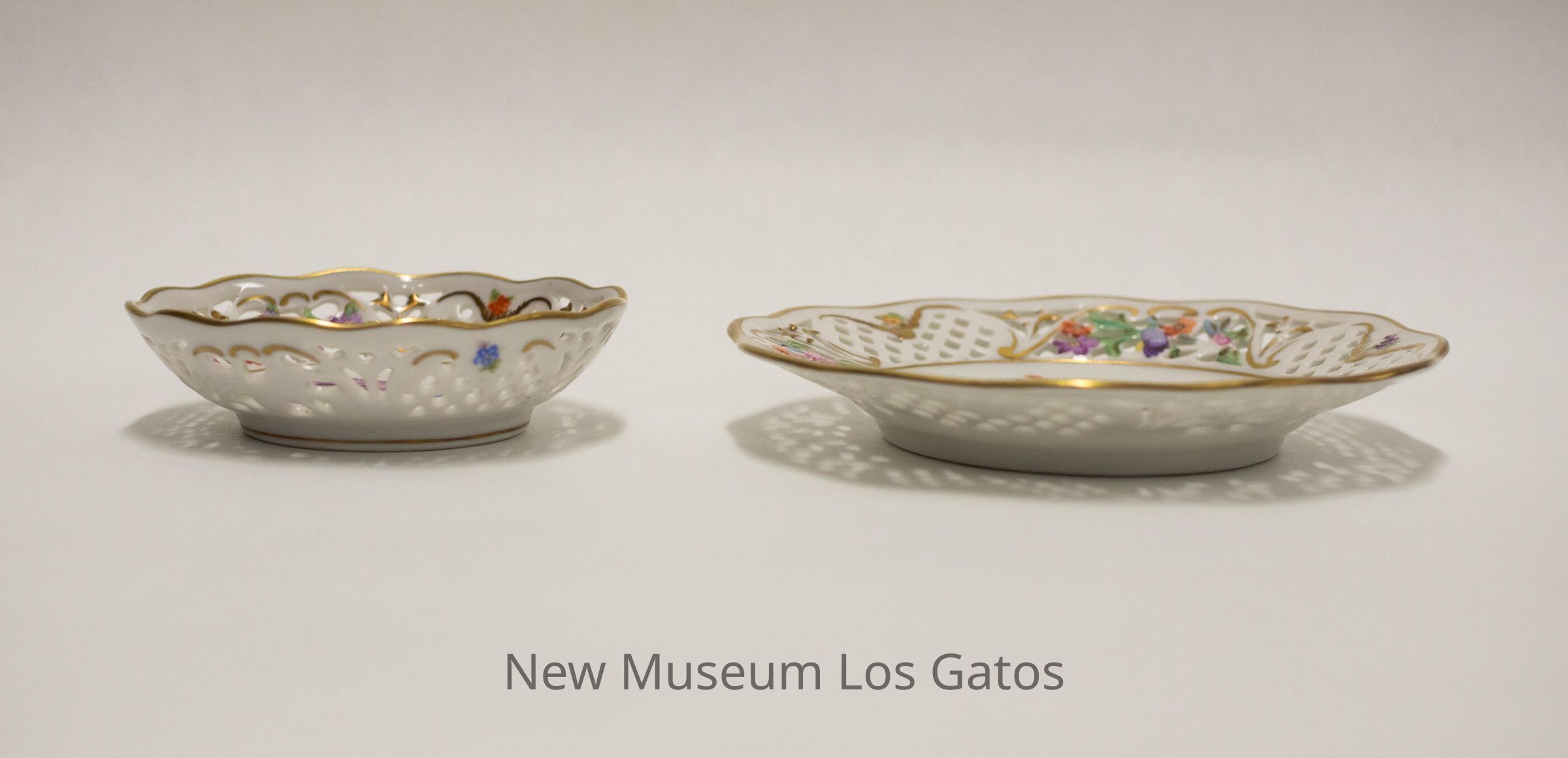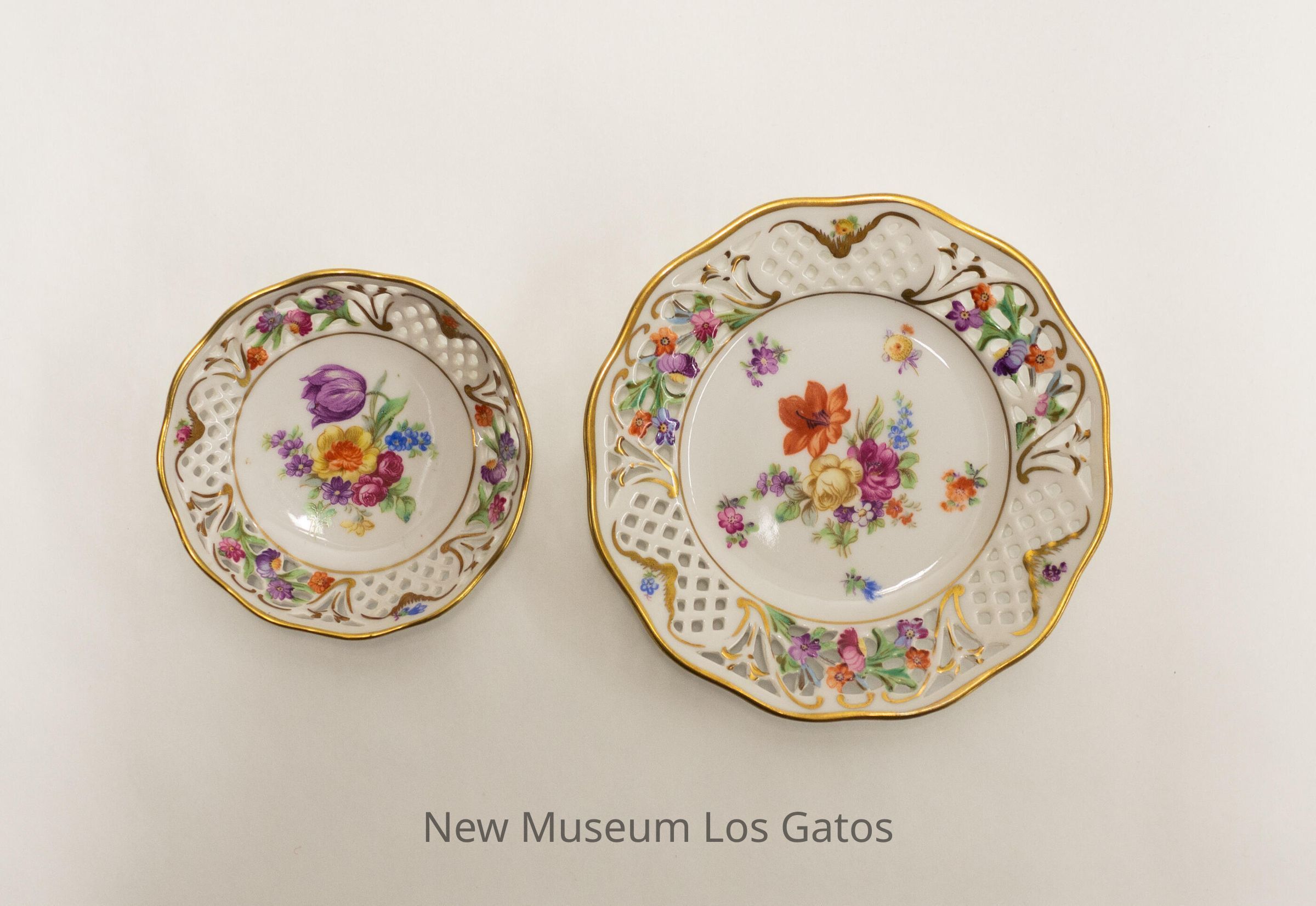 Two small, white ceramic decorative plates. One plate is more flat, while the other plate's sides curve up. Both plates have small, decorative holes along the edges, as well as painted gold trim around the rims and throughout the holes. Painted, colorful flowers decorate both plates as well, in the center and along the the sides of each plate.Collection