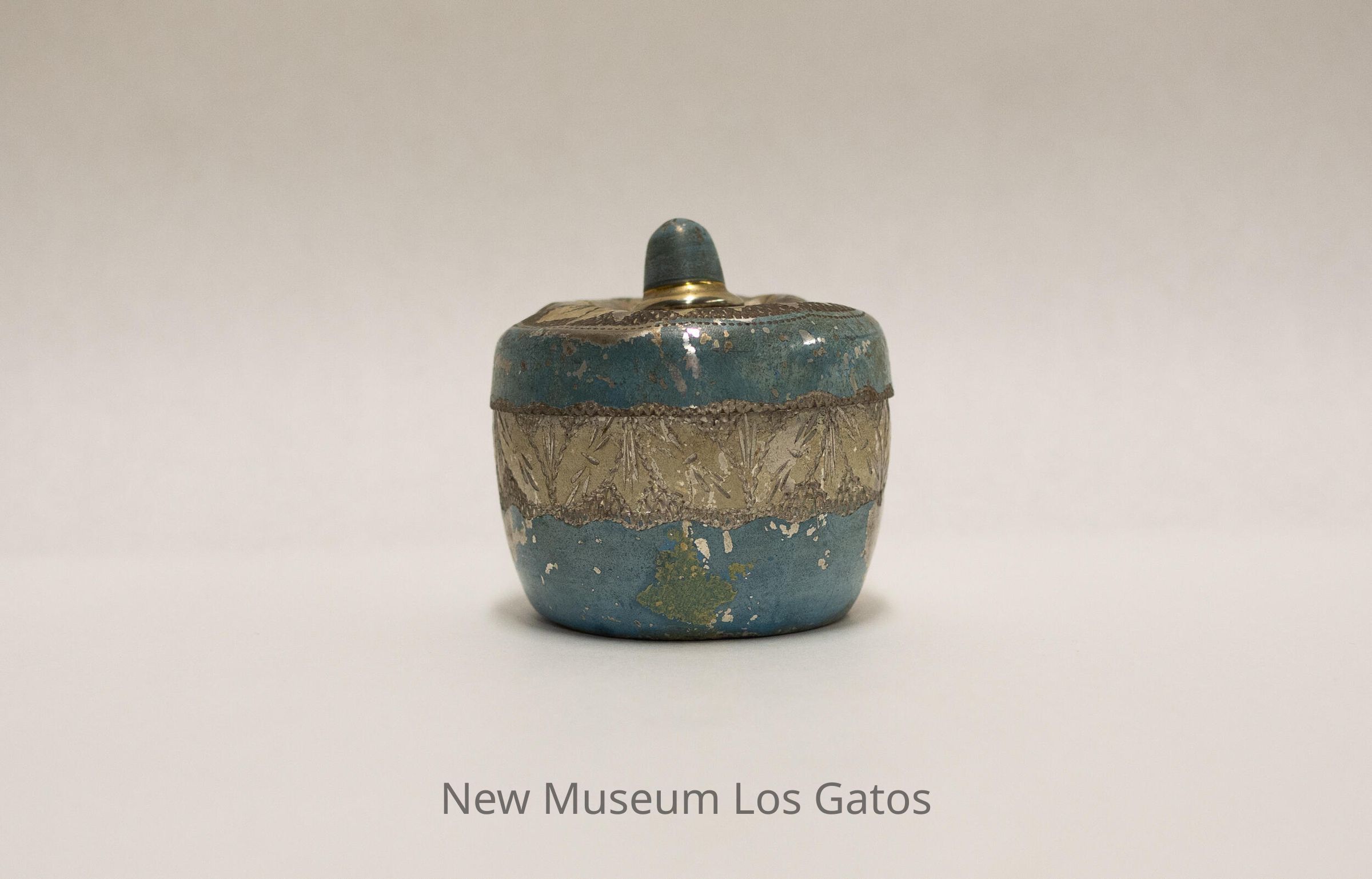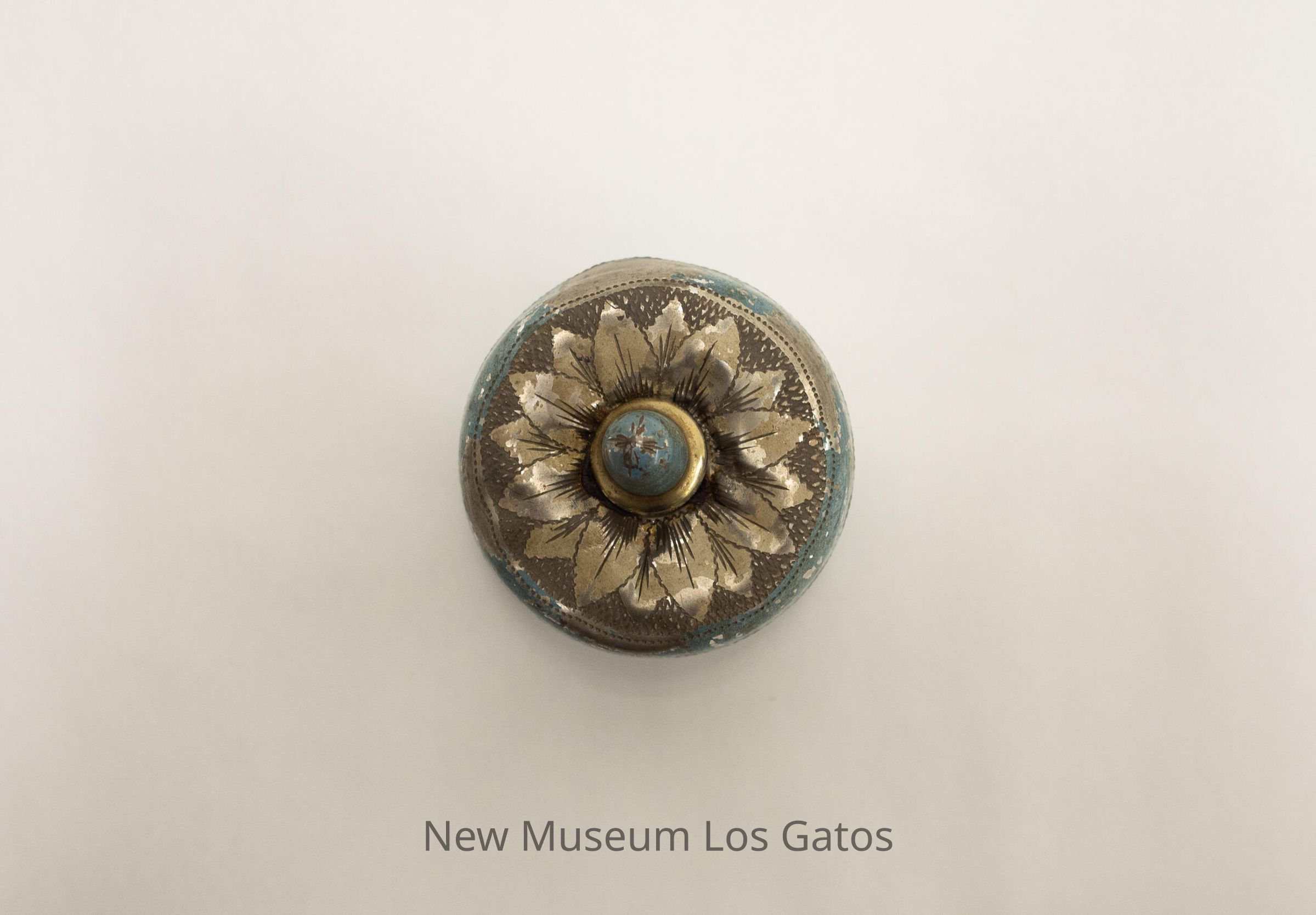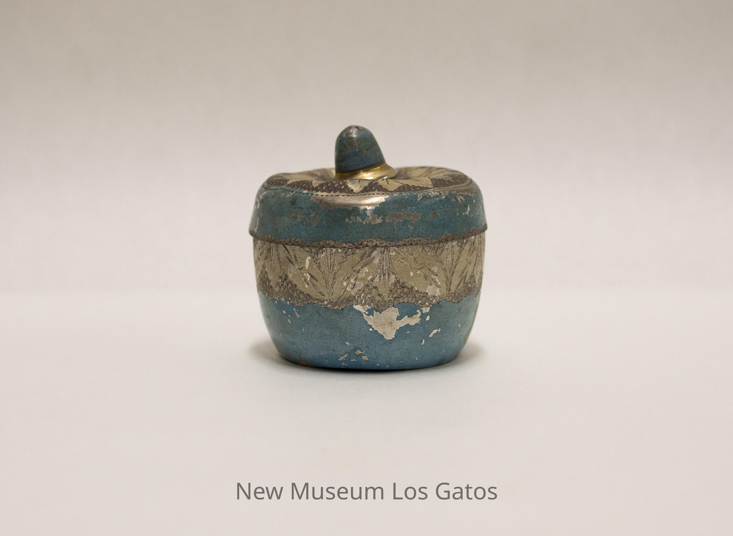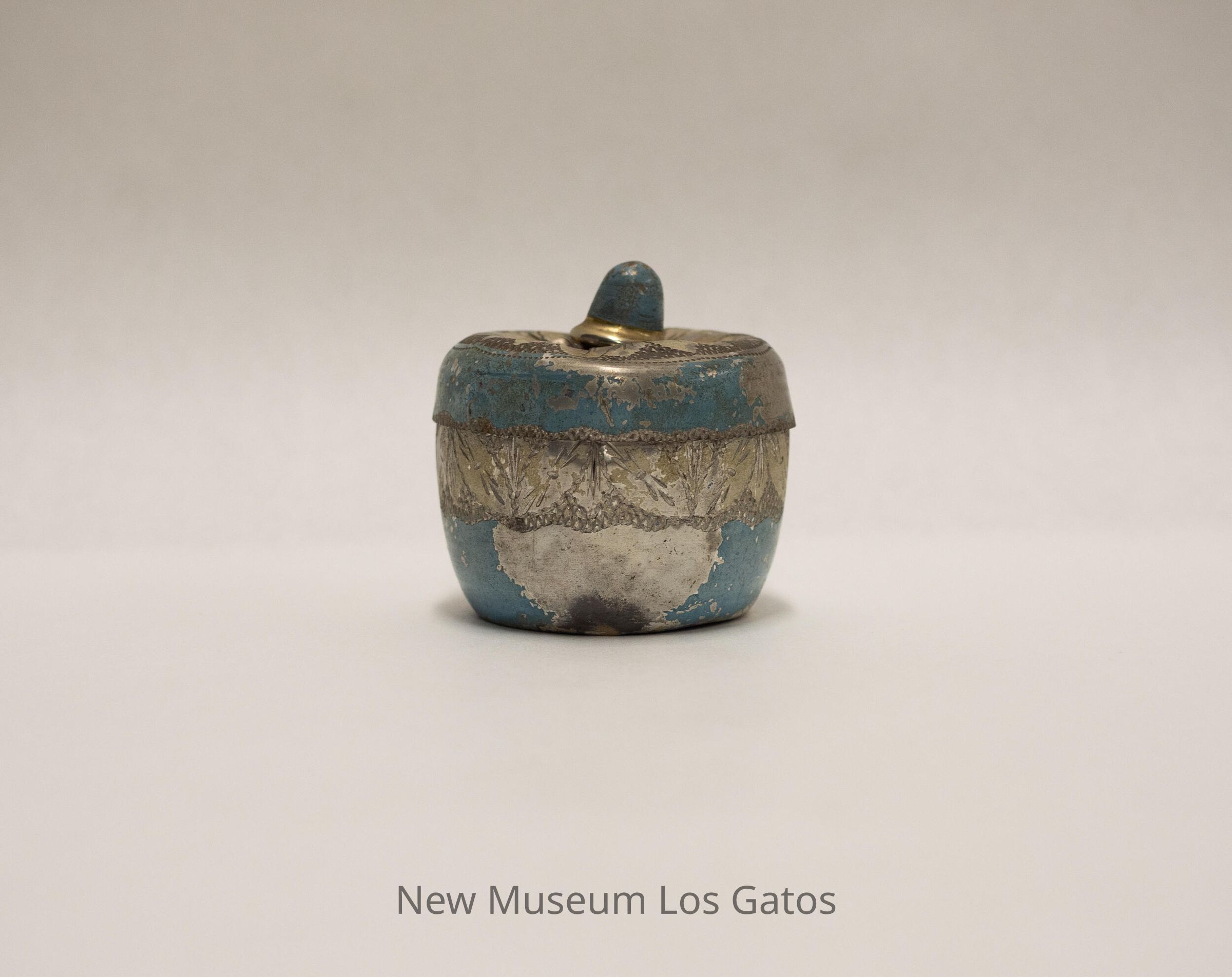 A small, round metal box and lid, with an etched flower pattern on the lid and etched leaves on the box. The box and lid are painted light blue and white. There is a strip of pink tape on the bottom of the box with three Chinese characters on it.