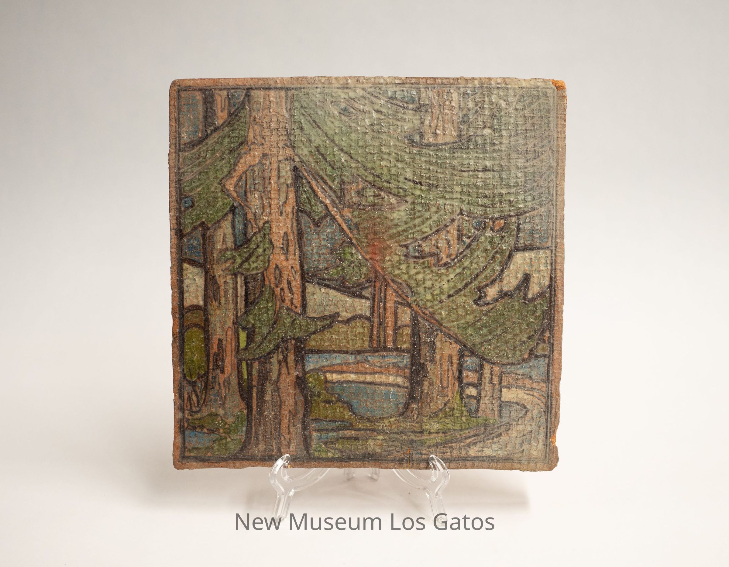 A large square, decorative tile. The tile itself is red/terracotta in color, and features a redwoods scene on its face. The design consists of four redwood trees, with water, a road, and hills scattered throughout.Collection