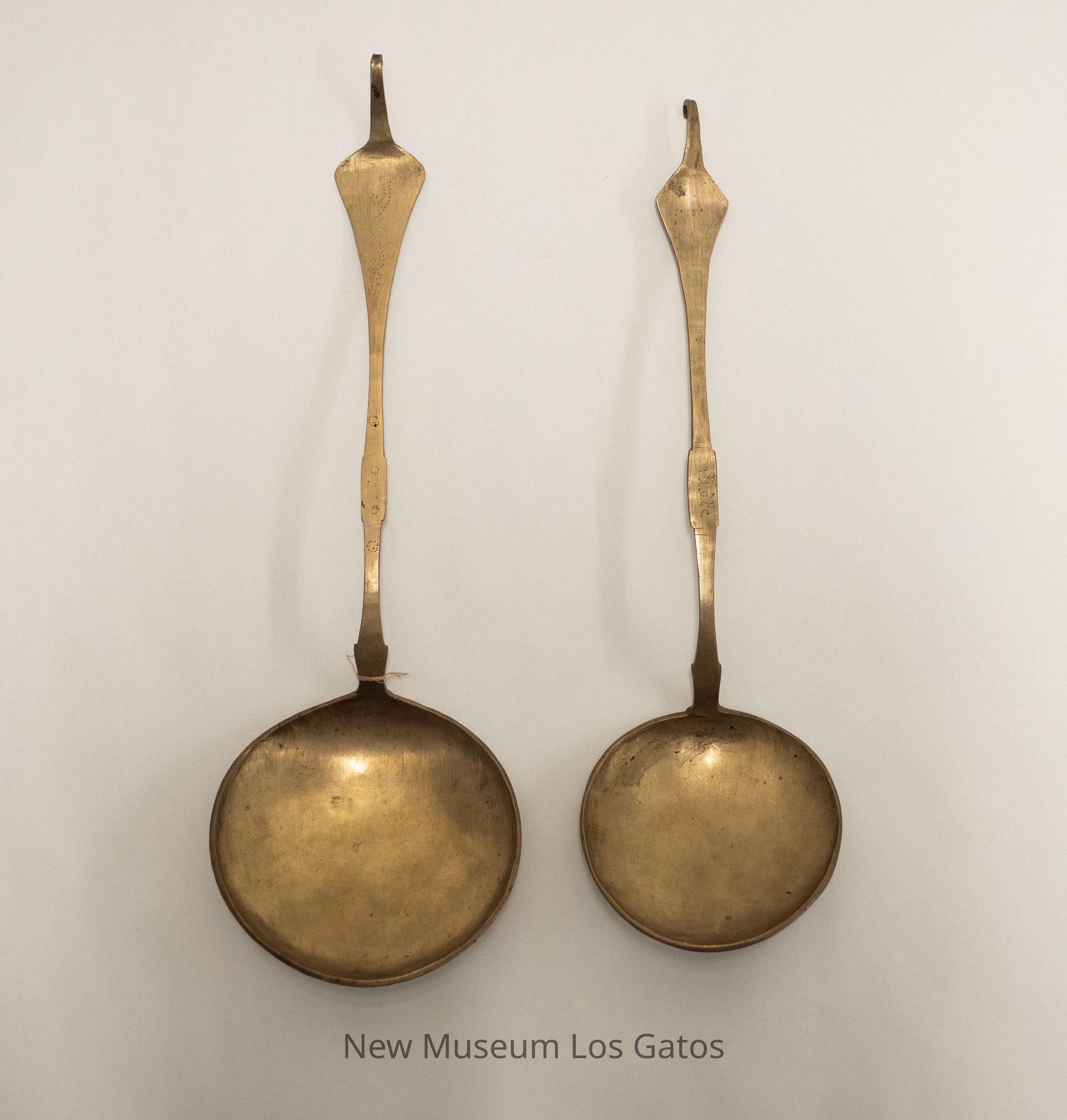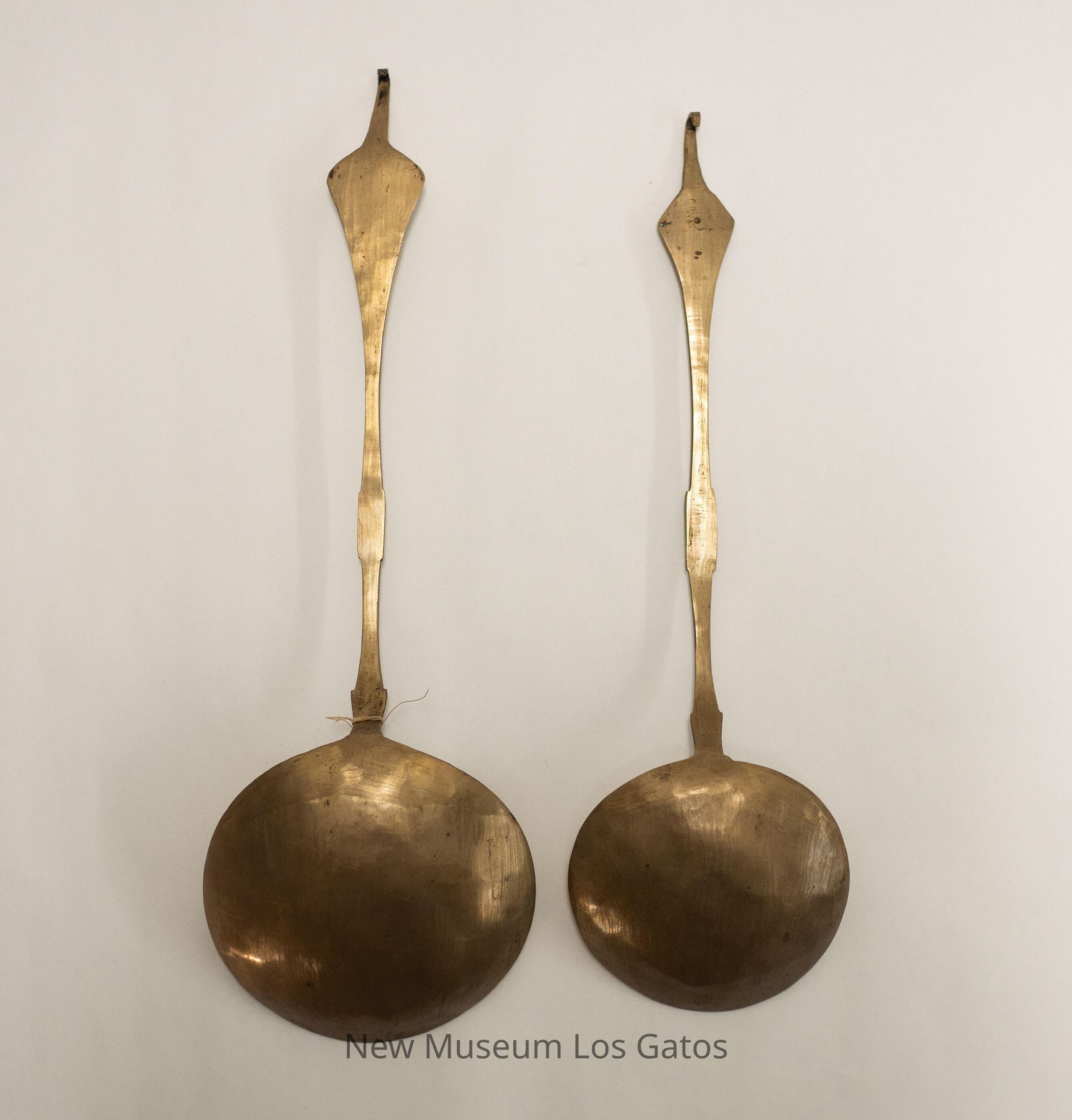 A pair of large, potentially decorative, spoons. Both spoons have large, shallow bowls and long, skinny necks. The handles are diamond-shaped, and have skinny hooks coming out of the top. Both spoons have different, decorative dotted patterns on the neck and handle.Collection