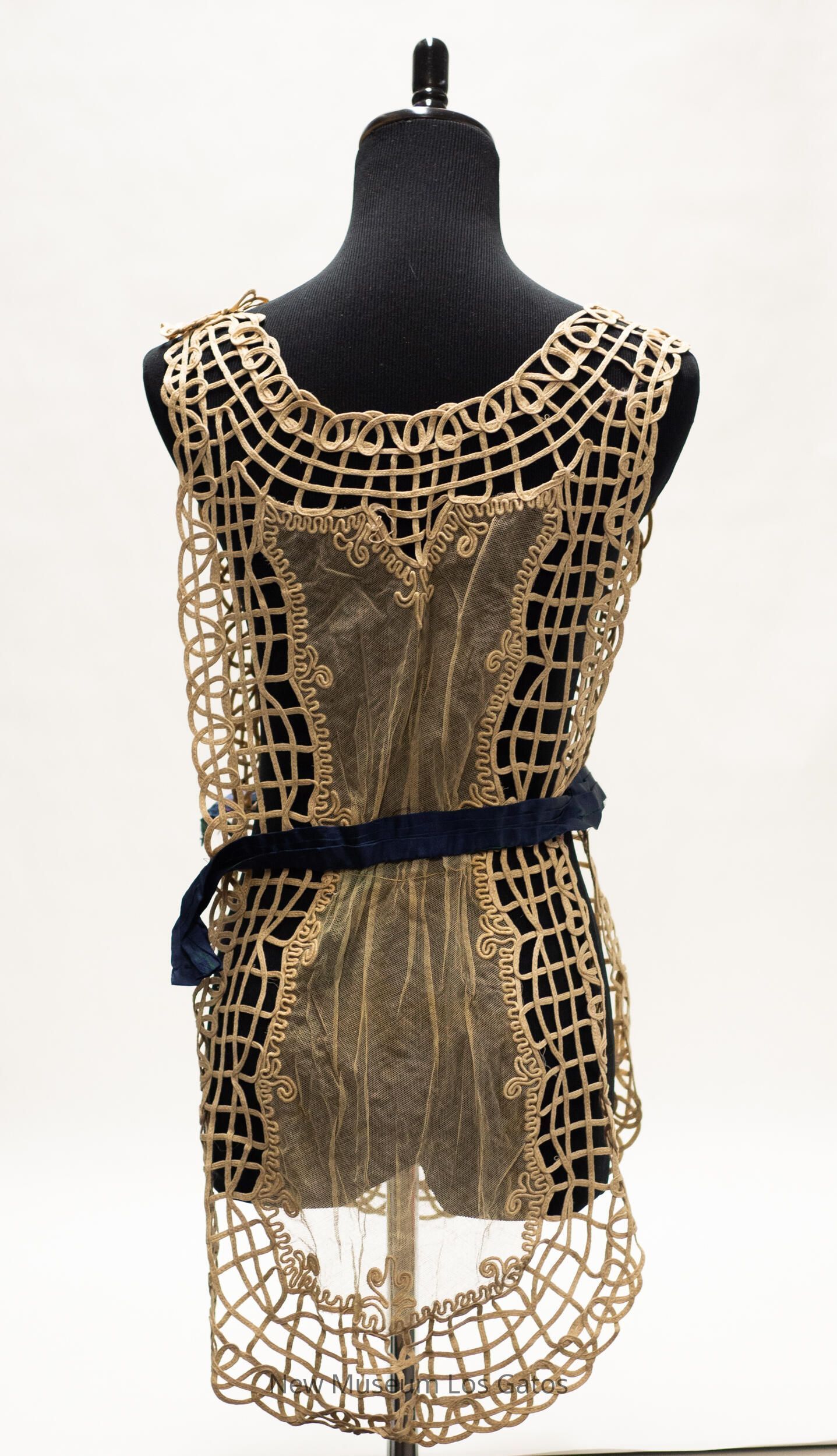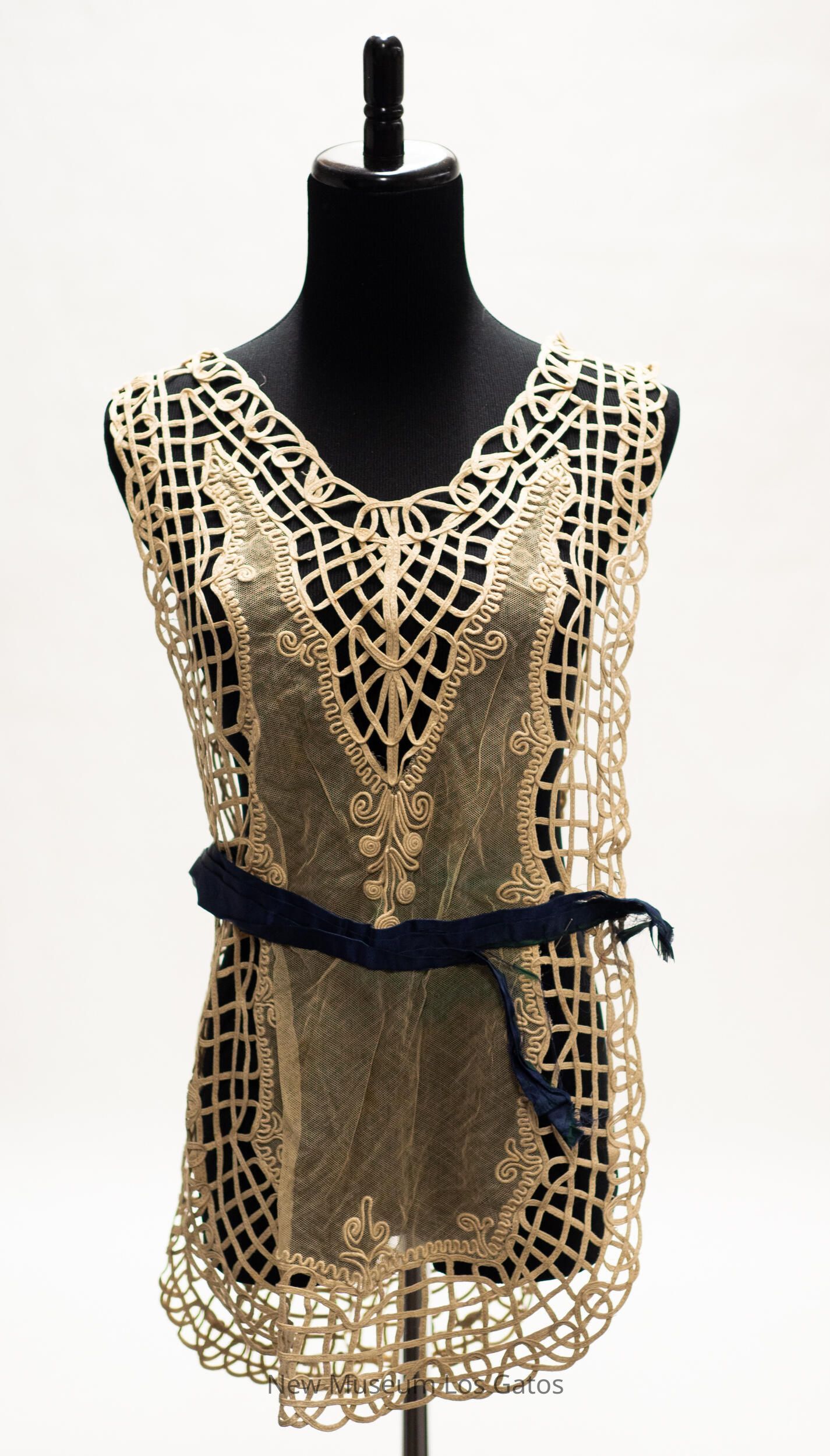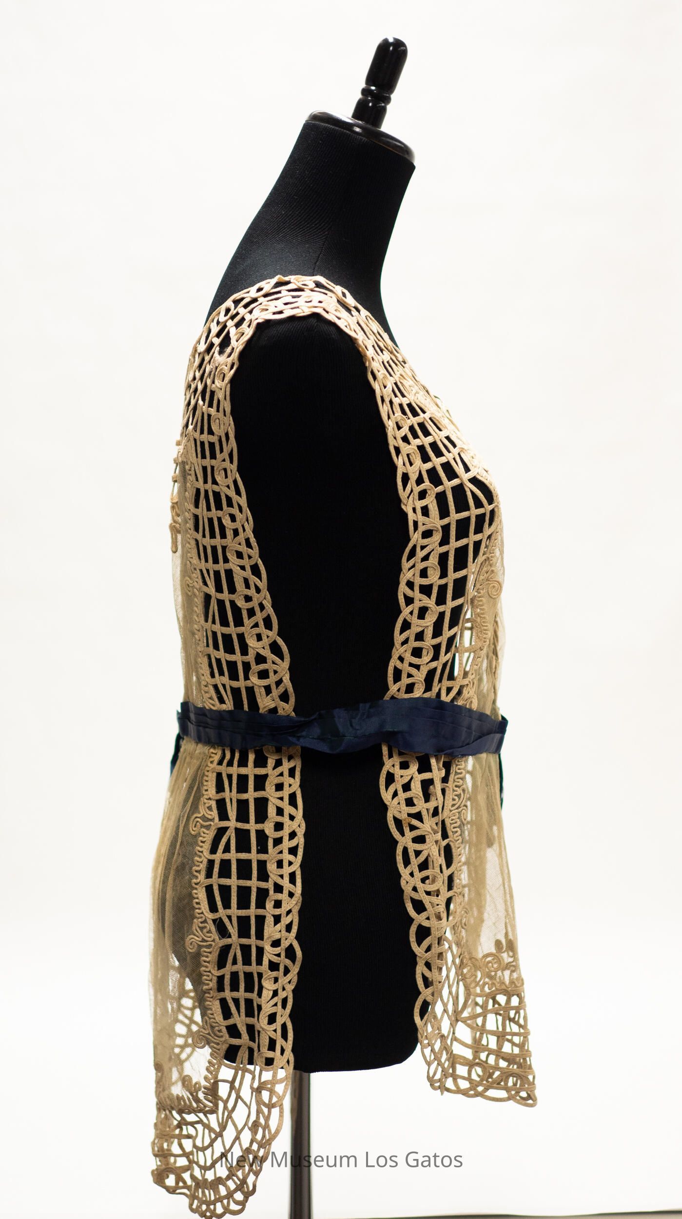 A beige colored vest, with sheer lace/netting in the center, and braided ecru along each edge as well as the neckline and shoulders. The netting has decorative soutache along its border. There is an attached navy silk belt along the center of the vest, which opens and closes with two metal hook-and-eye clasps on one of the shoulders.Collection