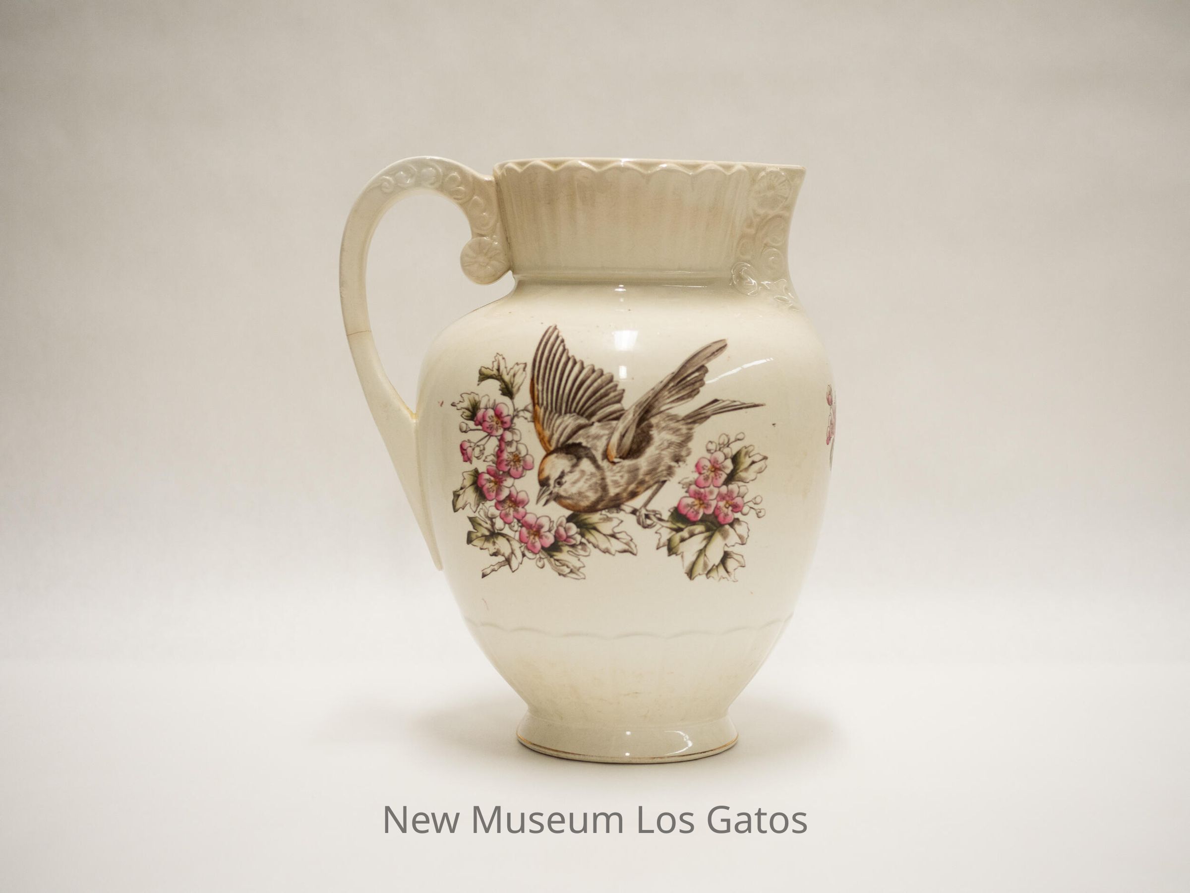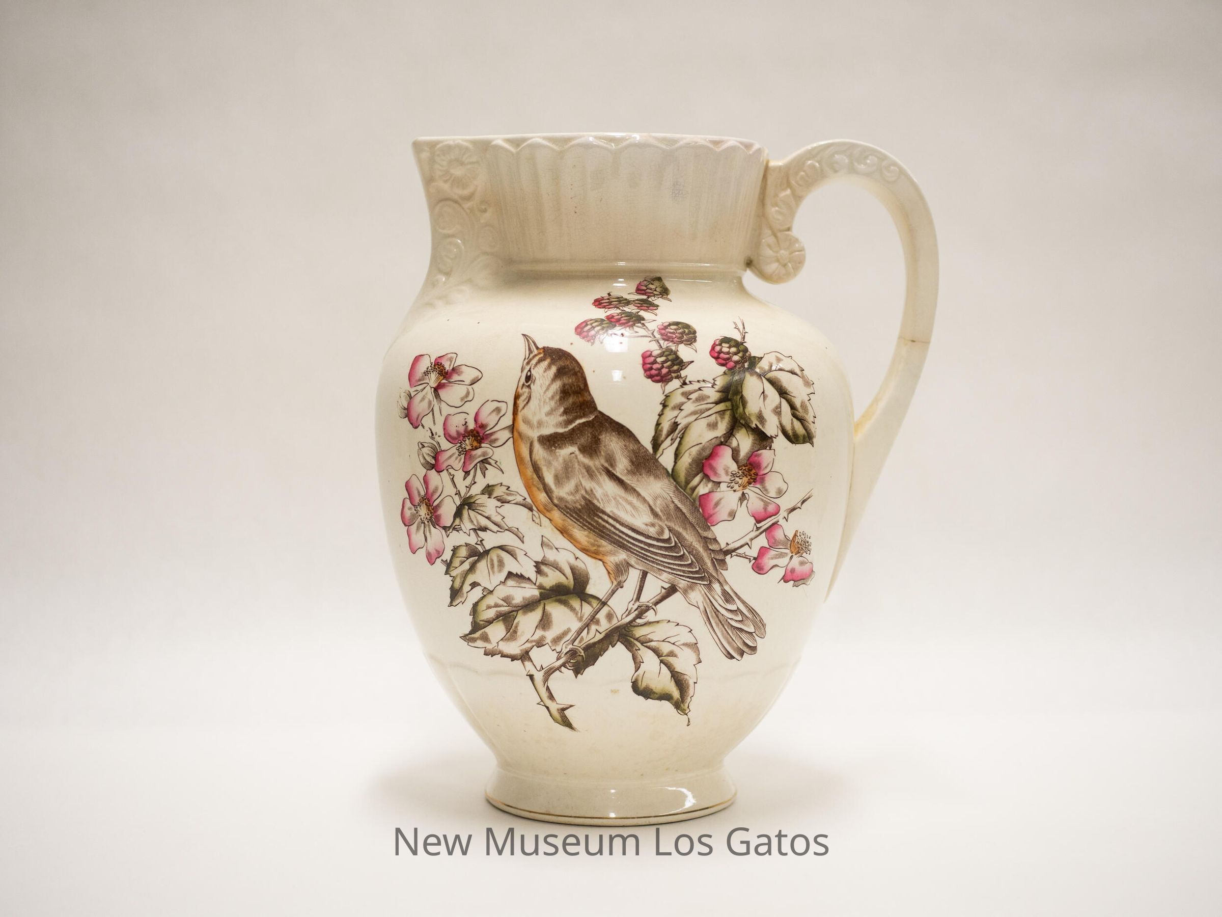 White ceramic water pitcher with a decorative bird, pink berries, and pink flowers on both sides. On one side, the bird is looking upwards, on the other side the bird is crouching and looking down. The bird looks like a robin, and the berries look like raspberries. There is also decorative patterning along the base, along the mouth/spout, and where the handle meets the mouth.Collection