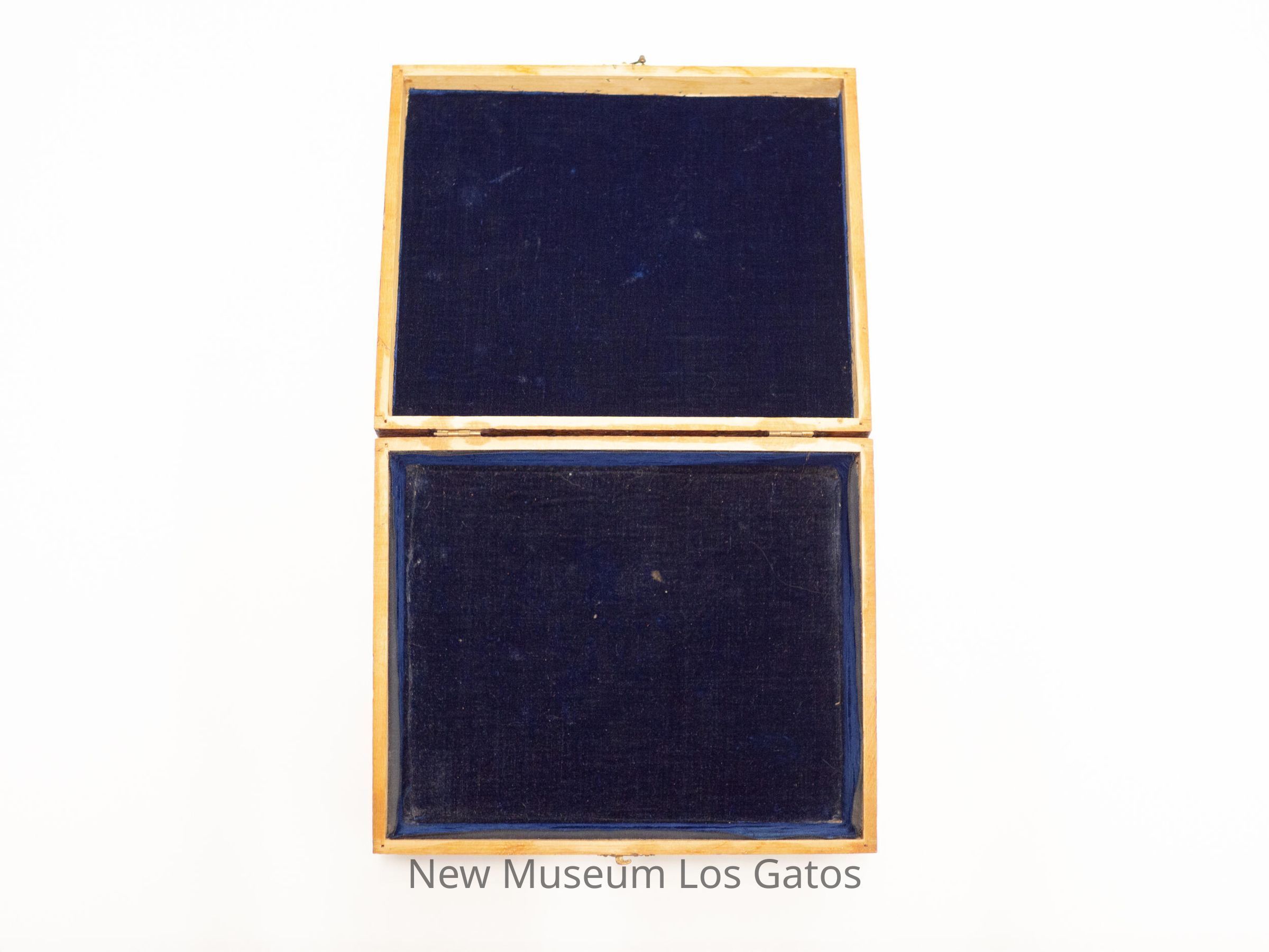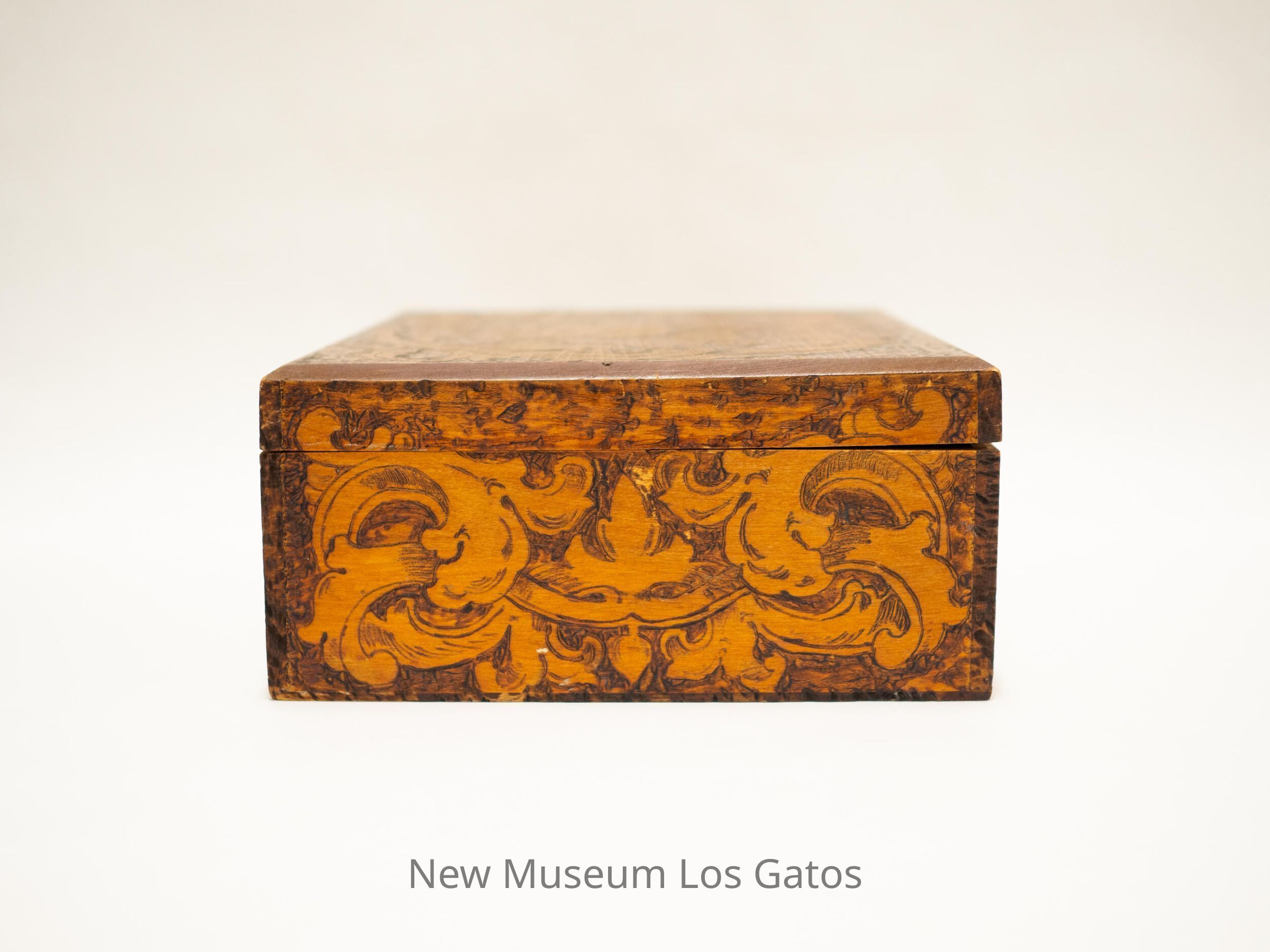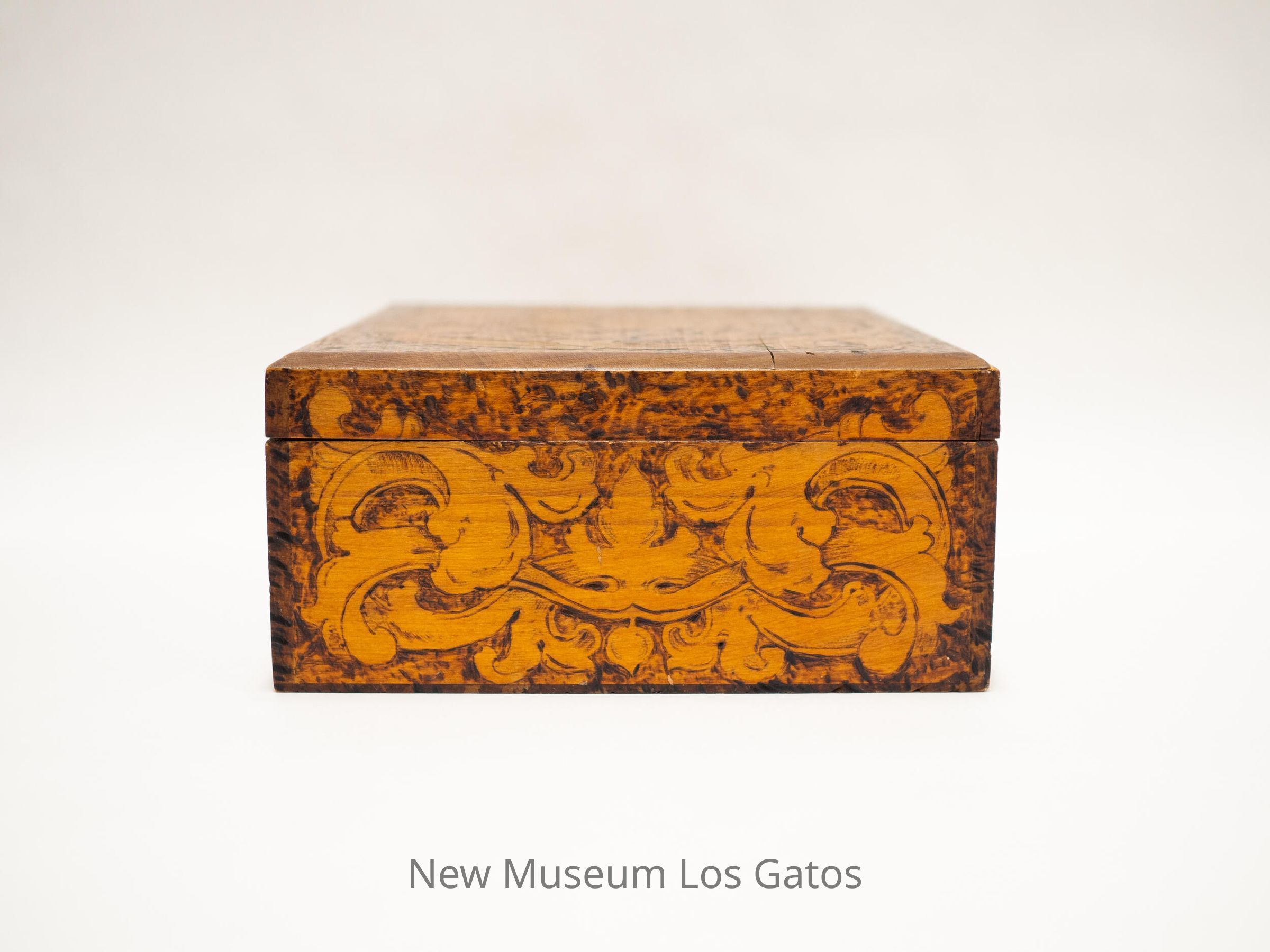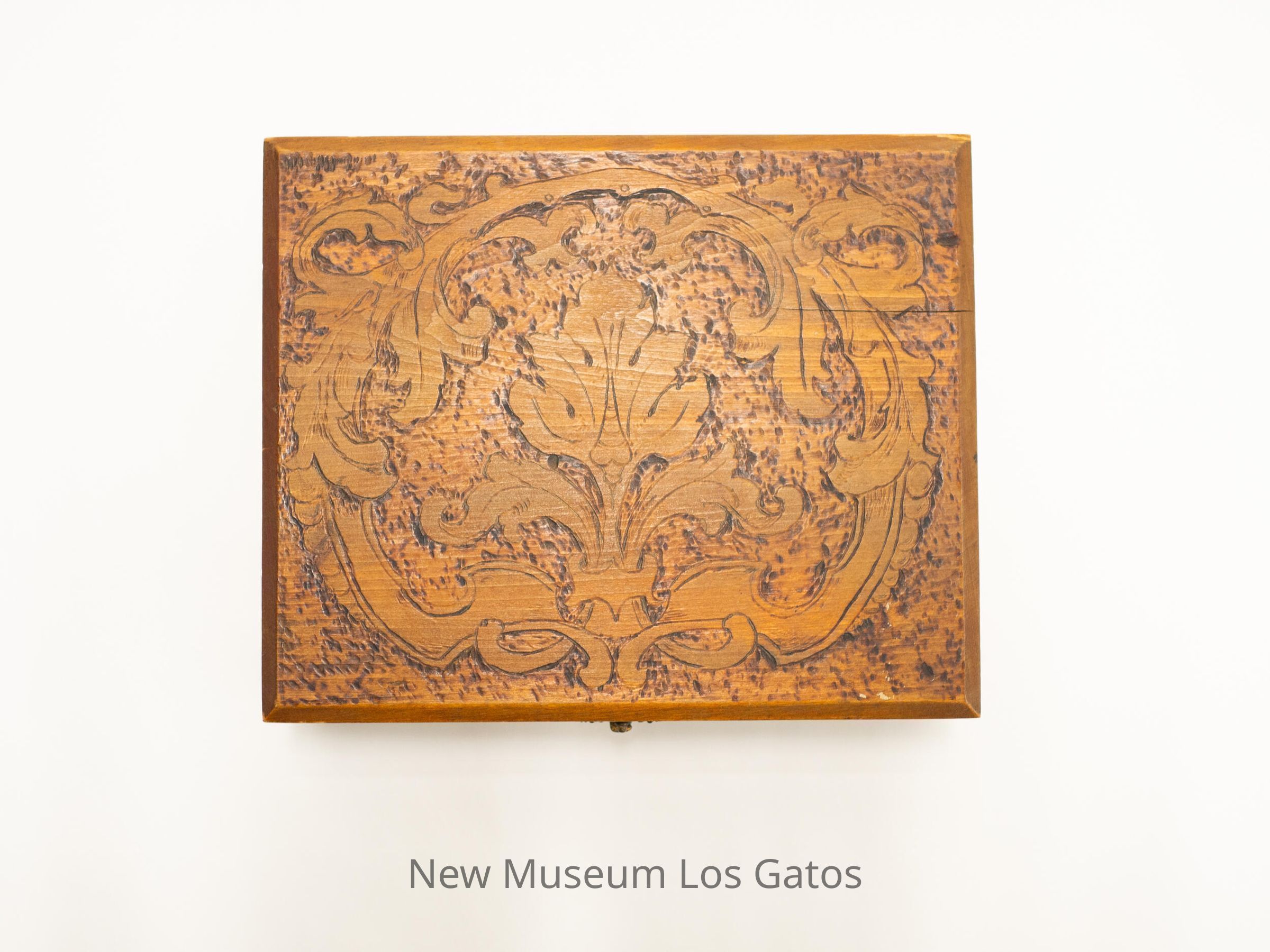 A large, square wooden box, with floral and leaf patterns etched into the lid and the sides. There is also decorative wood burning throughout the box. Inside, the bottom and top are lined with blue velvet.Collection