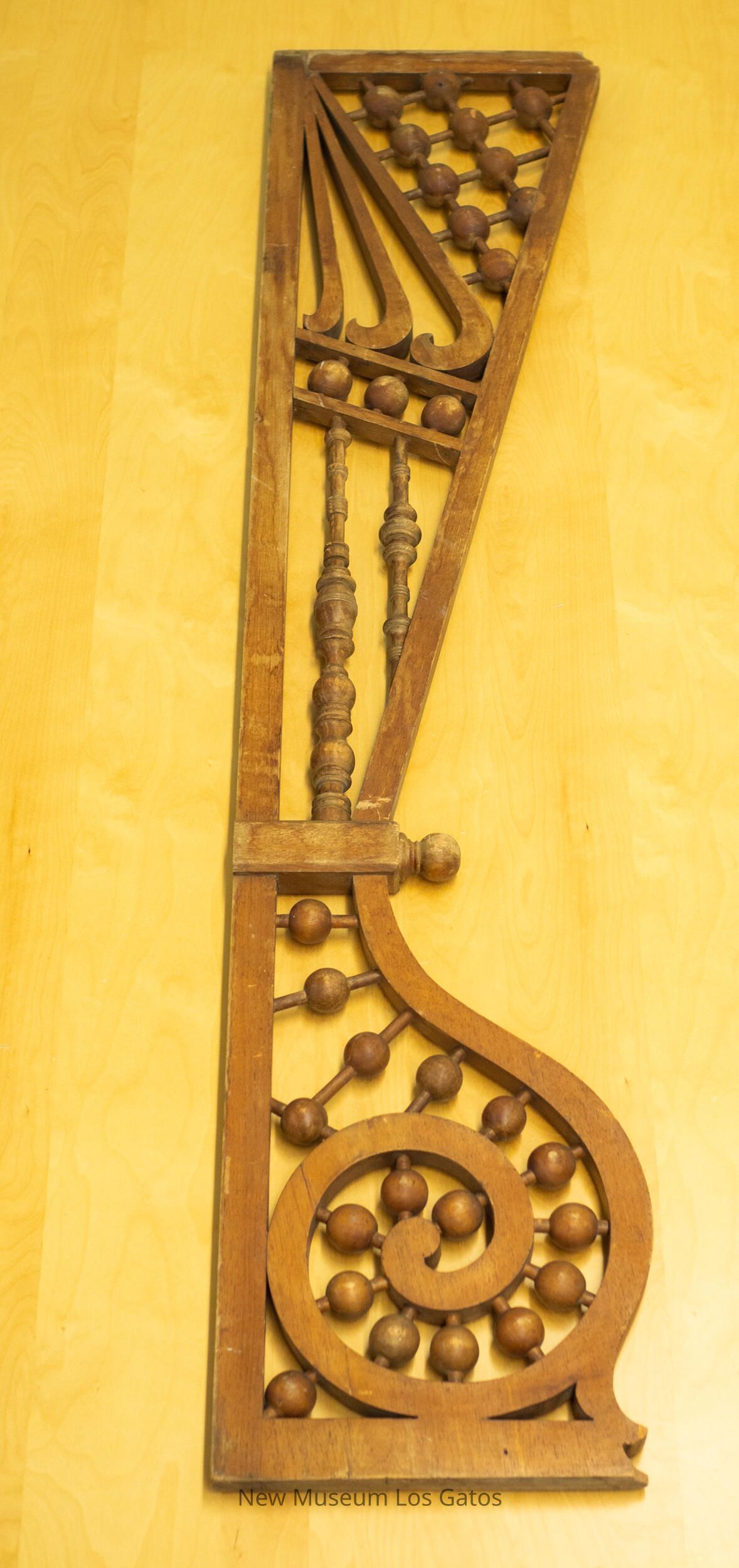 Decorative wooden bracket, with three sections. The top section has three stylistic J-shapes, with rows of wooden balls. The middle section has decorative, vertical wooden columns. The bottom section has a swirled solid wooden piece, with wooden balls following the path of the swirl.Collection