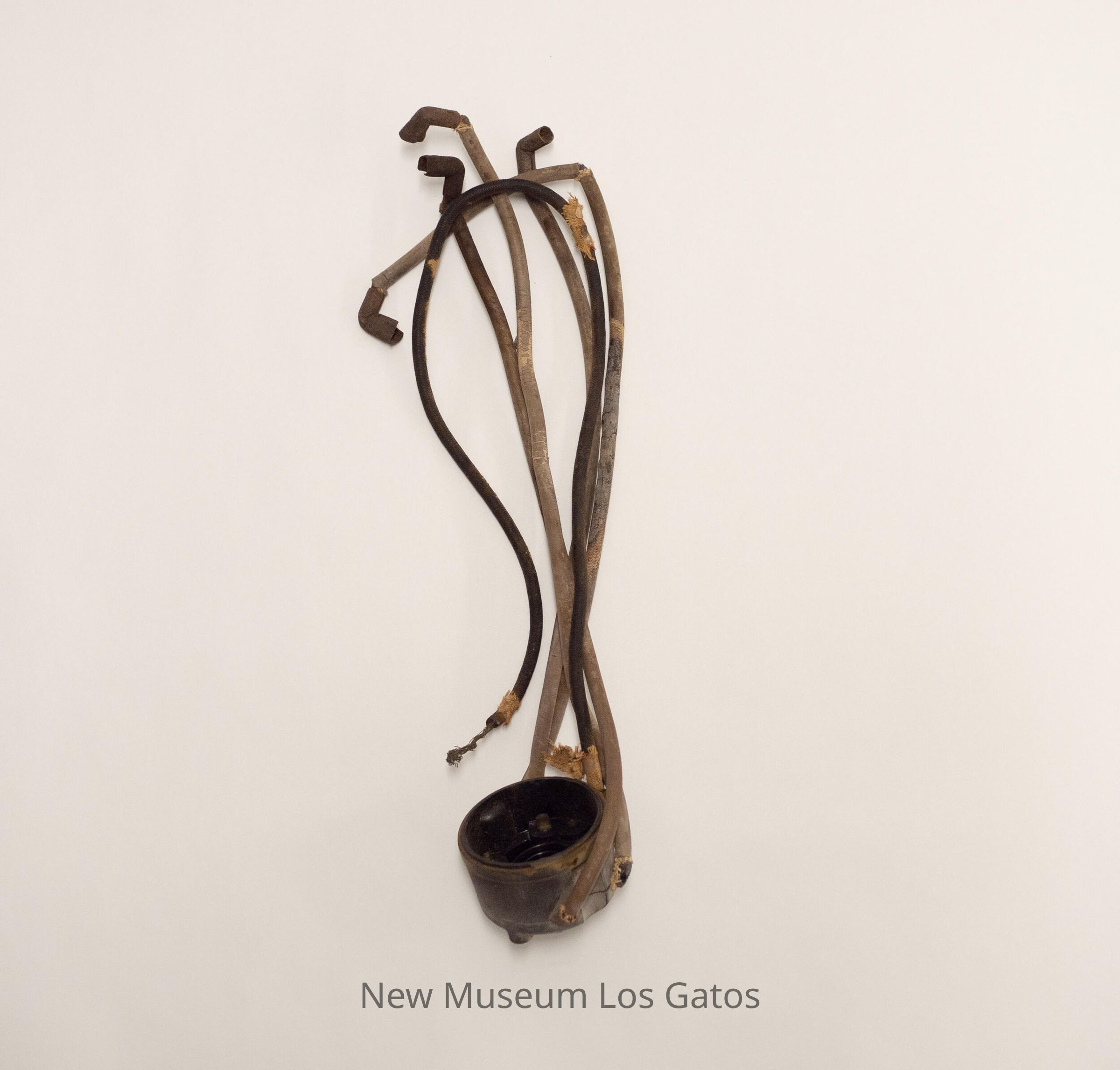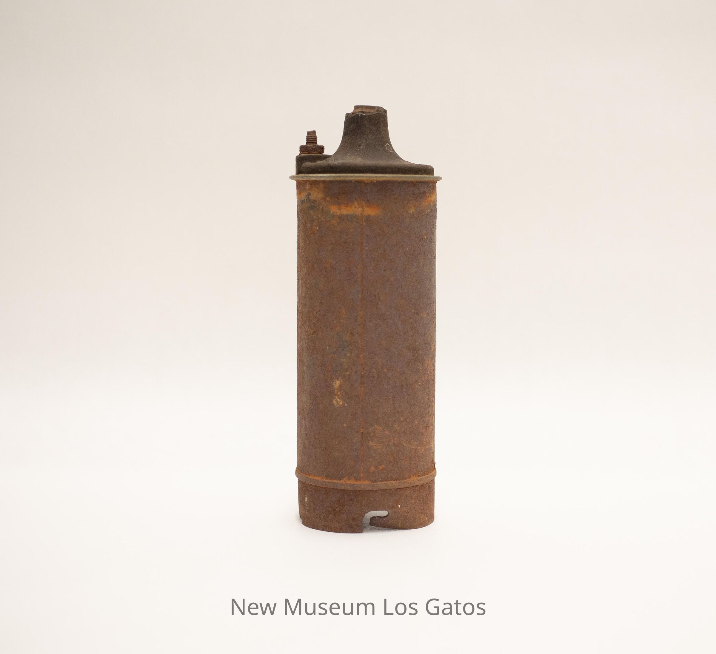 An ignition coil for a bean sprayer, which consists of a small cylindrical piece with a conical top. There is also a distributor cap for a bean sprayer, consisting of a black, circular piece with five attached rubber hoses.Collection
