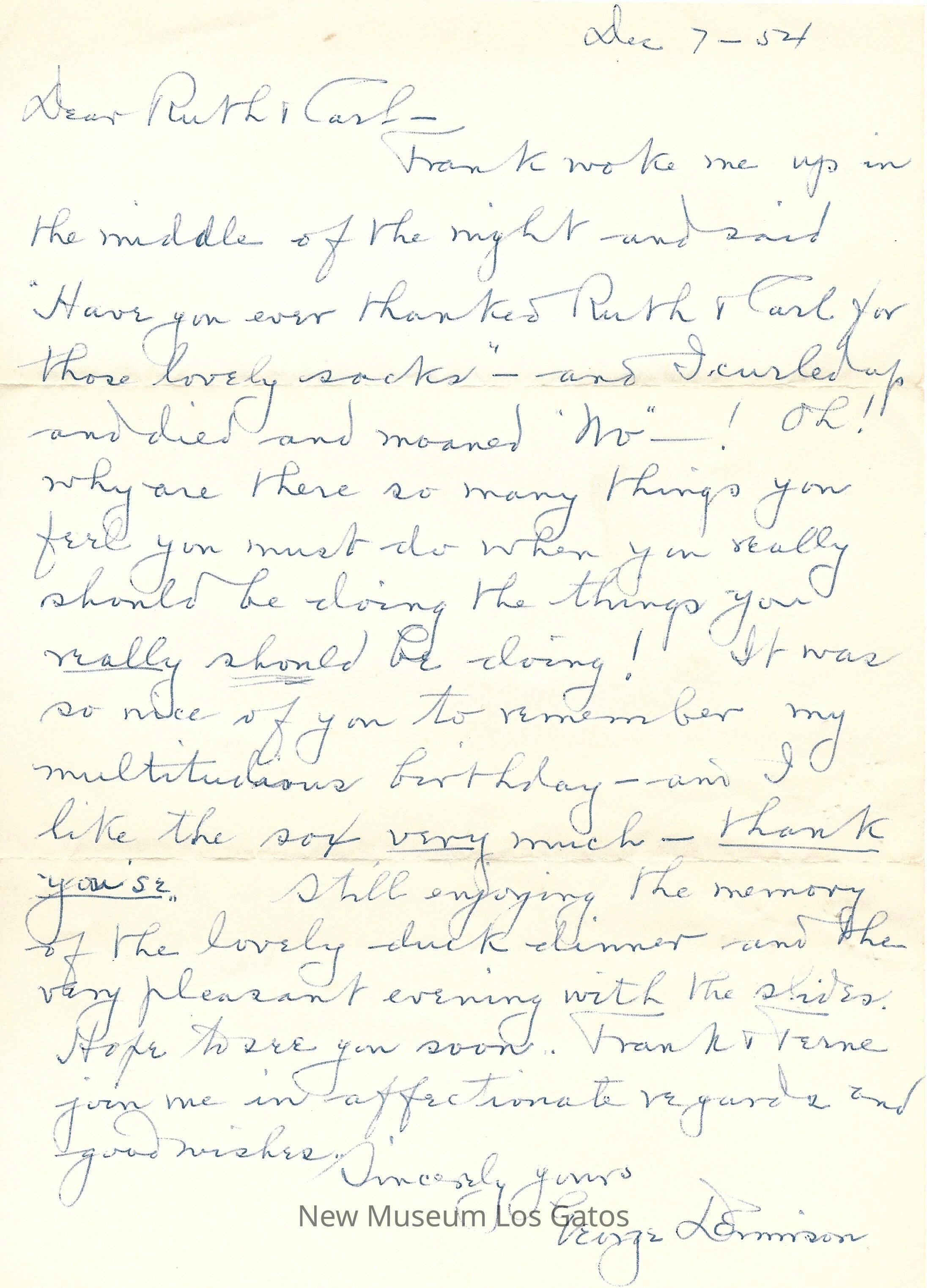 A single page letter from George Dennison to Ruth Carl, thanking her for the sock she gifted him for his birthday.