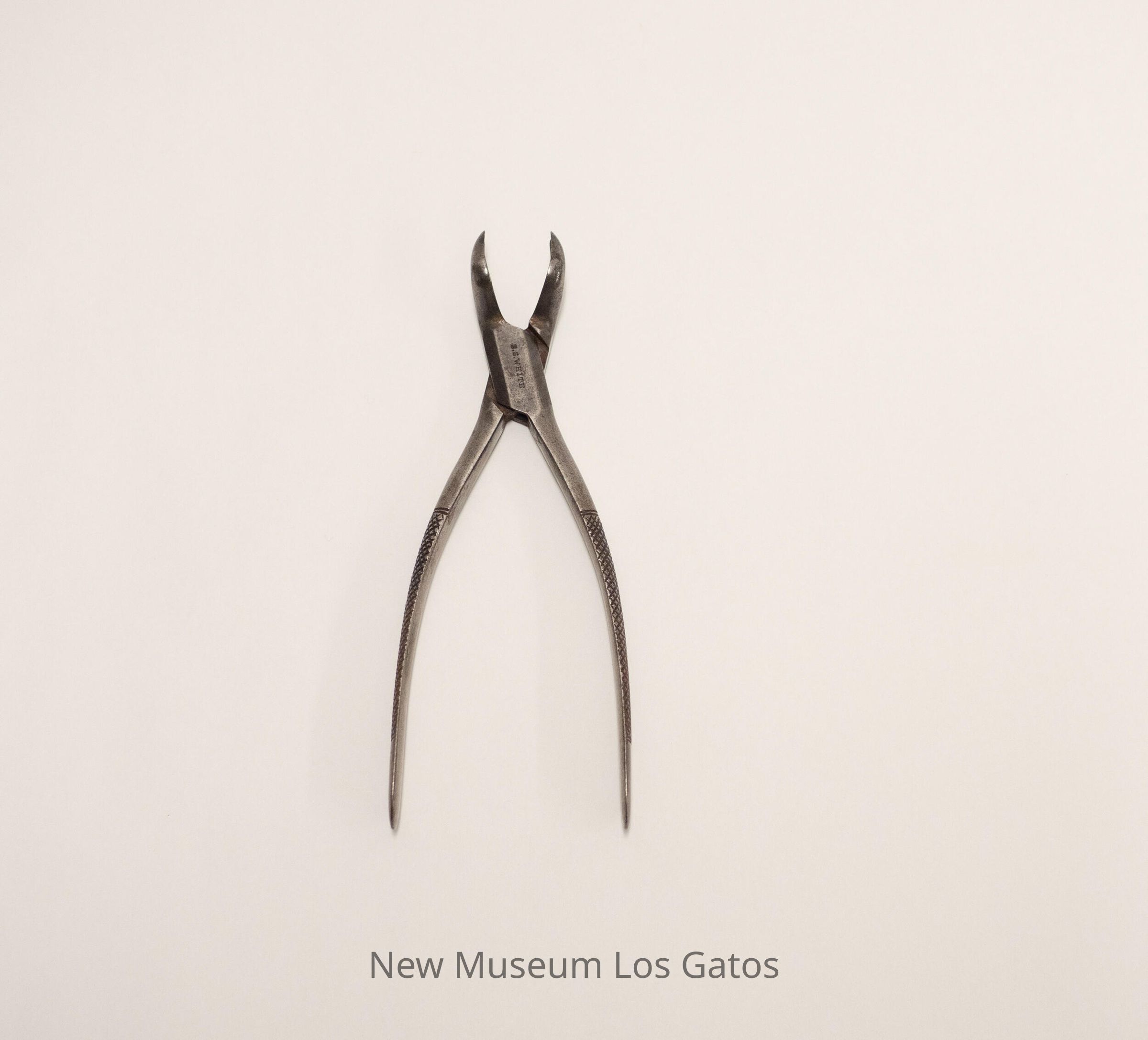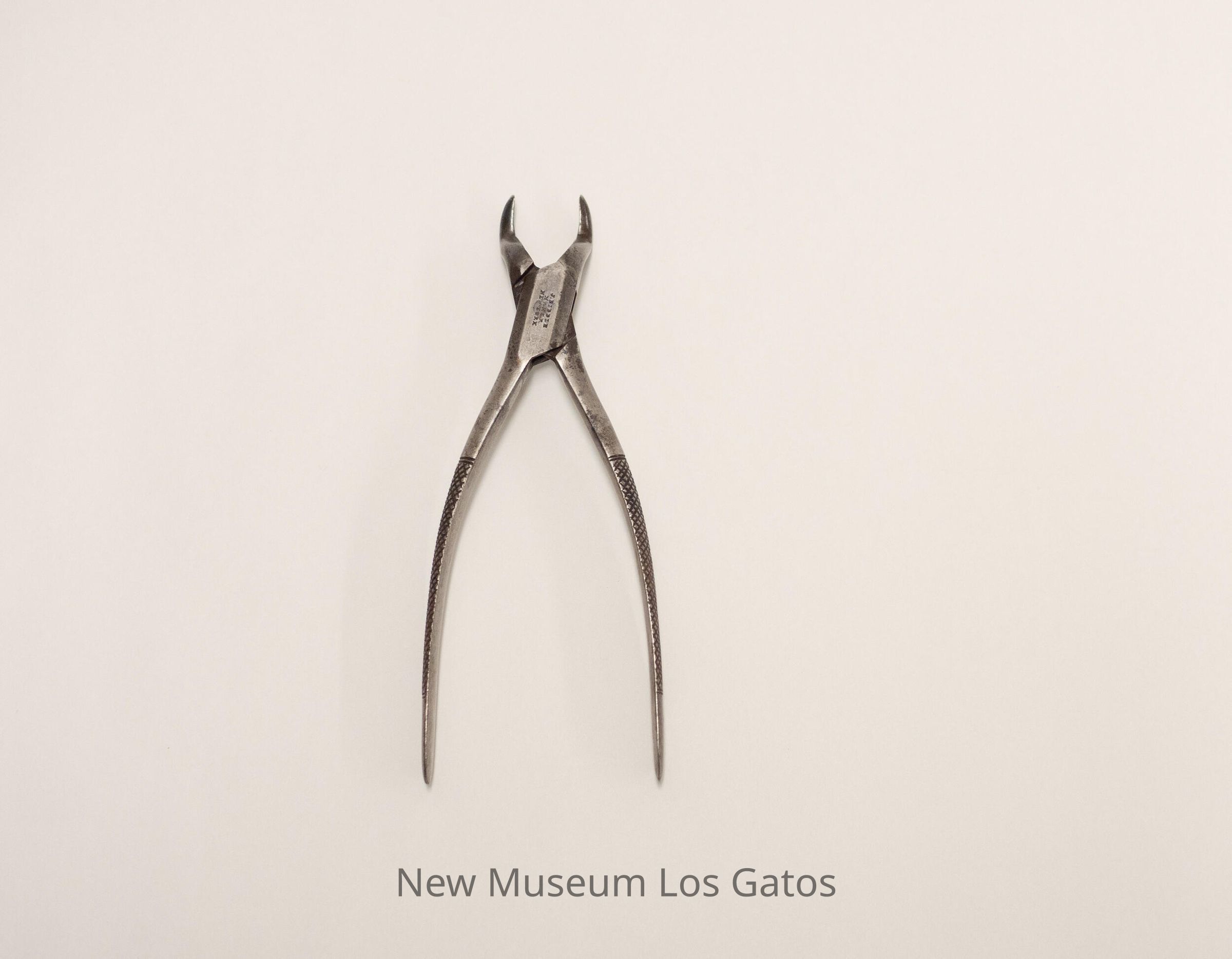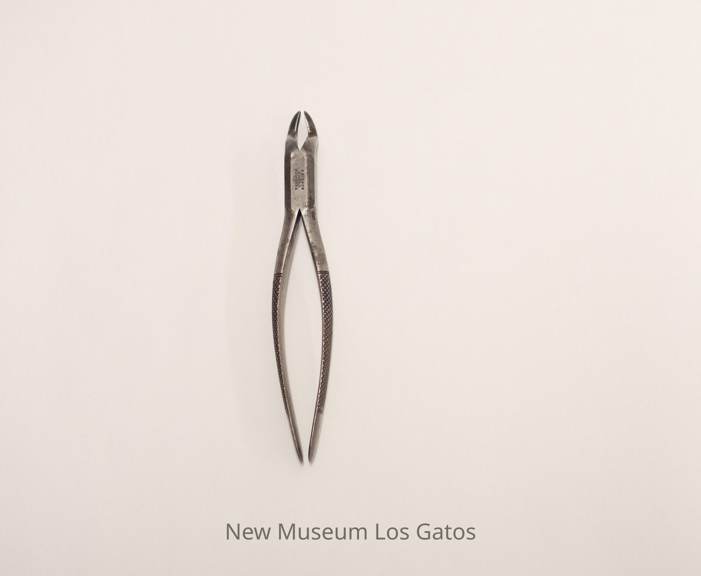 Pair of dental forceps with curved pincers and textured cross-hatching on the handles.