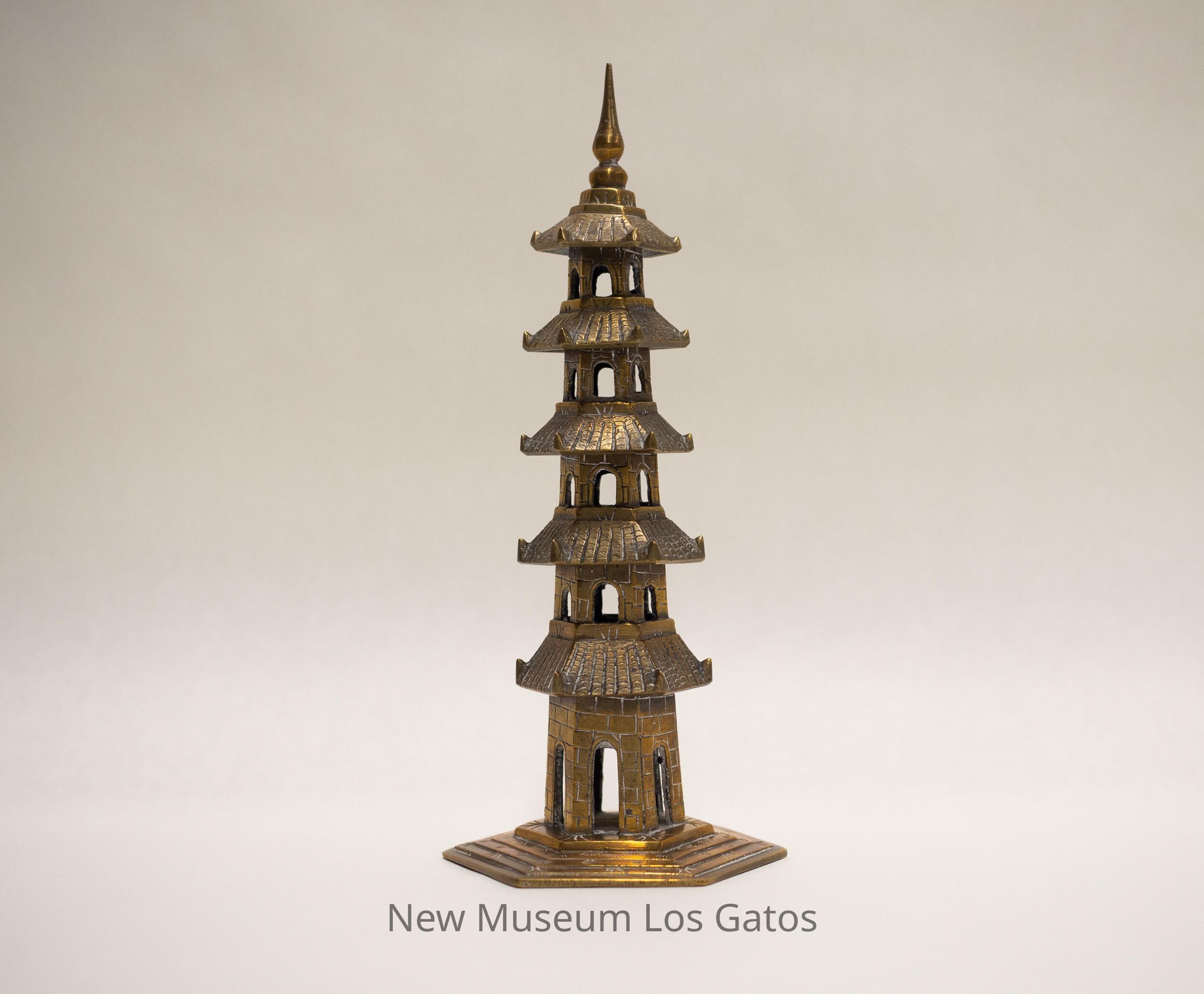Golden pagoda statuette, with intricate brick detailing on the buildings and tile detailing on the roofs. The steps leading up to pagoda have detailing that mimic plants.Collection