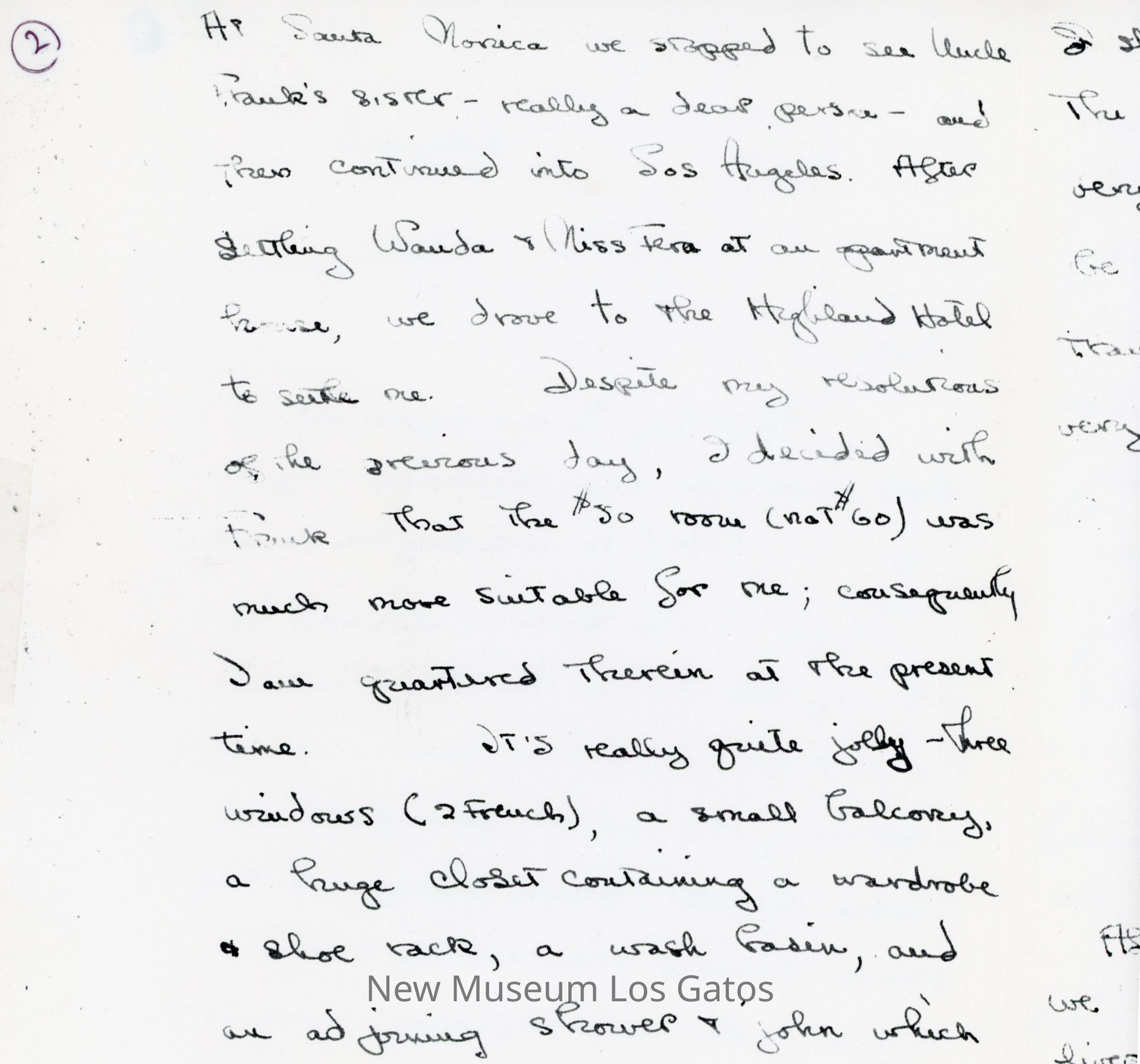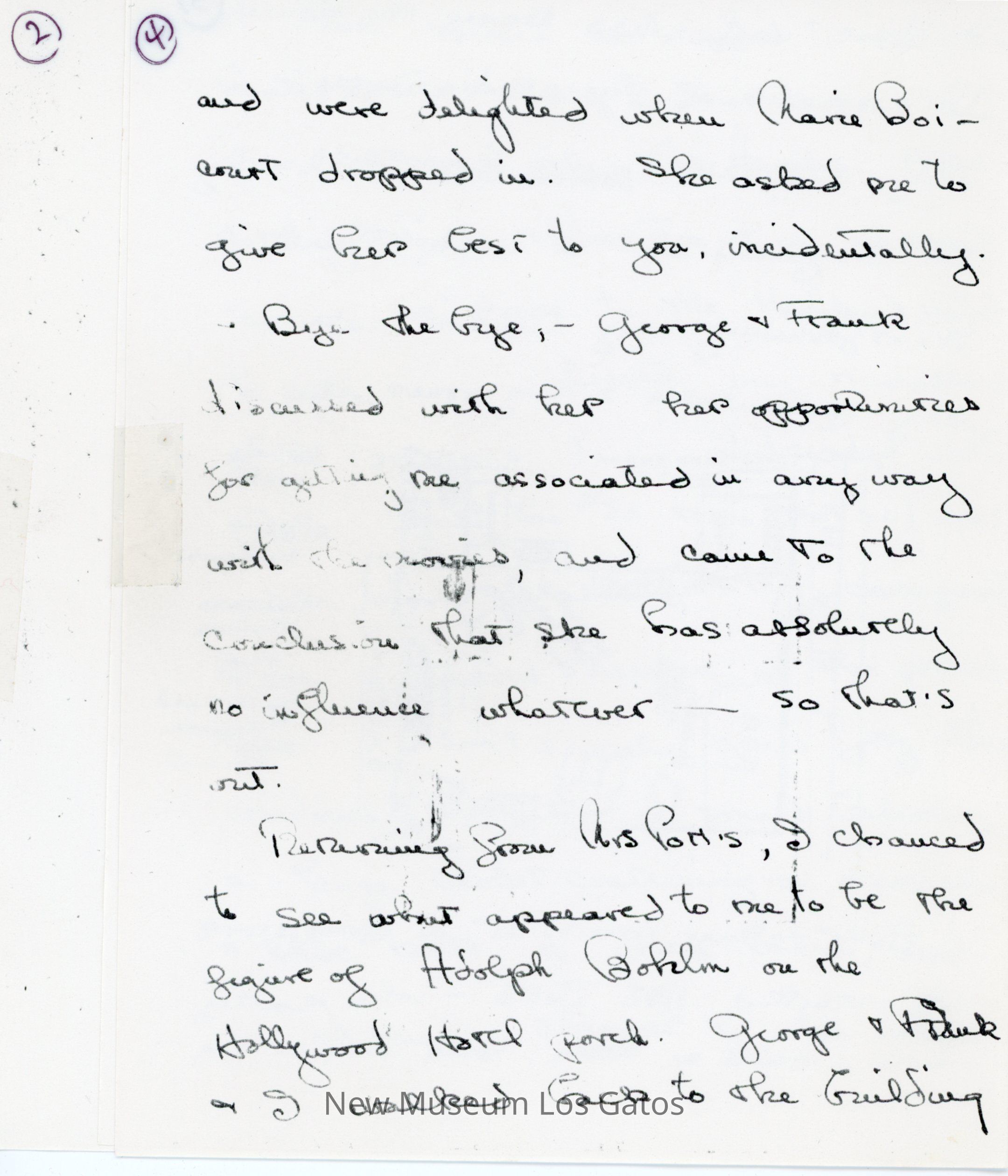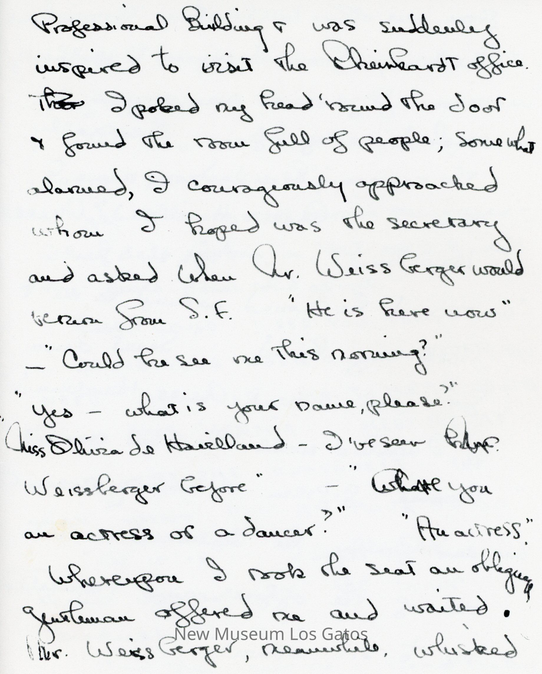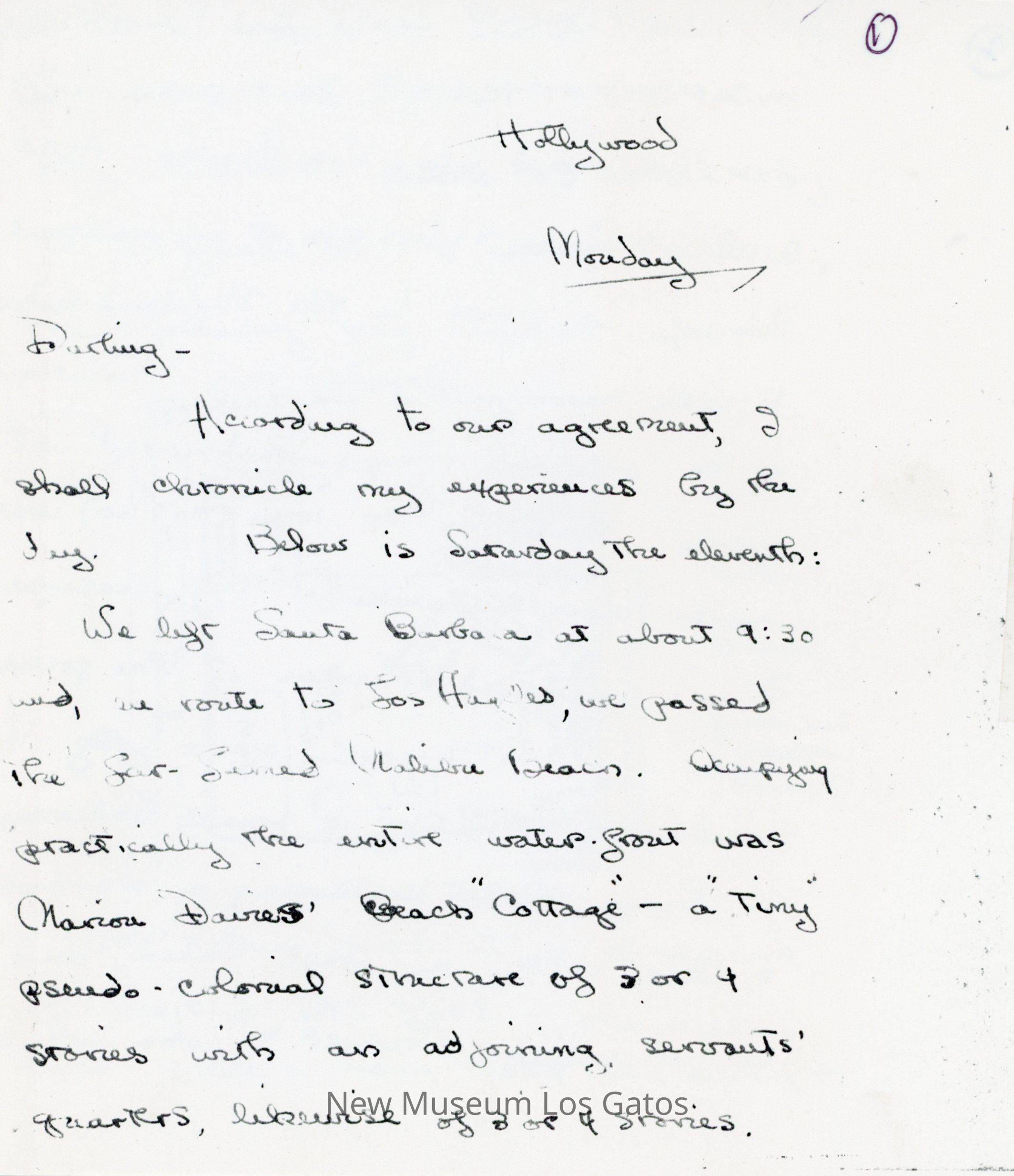 Photocopy of Olivia de Havilland's letter diary to her mother. She discusses her trip down to Hollywood with Frank and George, and meetings she had with studio executives.