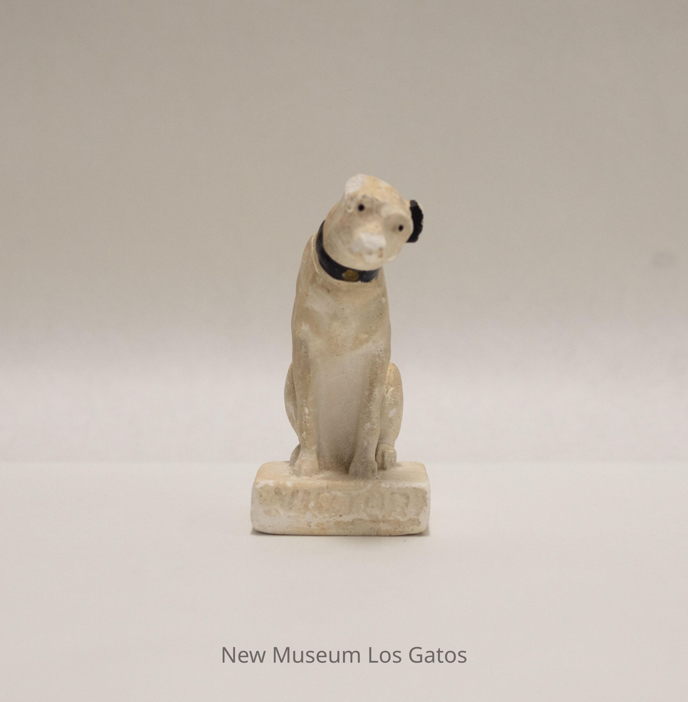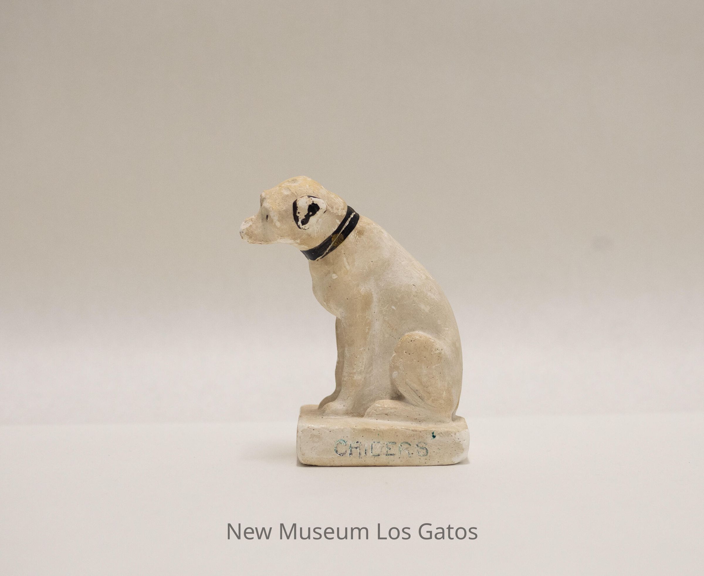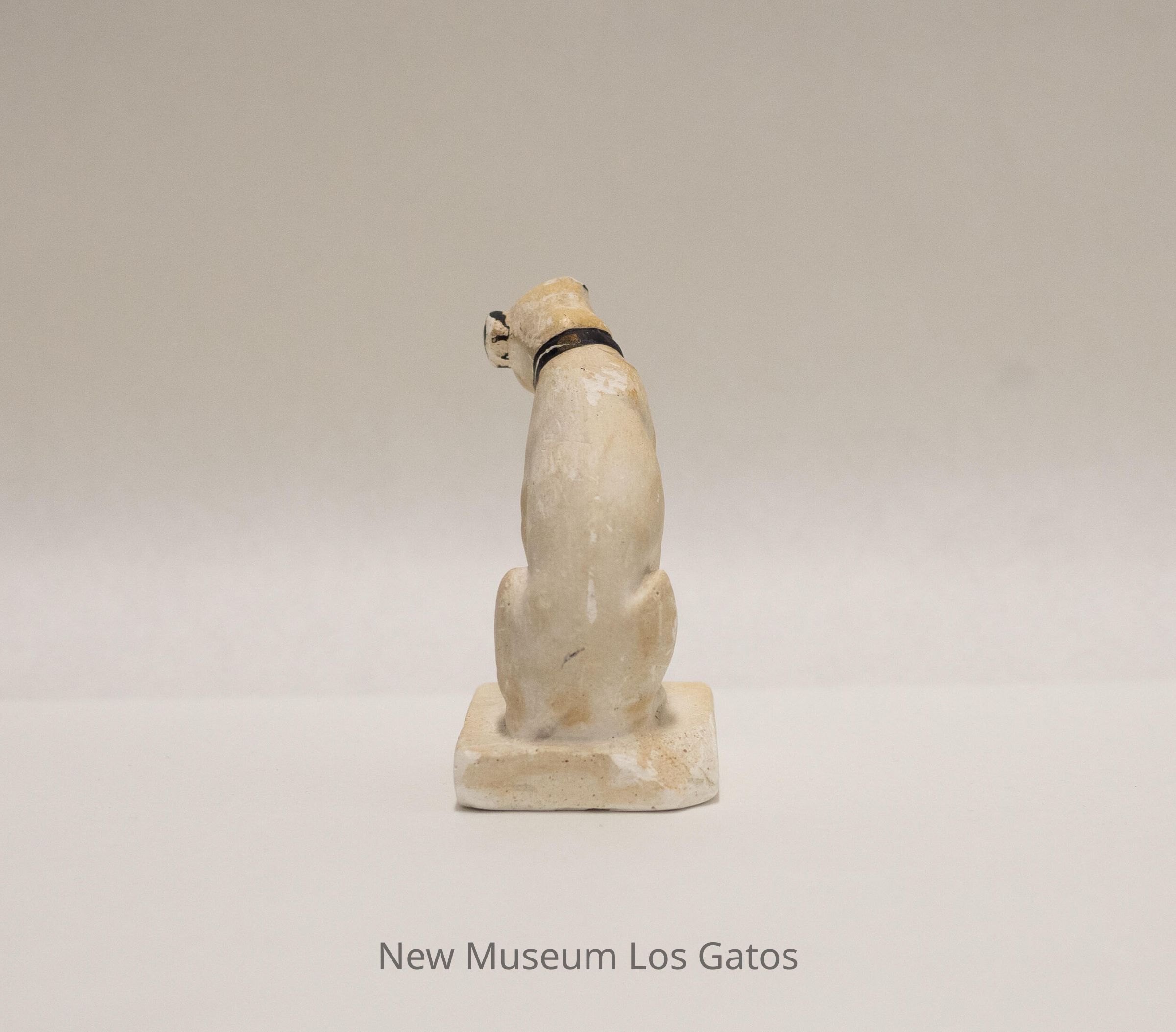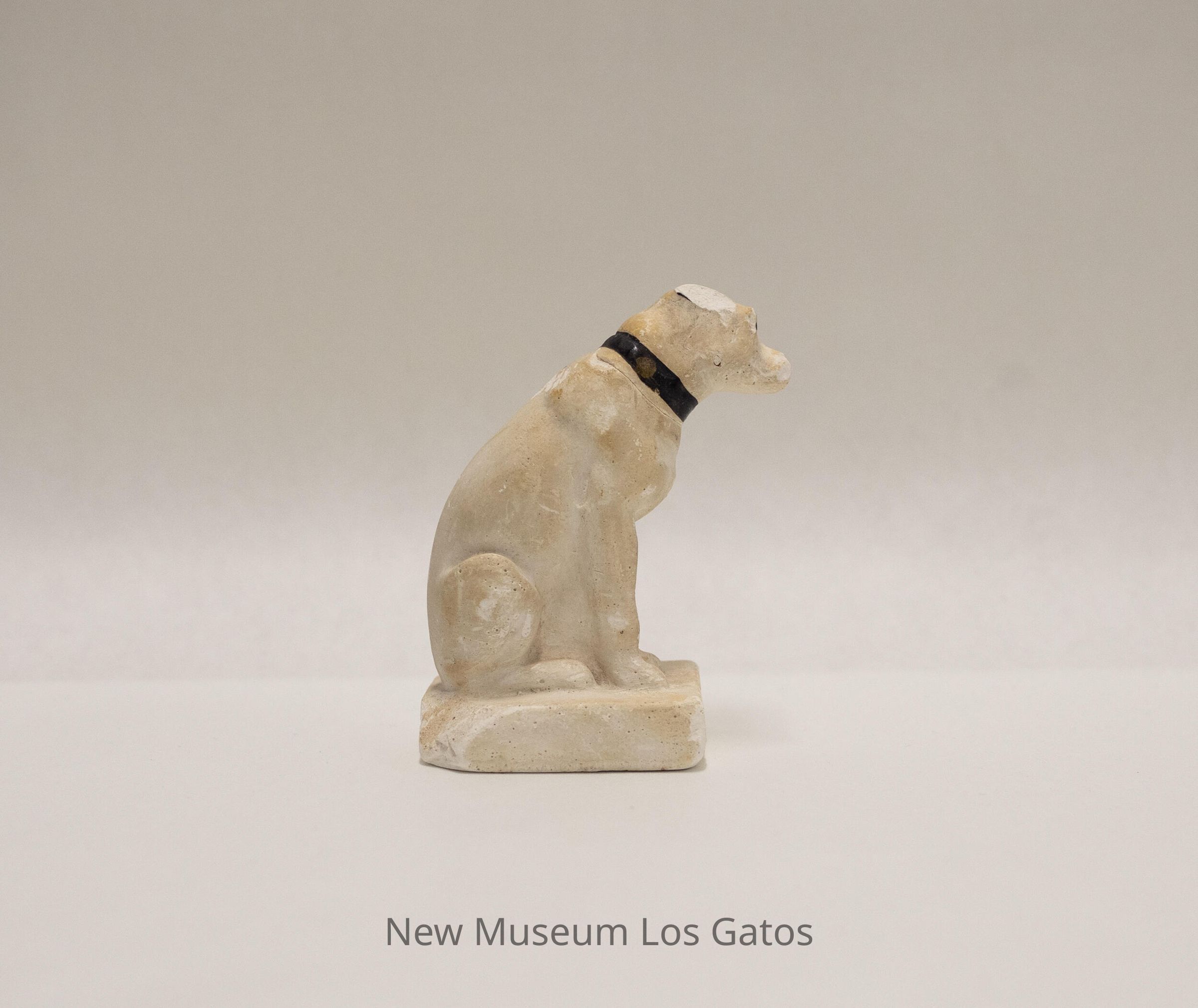 A small dog figurine. The dog is white, with black ears and a black-and-gold collar, and is sitting on a square base.Collection