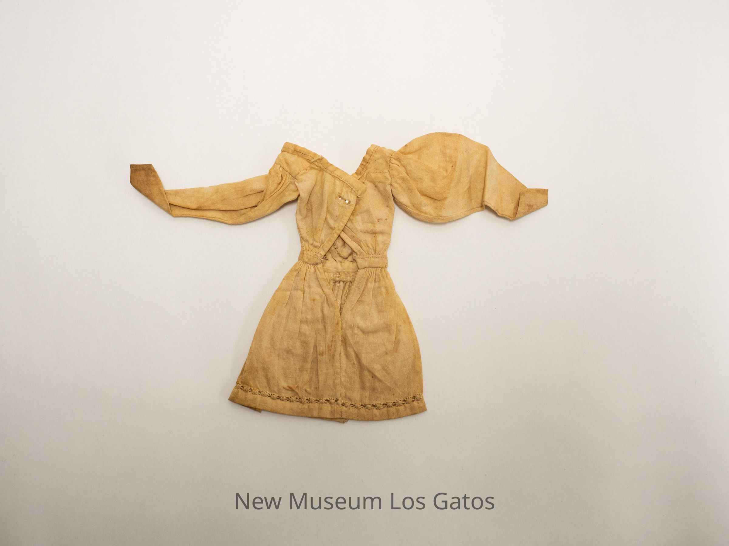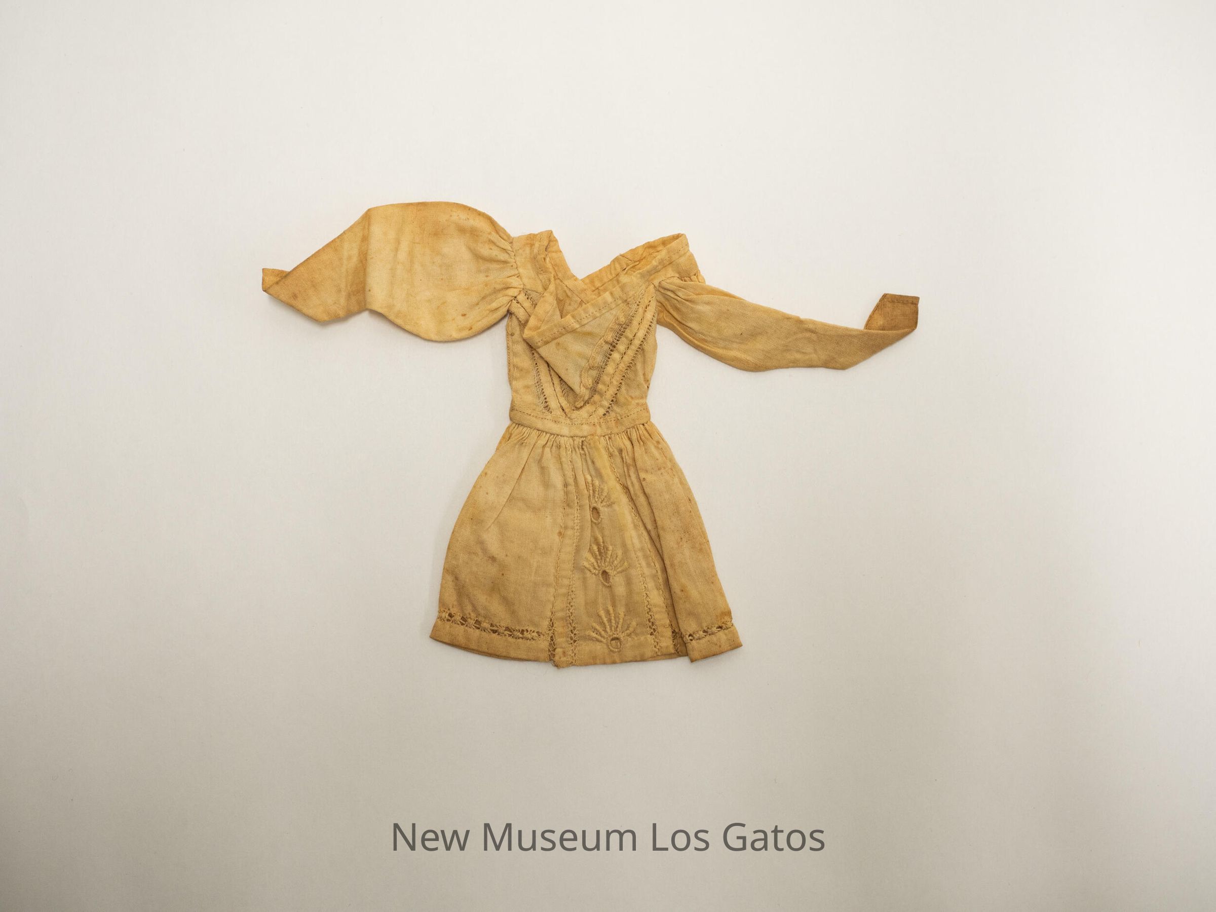 Small doll dress, with handworked details along the trim of the dress, down the center of the skirt, and in a chevron pattern across the chest. There is one small, white button in the back.Collection