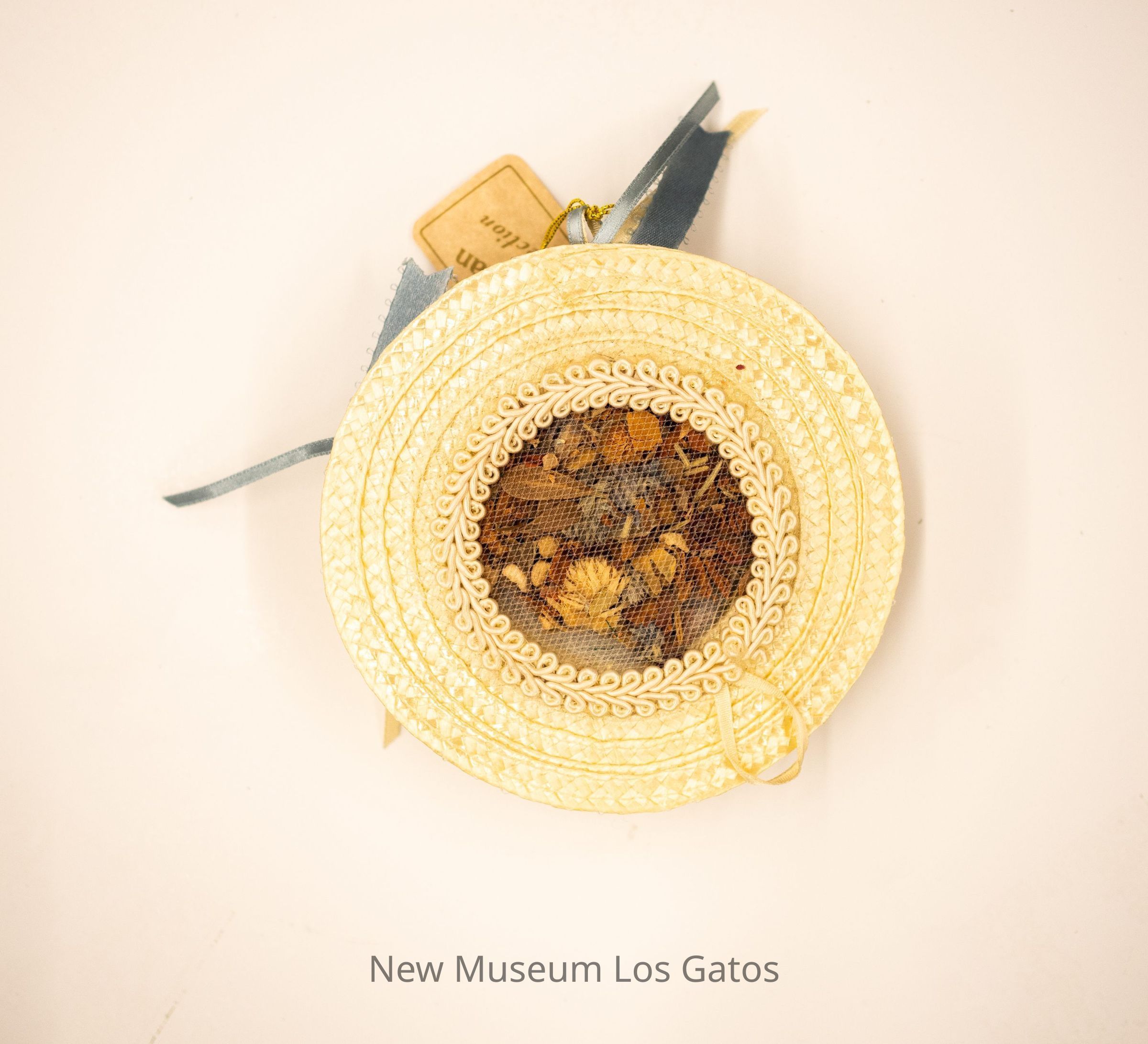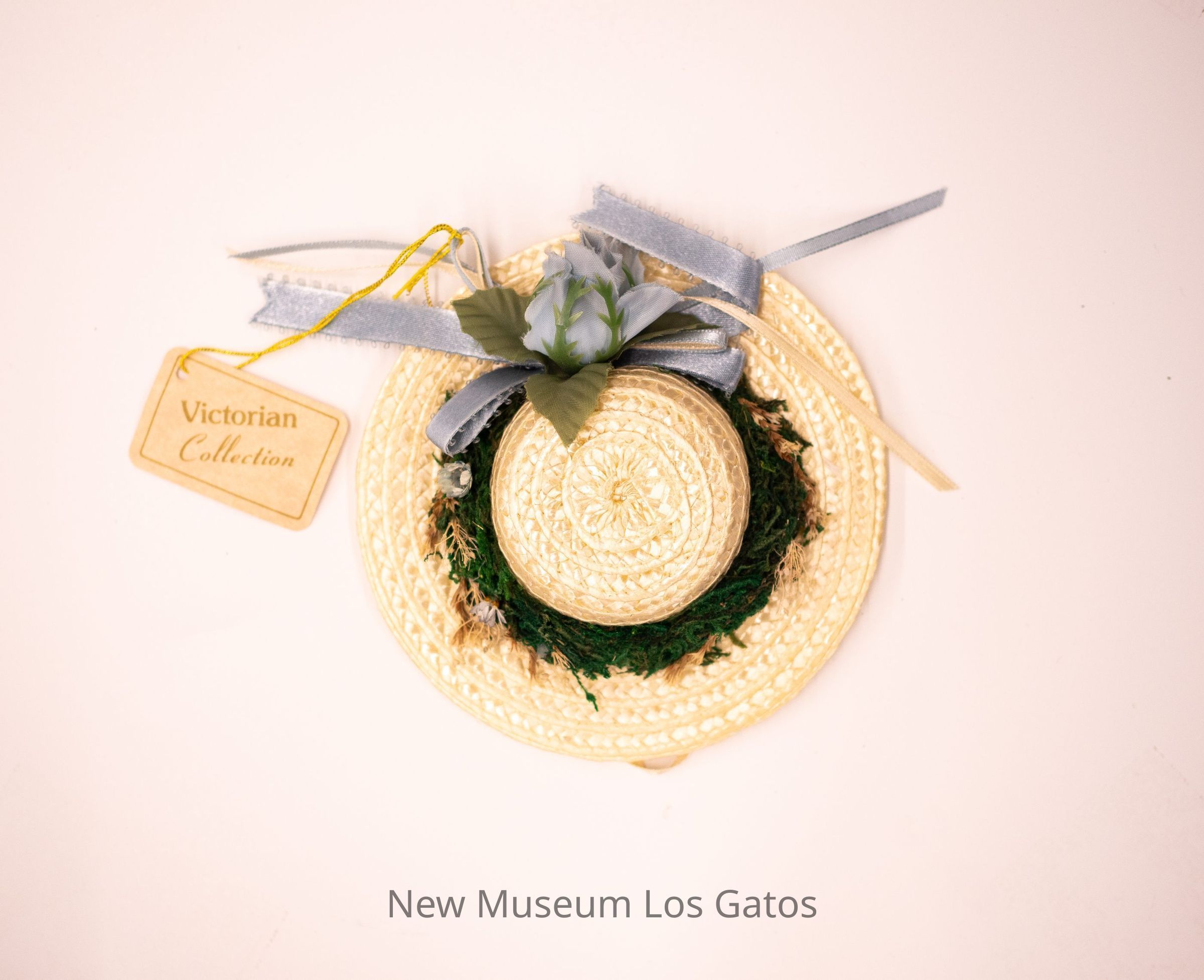 A small straw hat adorned with faux flowers, artificial moss, and ribbons. There is a paper label tag attached to one of the ribbons with gold string. The hat is pale yellow straw, the flowers are blue with green leaves. The bottom of the hat is sealed with a trim of yellow ribbon and mesh, and contains a floral-smelling potpourri.Collection