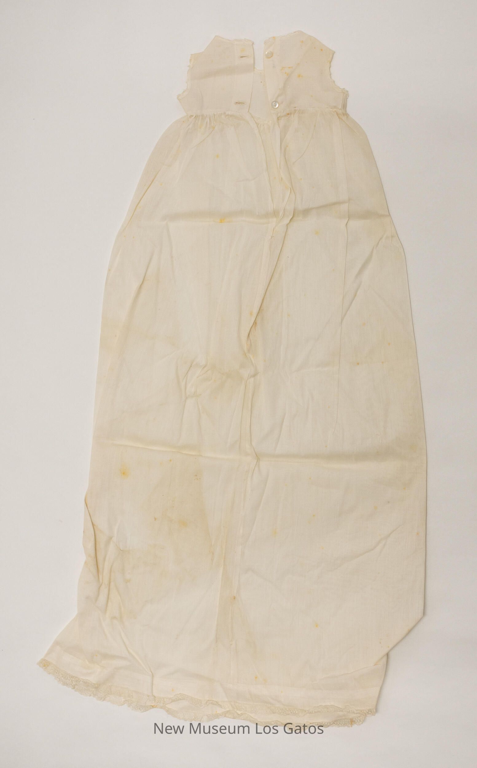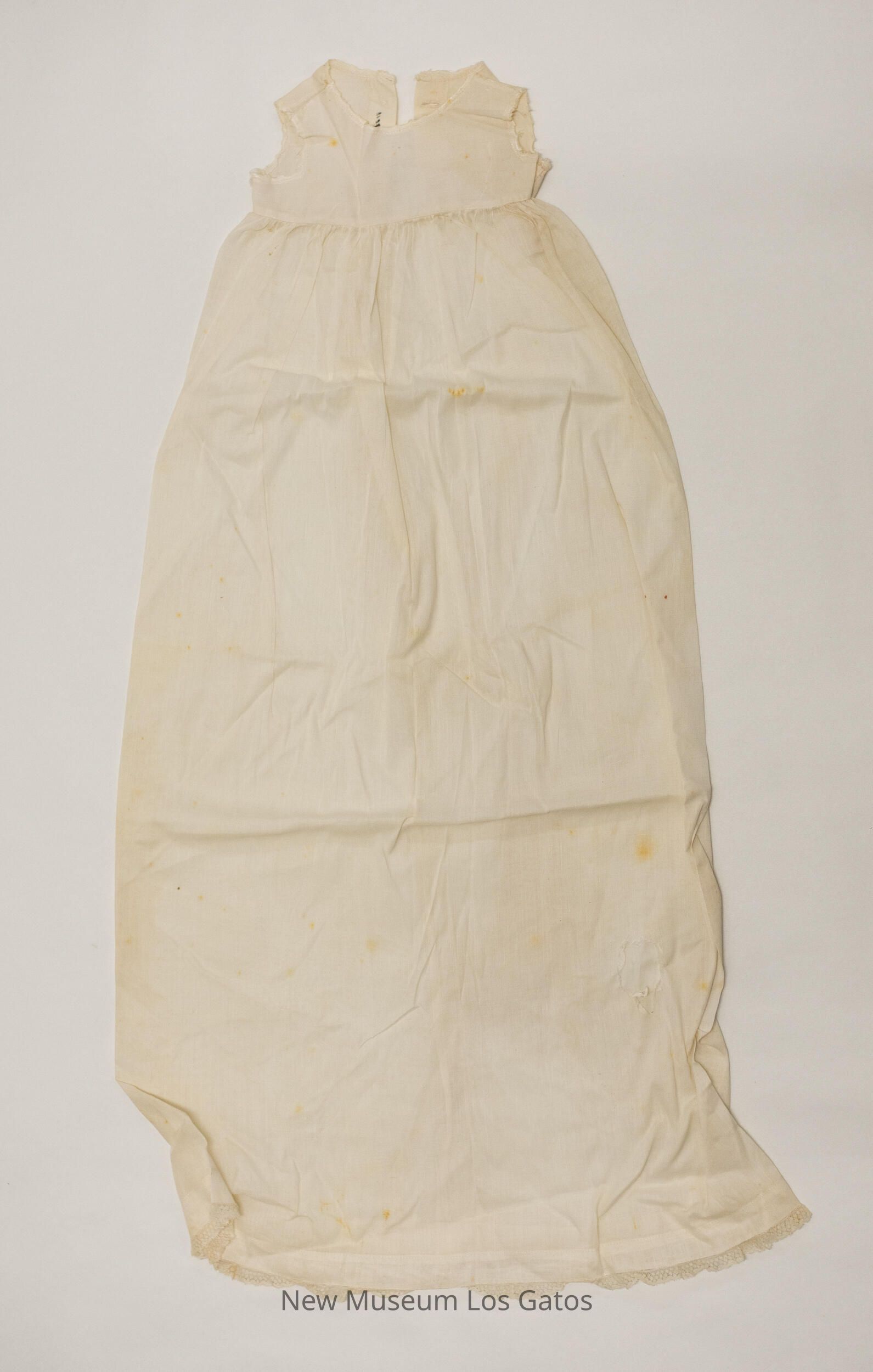 A small, white cotton batiste sleeveless dress, with a very long skirt. There is some lace trim along the hem of the skirt, and embroidered detailing along the edge of the arm holes and the collar. The dress opens at the upper back, and closes with two small, white iridescent buttons.Collection