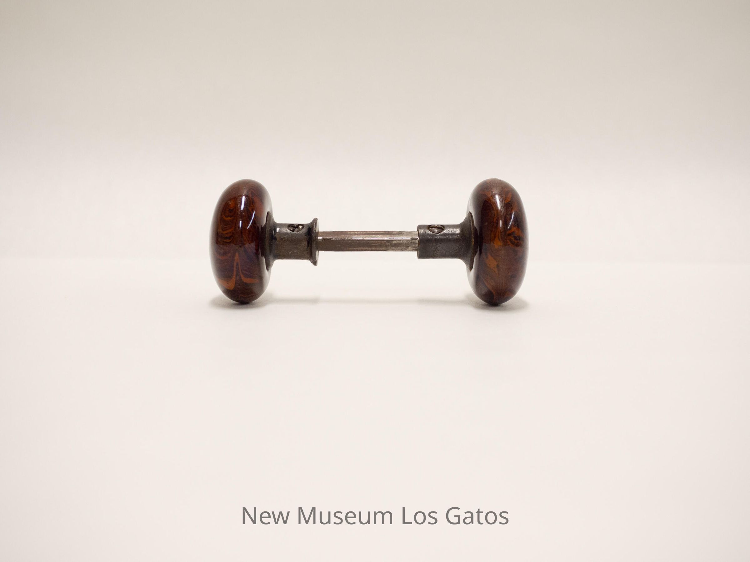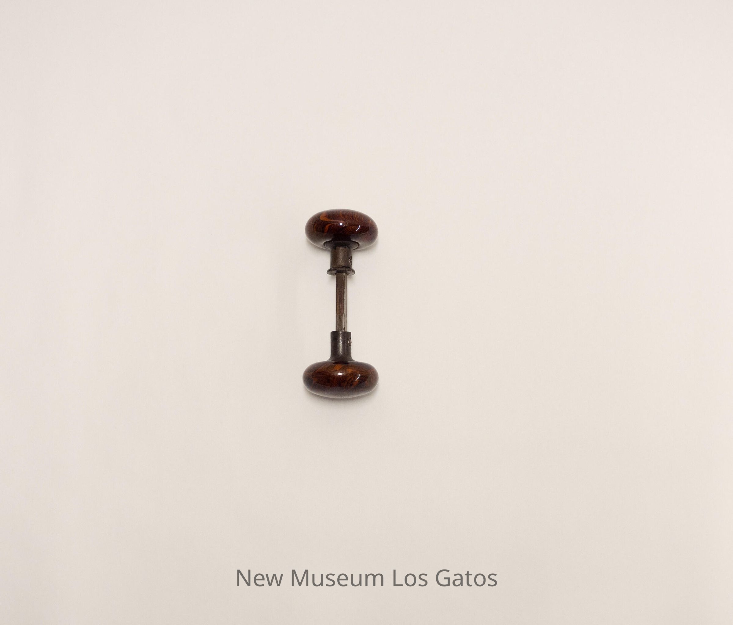 Highly polished wooden door handles, with the metal internal mechanisms connecting the two individual handles.