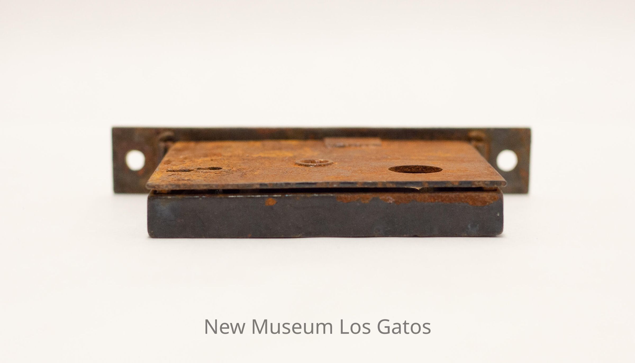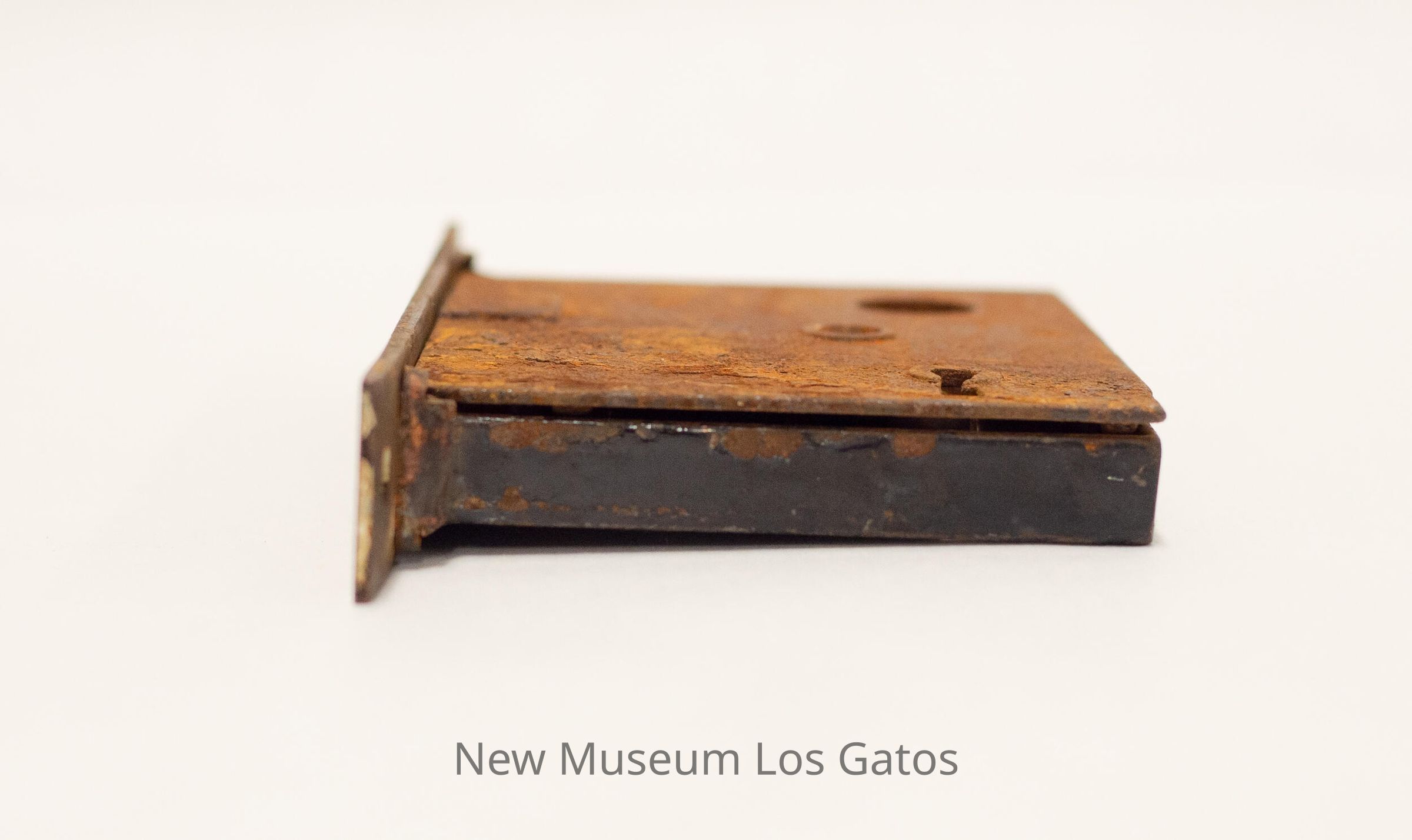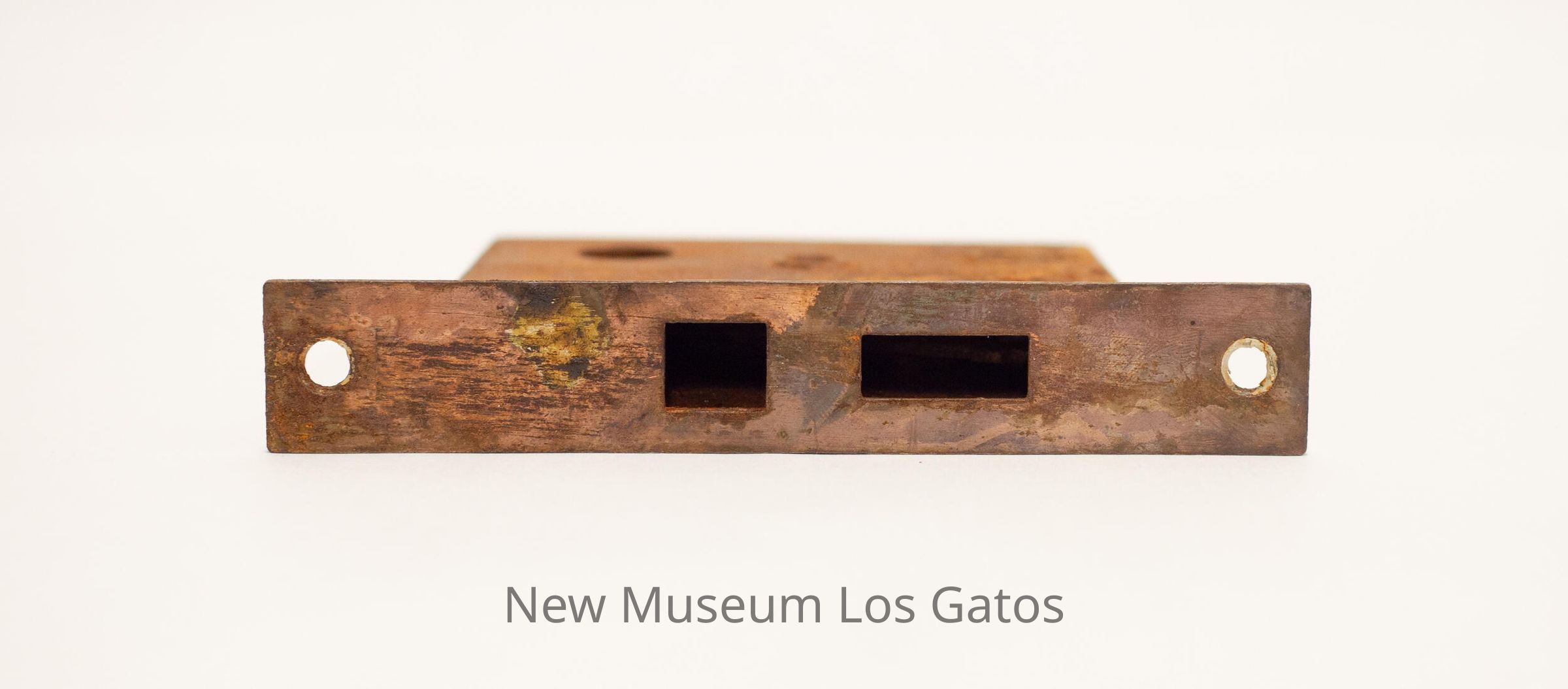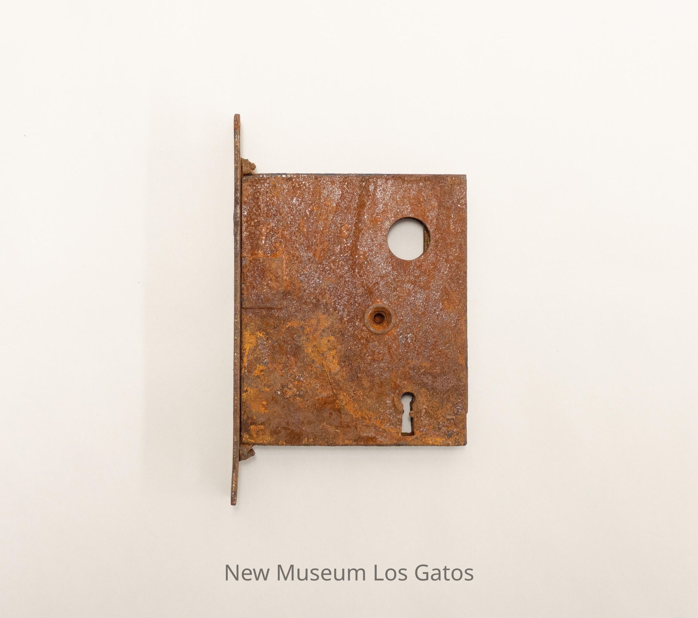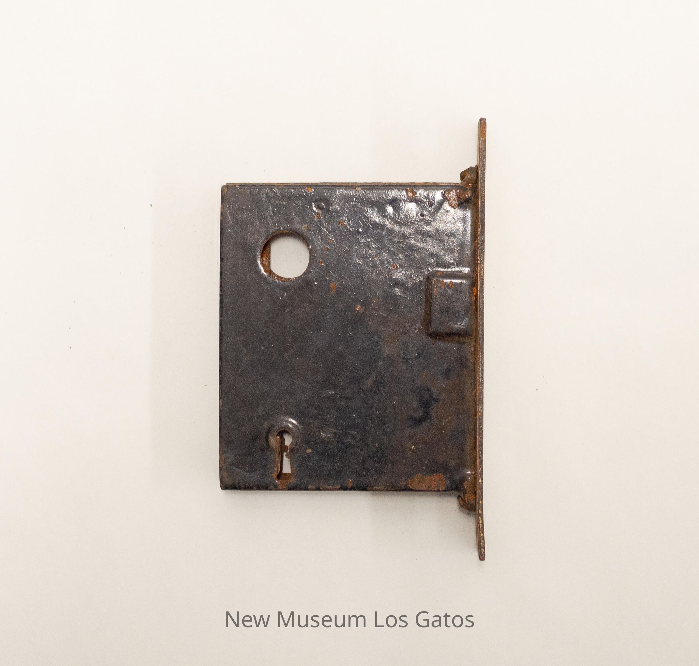A door latch, consisting of a thin, square mechanism with a longer, thin metal rectangle attached to one side. The thin metal rectangle has a rectangular hole and a square hole in the center, with two circular holes at each end. The square mechanism has a circular hole through it towards the top and a keyhole hole through it towards the bottom, and opens to reveal two small metal pieces inside.Collection