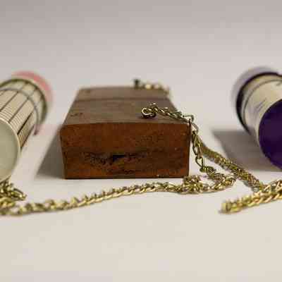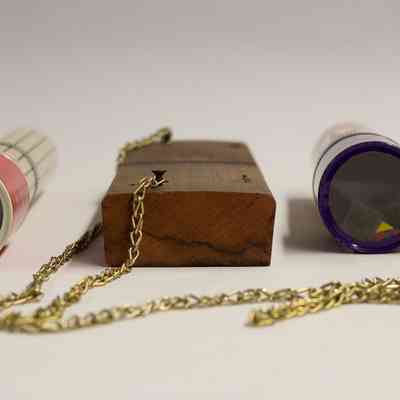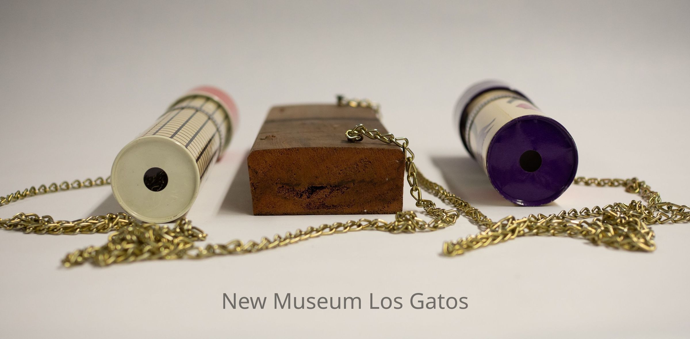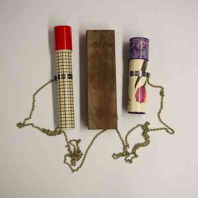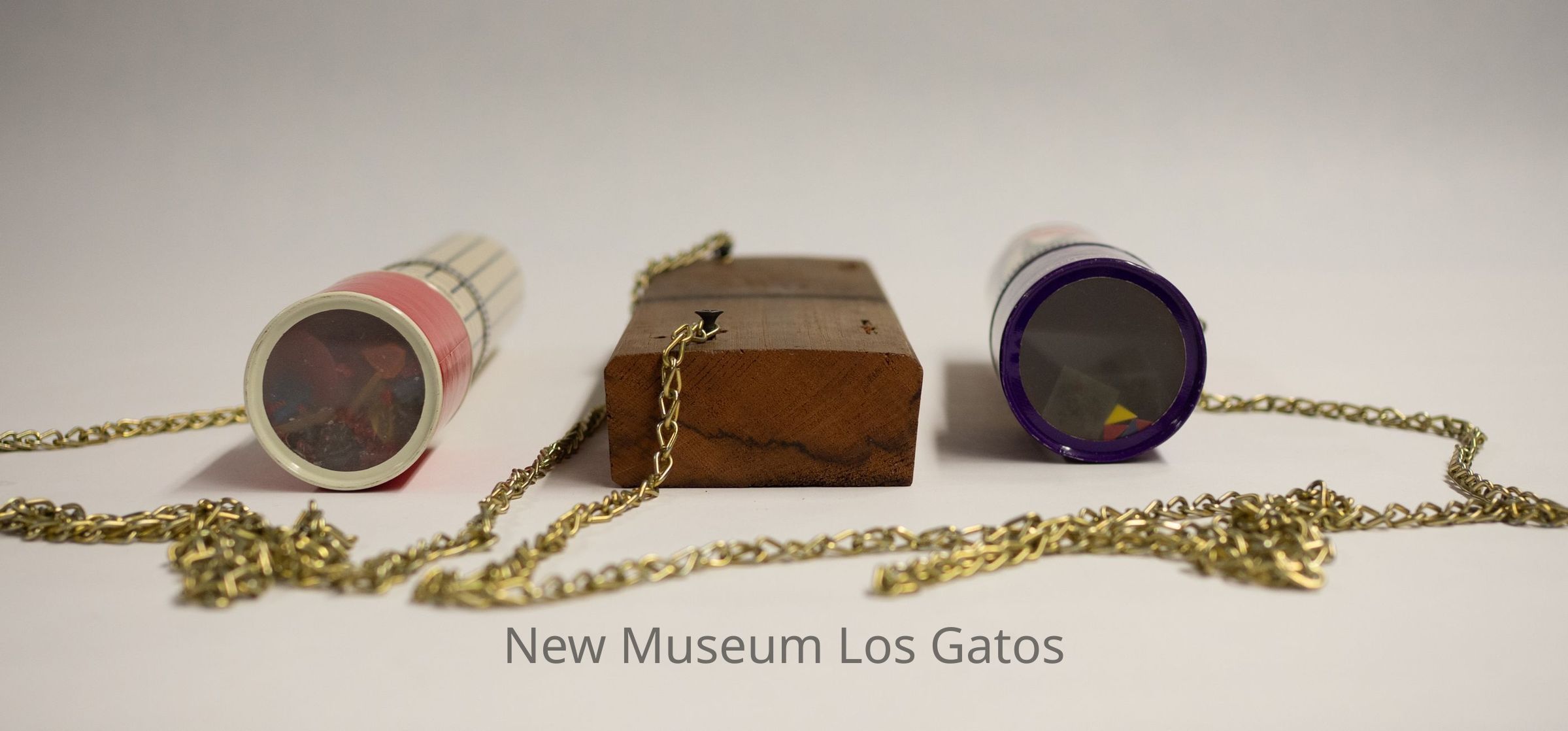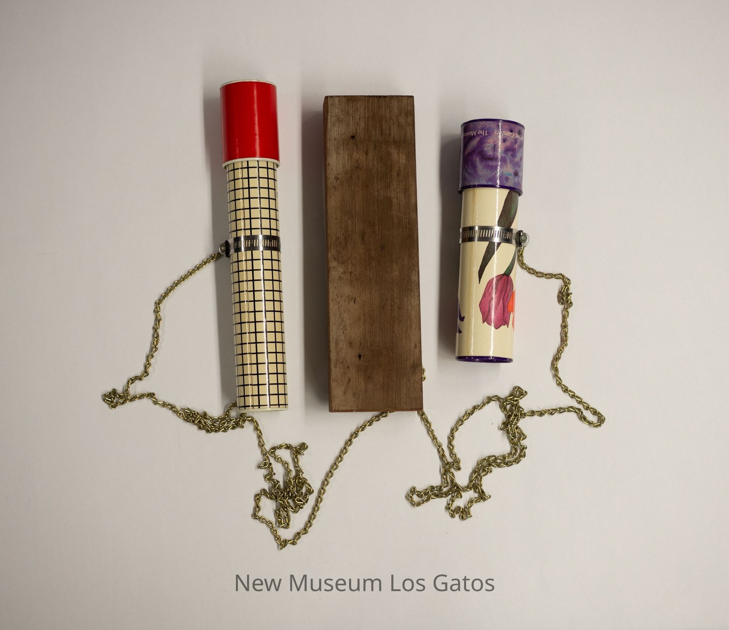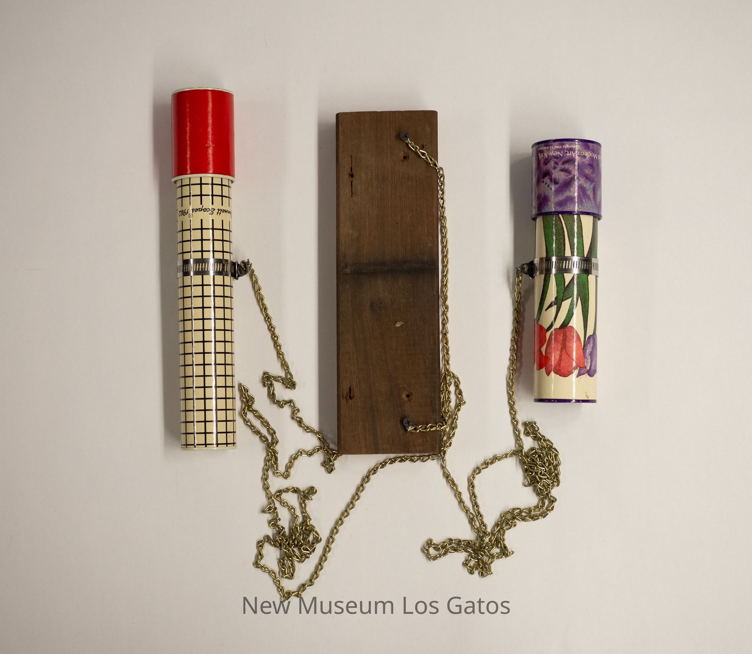 A double kaleidoscope contraption that appears to be handmade, consisting of two distinct and unrelated kaleidoscopes attached to a rectangular piece of wood with long golden chains. Both of the kaleidoscopes are cylindrical. For the larger one, the body is likely made out of plastic-coated paper, and is white with a black square pattern. The eyepiece consists of a circular hole cut in the metal, through which the mirrored interior is viewable. The view piece is solid red, and consists of colorful plastic pieces. For the smaller one, the body is also likely made out of plastic-coated paper, and has a white background with purple, pink, and red flowers. The eyepiece consists of a circular hole, through which the mirrored interior is viewable. The view piece has an abstracted purple floral patter, and consists of miniature versions of the artist's work.Collection