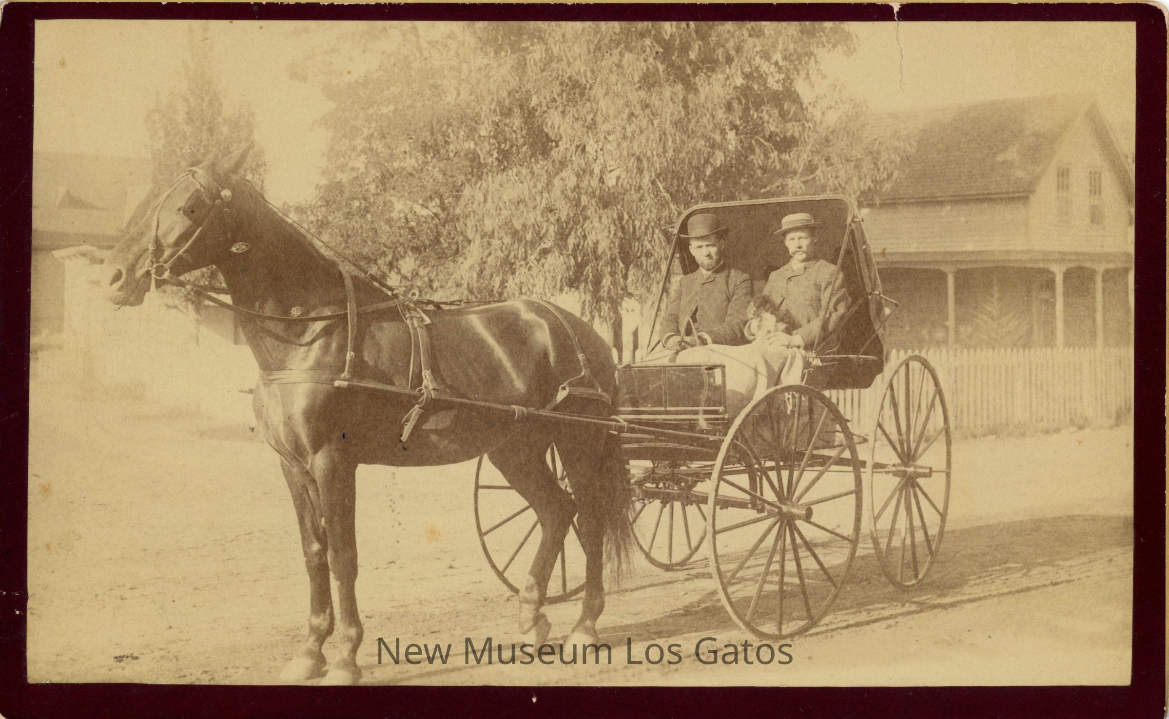 A black and white photograph of two men, sitting in a horse-drawn carriage. The men are wearing long coats and hats, and the man on right is holding a small dog in his lap. The carriage is being pulled by a dark colored horse. There is a house, trees, and a white picket fence in the background. The photograph is surrounded by a brown border.Photograph Details