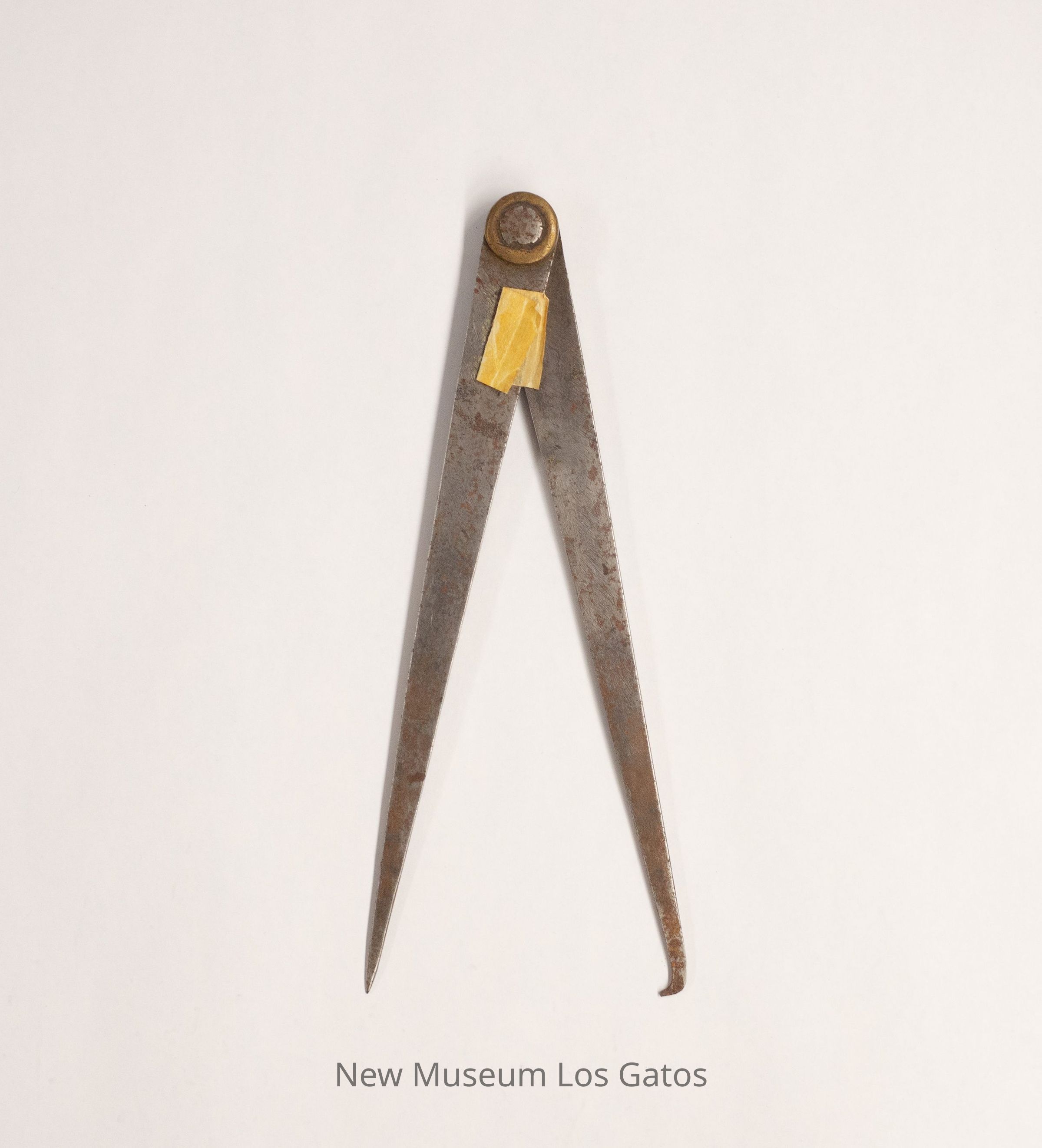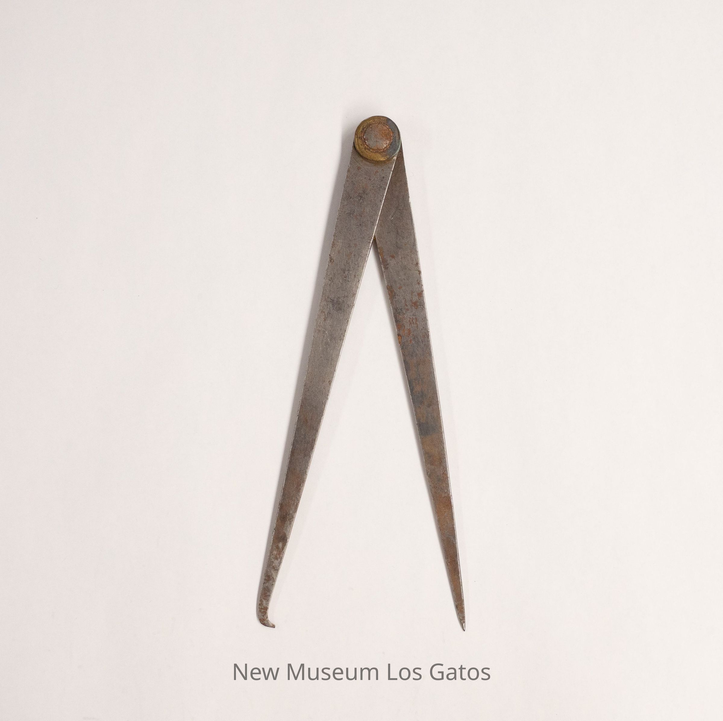 A pair of squared, curved metal rods that taper, one towards a sharp point at the bottom, and the other towards a small, curved point at the bottom. The rods are held together at the top by a joint that opens and closes the rods.Collection
