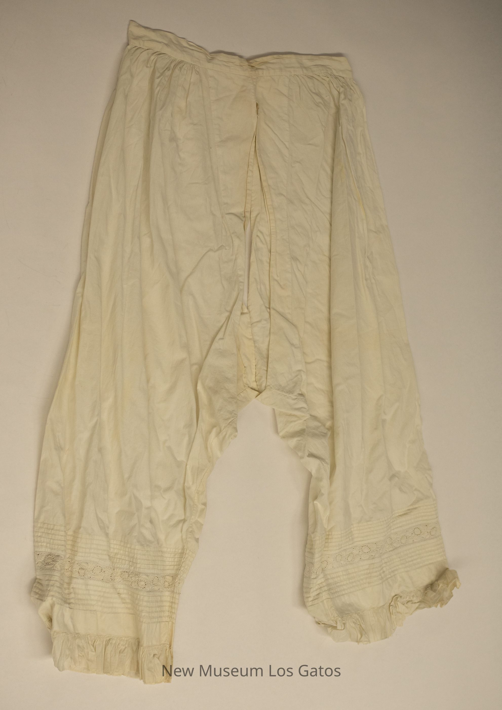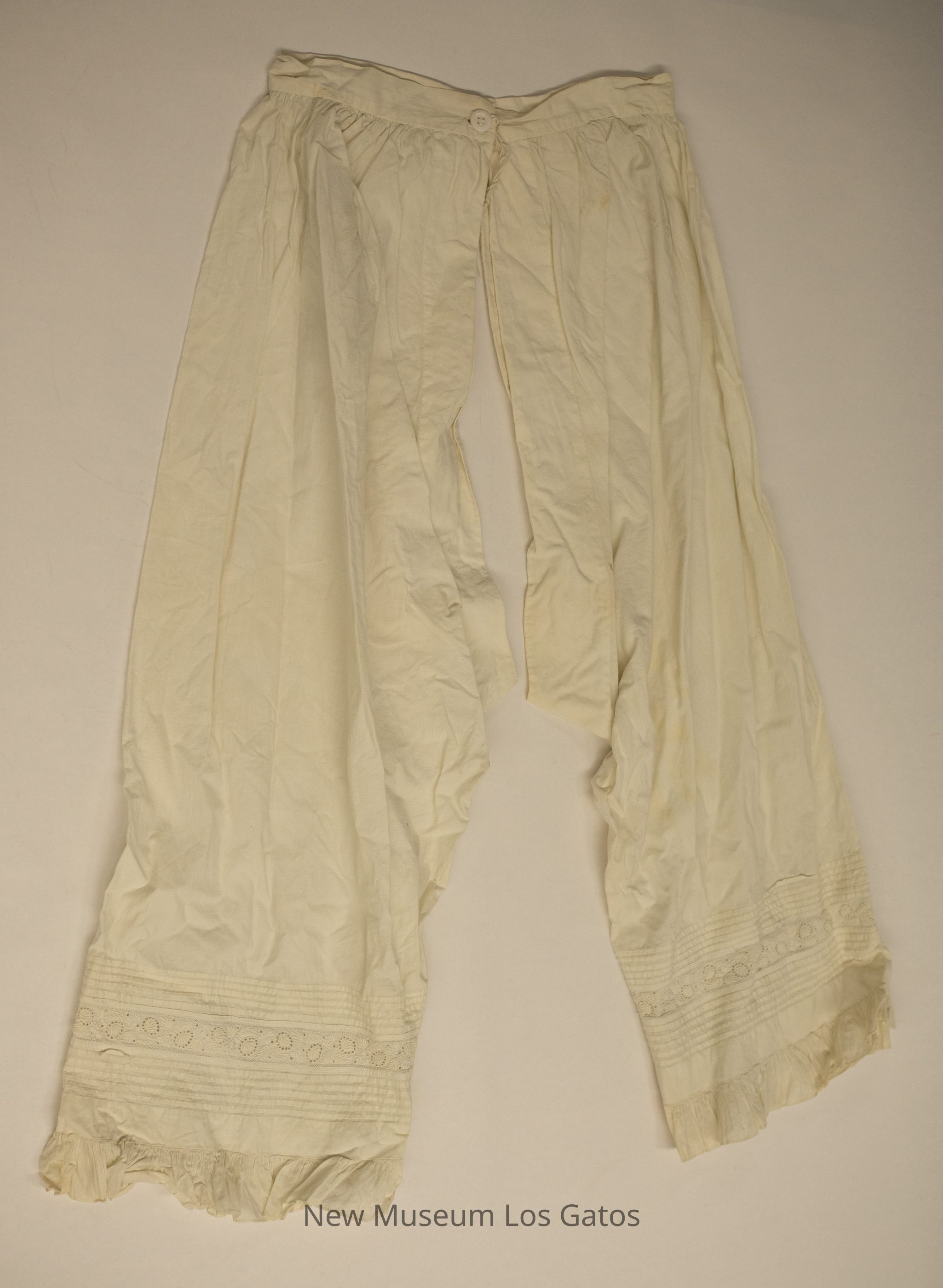 A pair of white, separated drawers. There are bands of five horizontal folds, with a band of leafy embroidery and eyelet detailing at the bottom of each leg. The drawers open at the back, and close with a single white button.