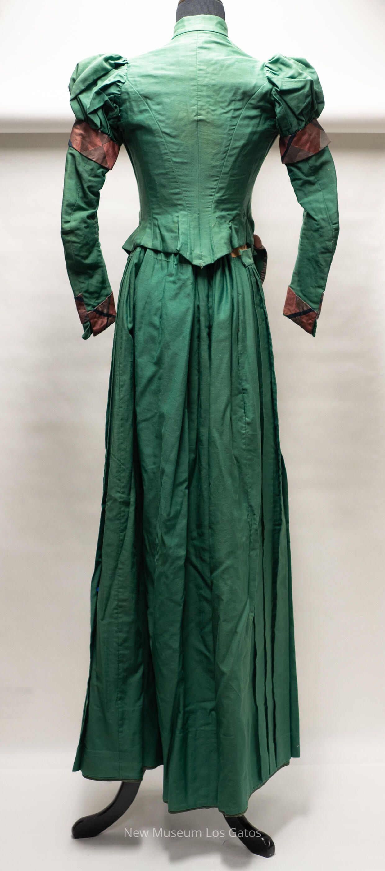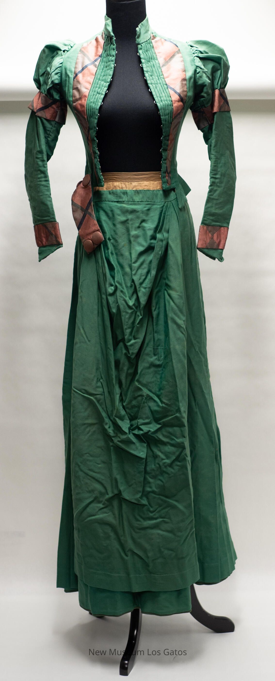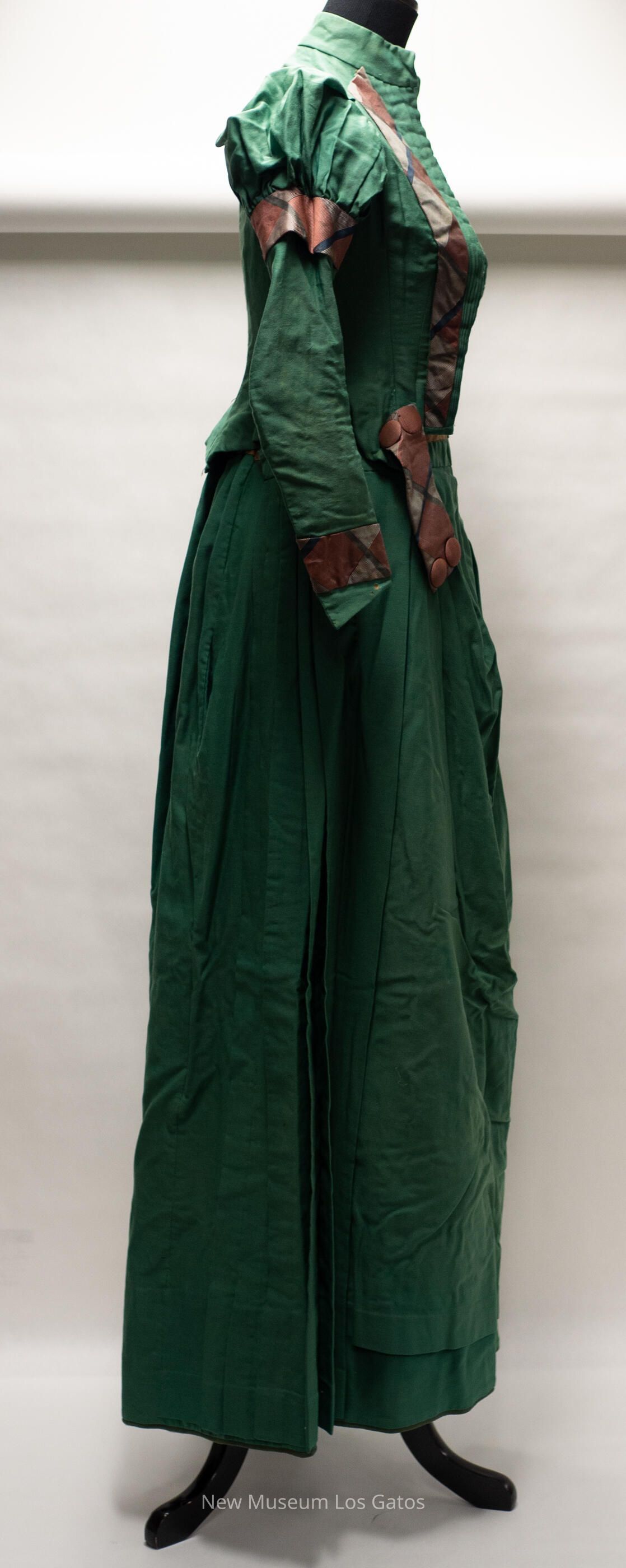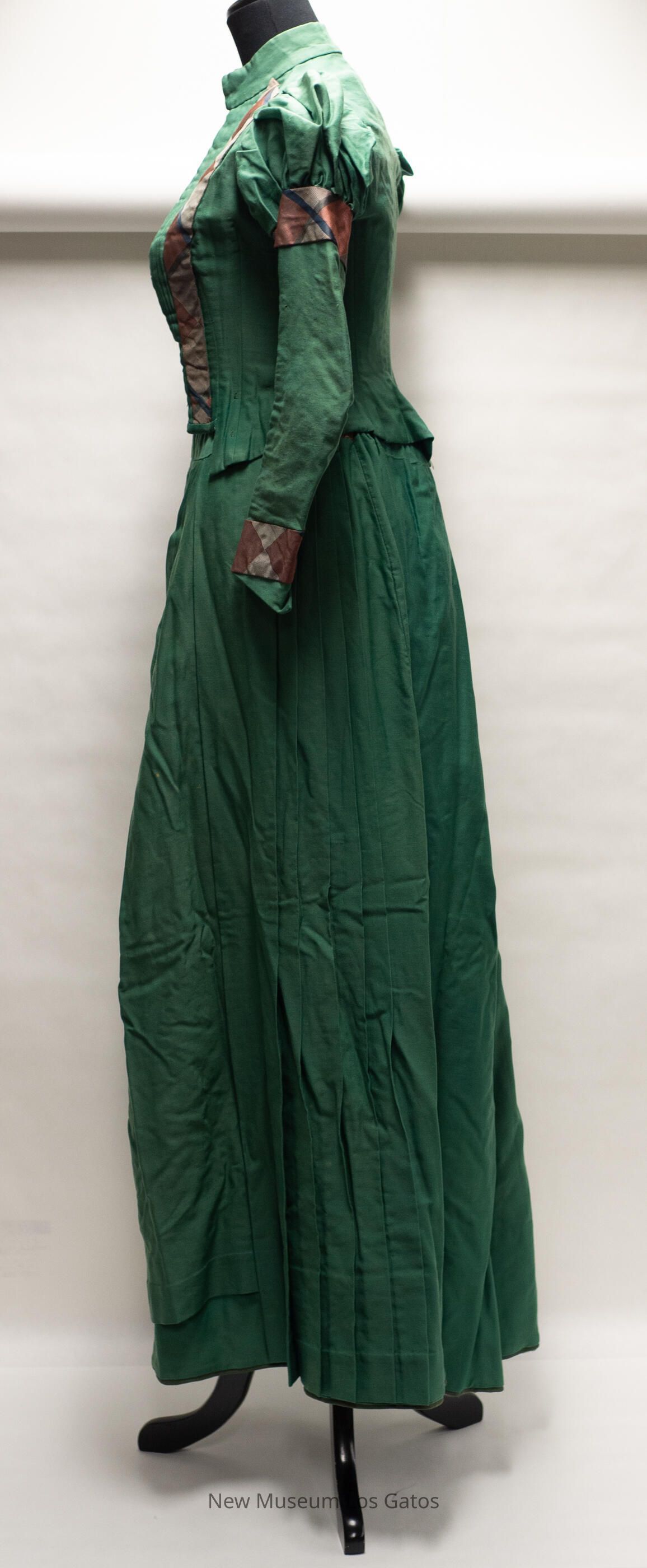 A dark green dress, consisting of two parts: a skirt and a bodice. The skirt is long, with olive green cording along the hem and decorative folds/ruffles in the front. There is a light brown stripe of fabric along the waistband. The skirt opens at the side, and closes with a hook-and-eye clasp at the top. The bodice is dark green with puffed shoulders, and has red and black plaid detailing along the wrists, the upper sleeves, the waist, and down the front of the bodice. The bodice opens in the middle of the front, and closes with numerous silver hook-and-eye clasps. There is boning inside the bodice as well.Collection