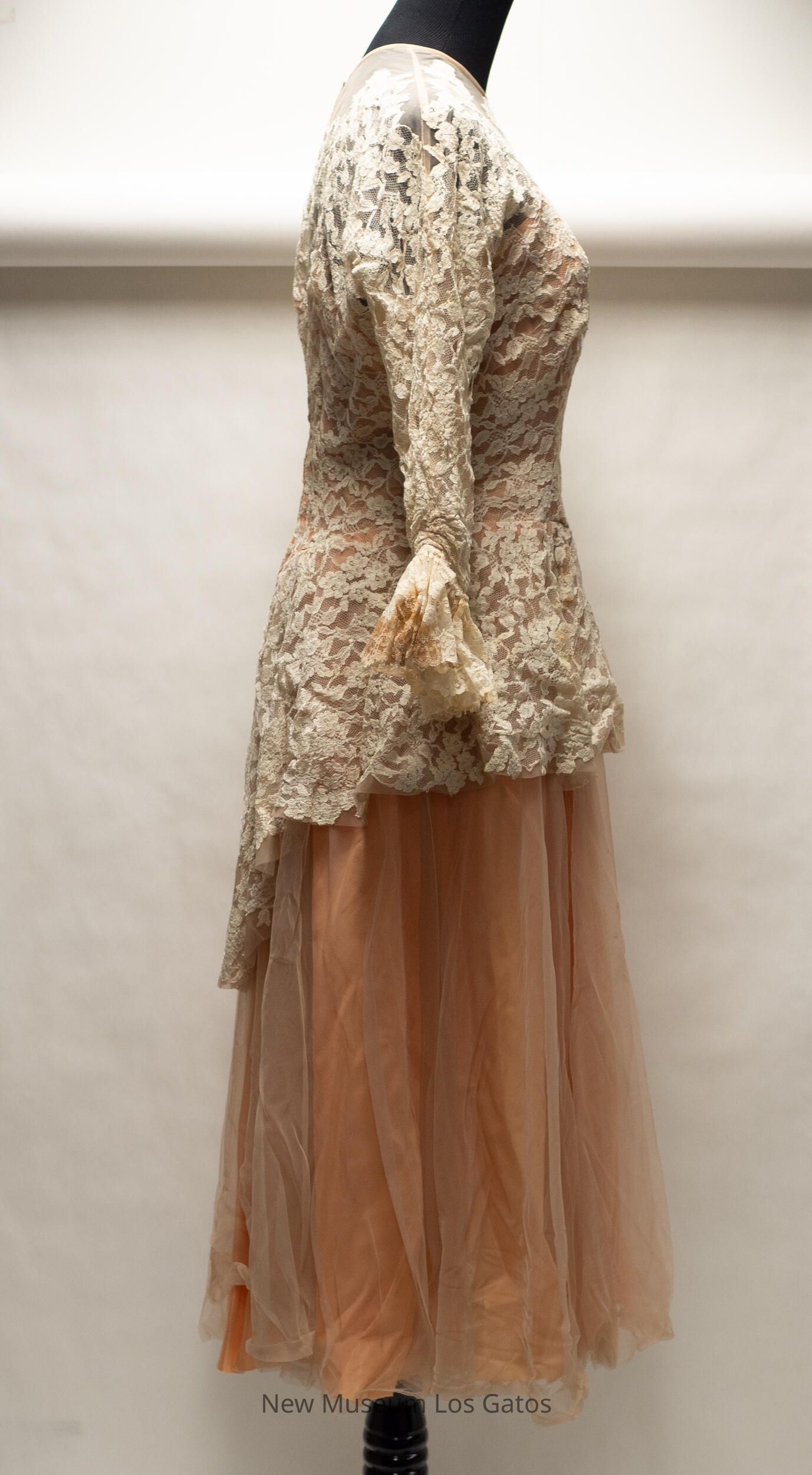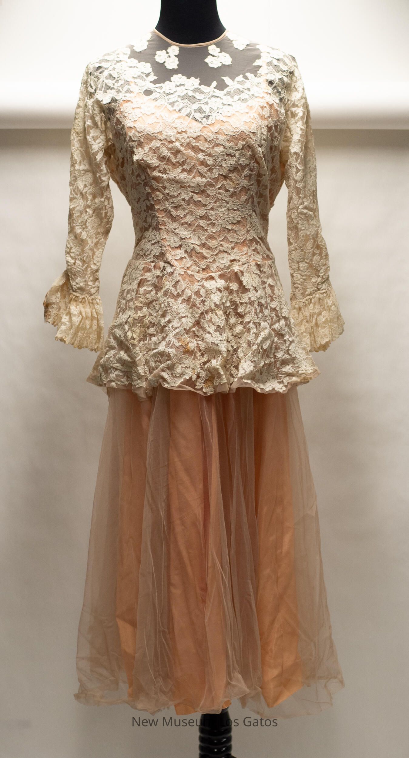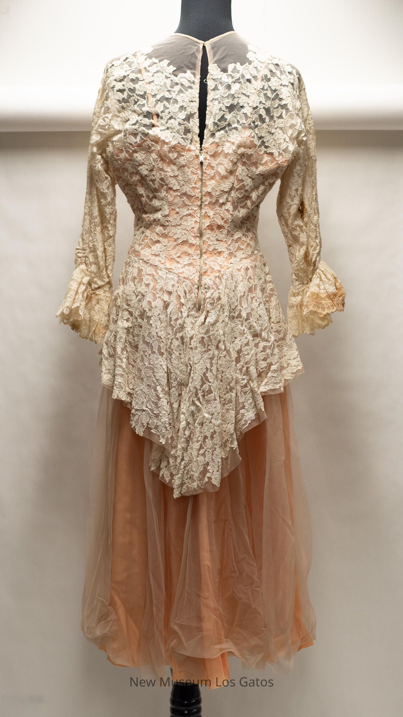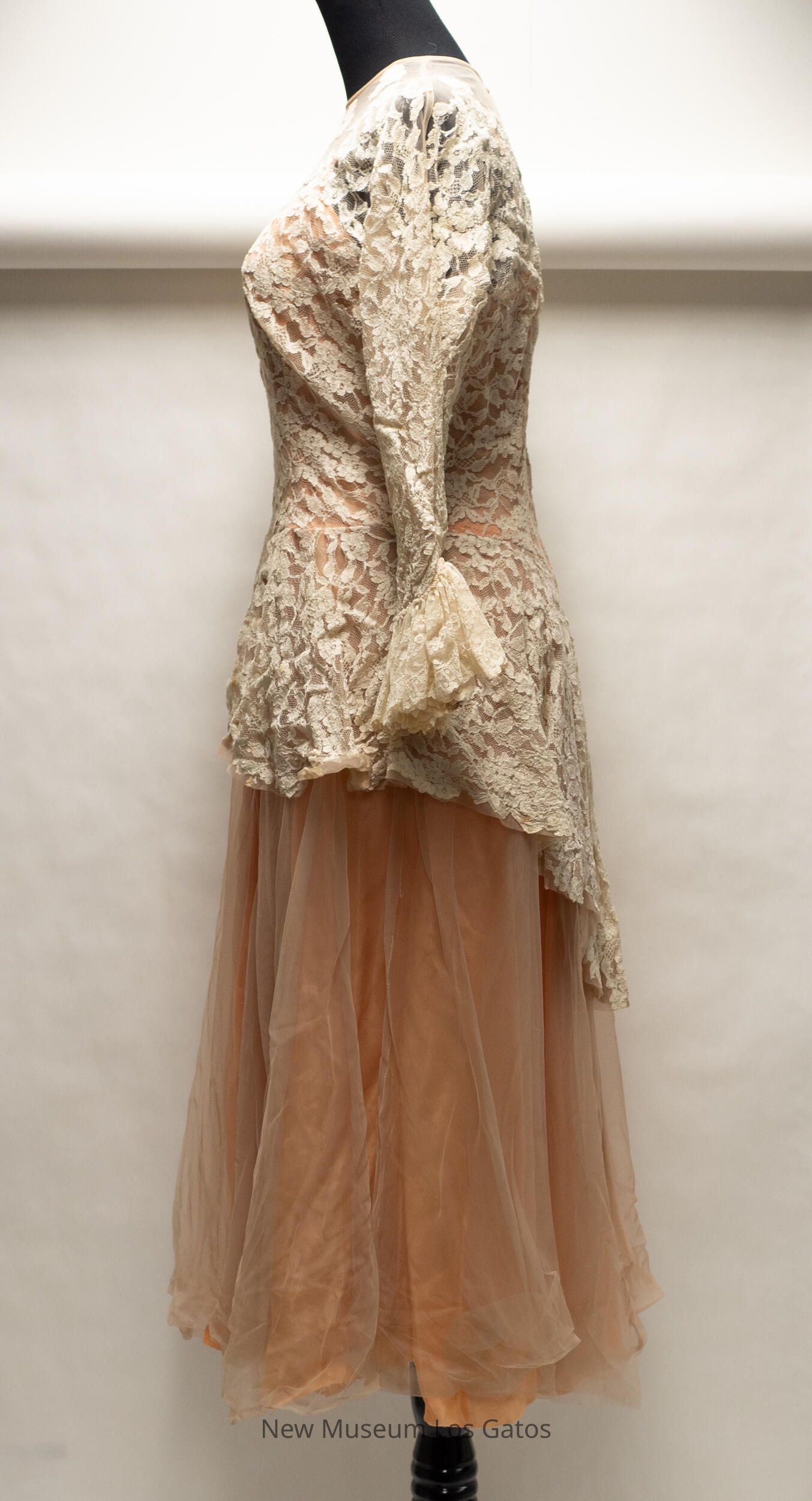 A long, peach colored taffeta dress with a lace overlay. The peach taffeta dress has thin spaghetti straps. There is a light gray netting over the skirt of the dress, while there is a white floral lace over the bodice and arms; the lace creates long sleeves, which are cinched at the wrist. The dress opens halfway down the back, and closes with a silver zipper.Collection