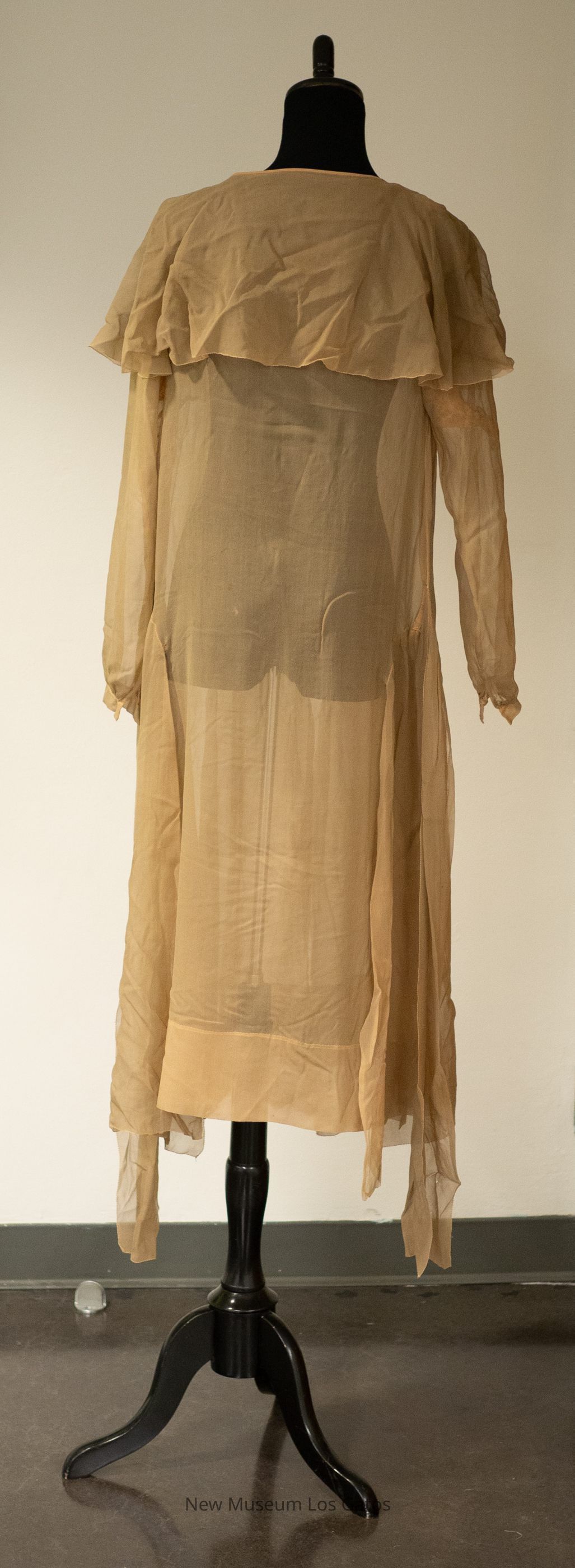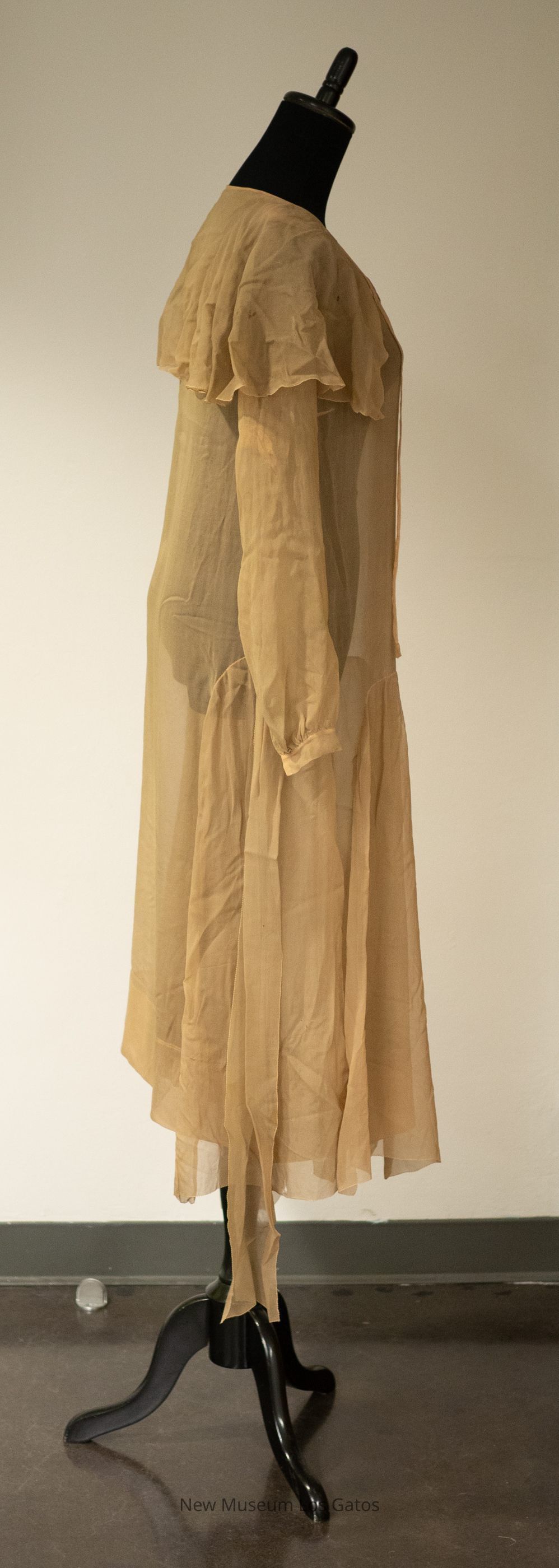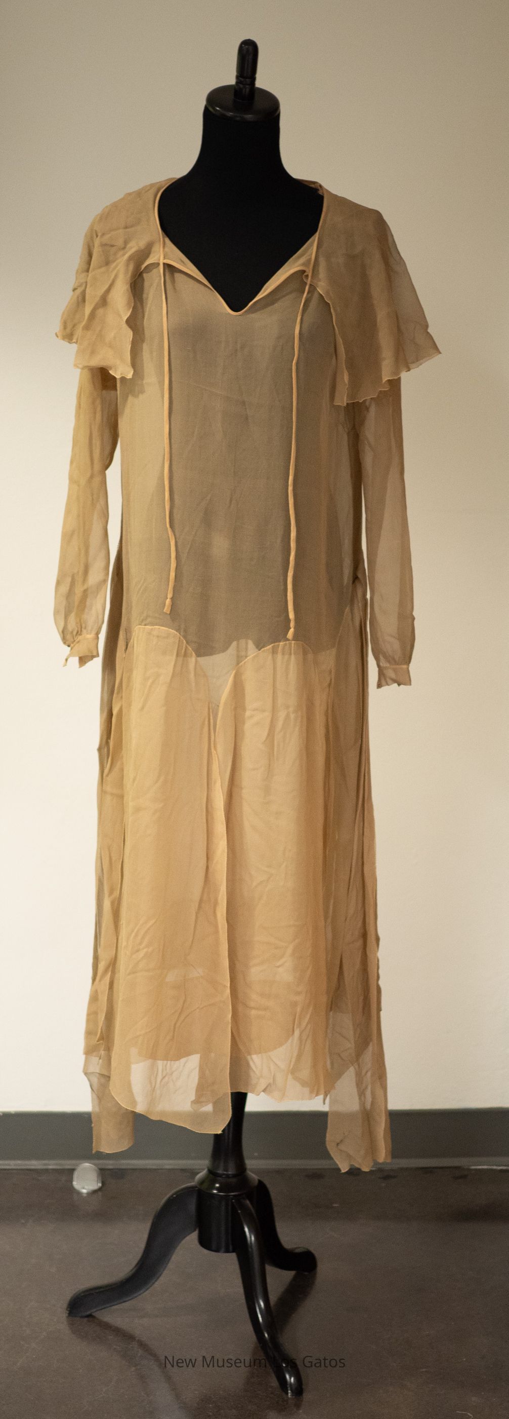 A long-sleeved, brown georgette day dress. The bottom section of skirt has numerous strips of fabric (godets) that branch off from the main skirt. There are ties around the center of the dress, and ties at the neckline as well. There is an exaggerated collar. The sleeves fasten at the cuffs.Collection
