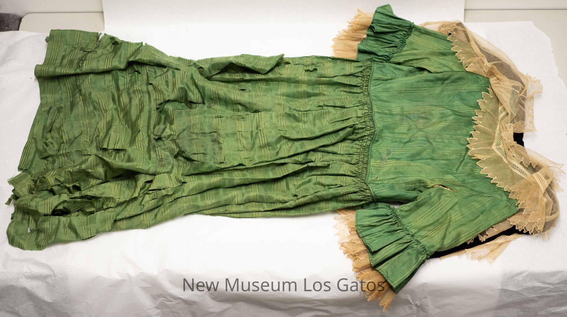 A long green dress, with embroidered horizontal stripes on the skirt, and vertical embroidered stripes on the bodice and sleeves. There are green ruffles at the end of the sleeves, with light tan netting. There is also light tan netting along the neckline, with black velvet trim at the the very top of the neckline. The dress opens in the back, and closes with black hook-and-eye clasps.Collection