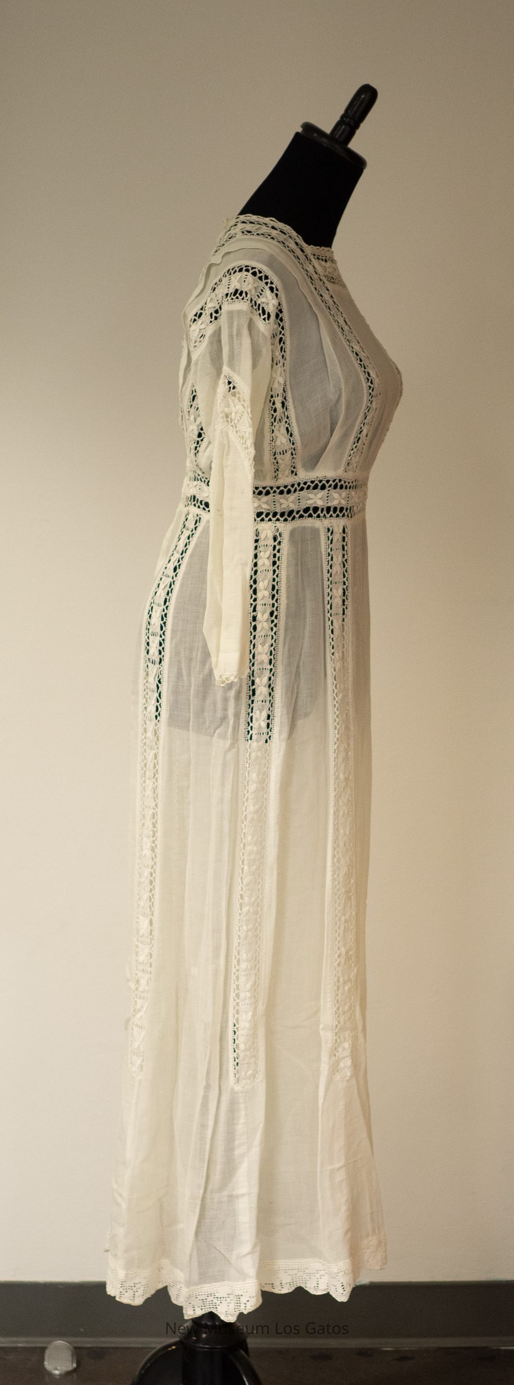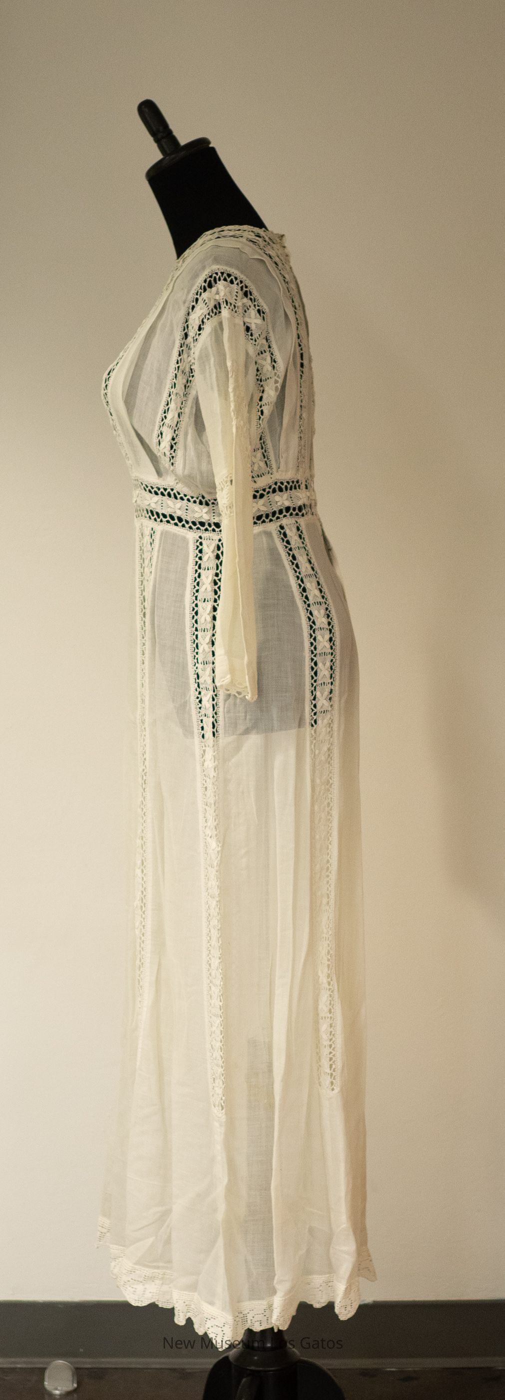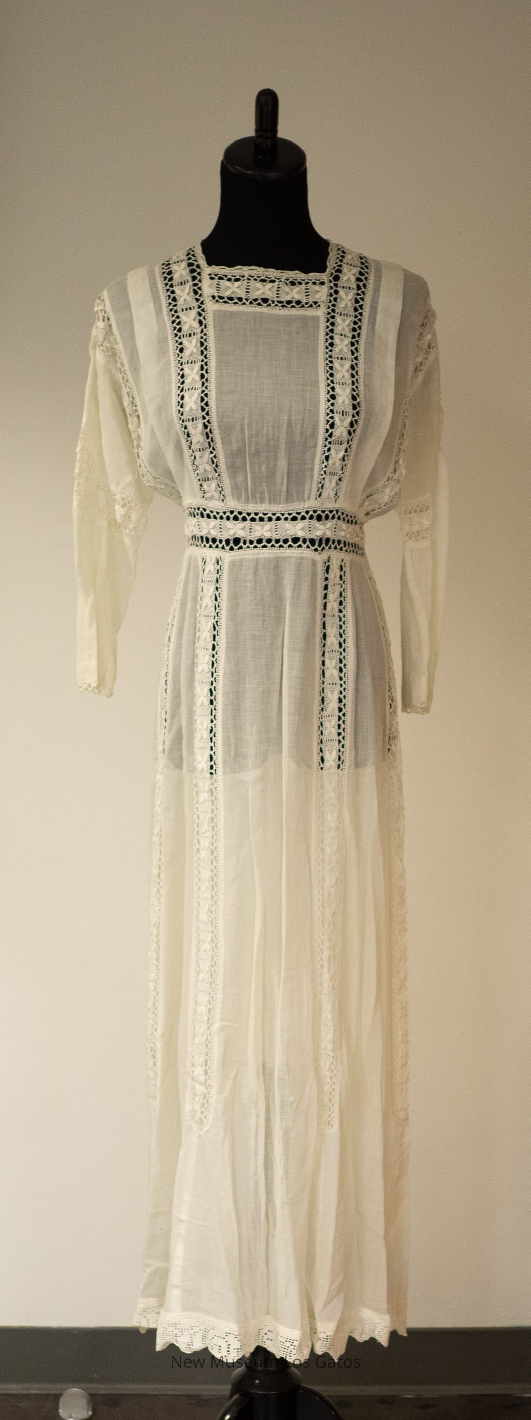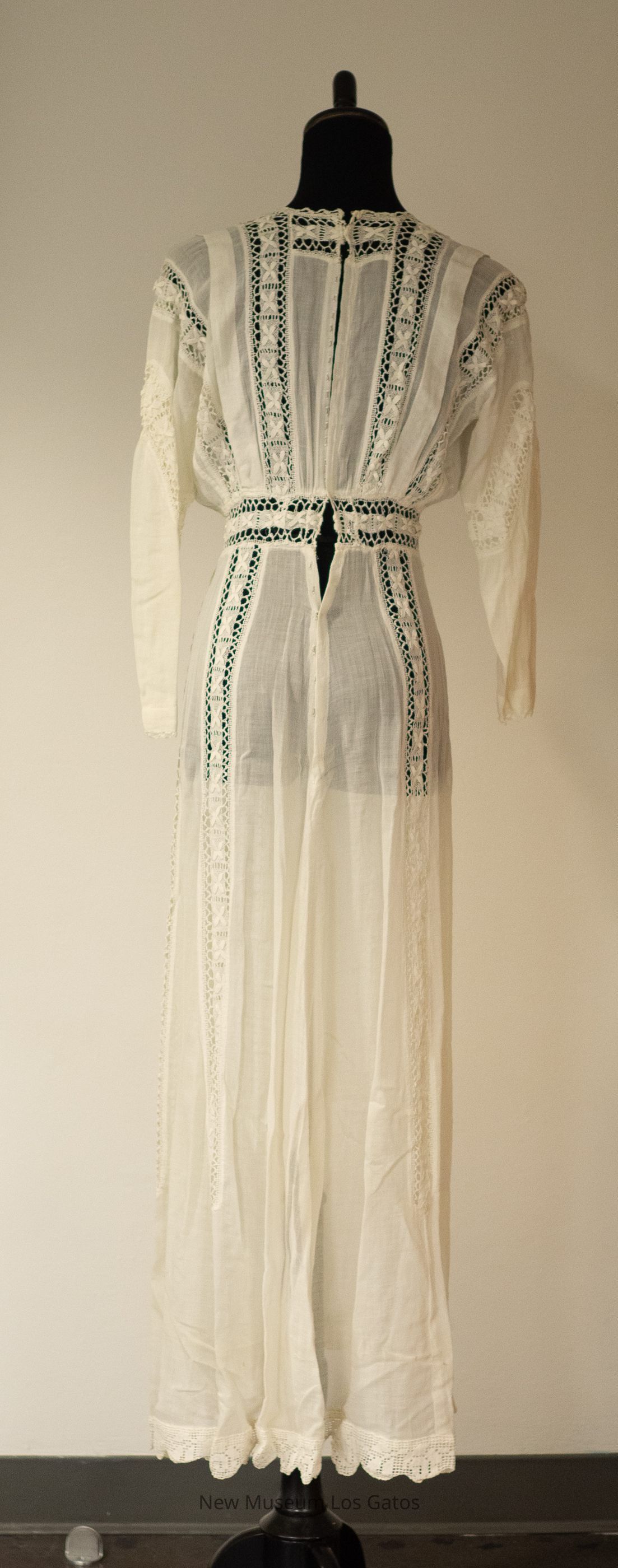 A white, long-sleeved, dress. The dress is plain, with vertical bands of floral embroidery and eyelet detailing throughout the bodice and top portion of the skirt; there is a horizontal band of the same embroidery and eyelet detailing at the waist. There is geometric embroidered trim along the hem of the dress. The dress opens at the back, and closes with 27 silver hook-and-eye clasps.Collection