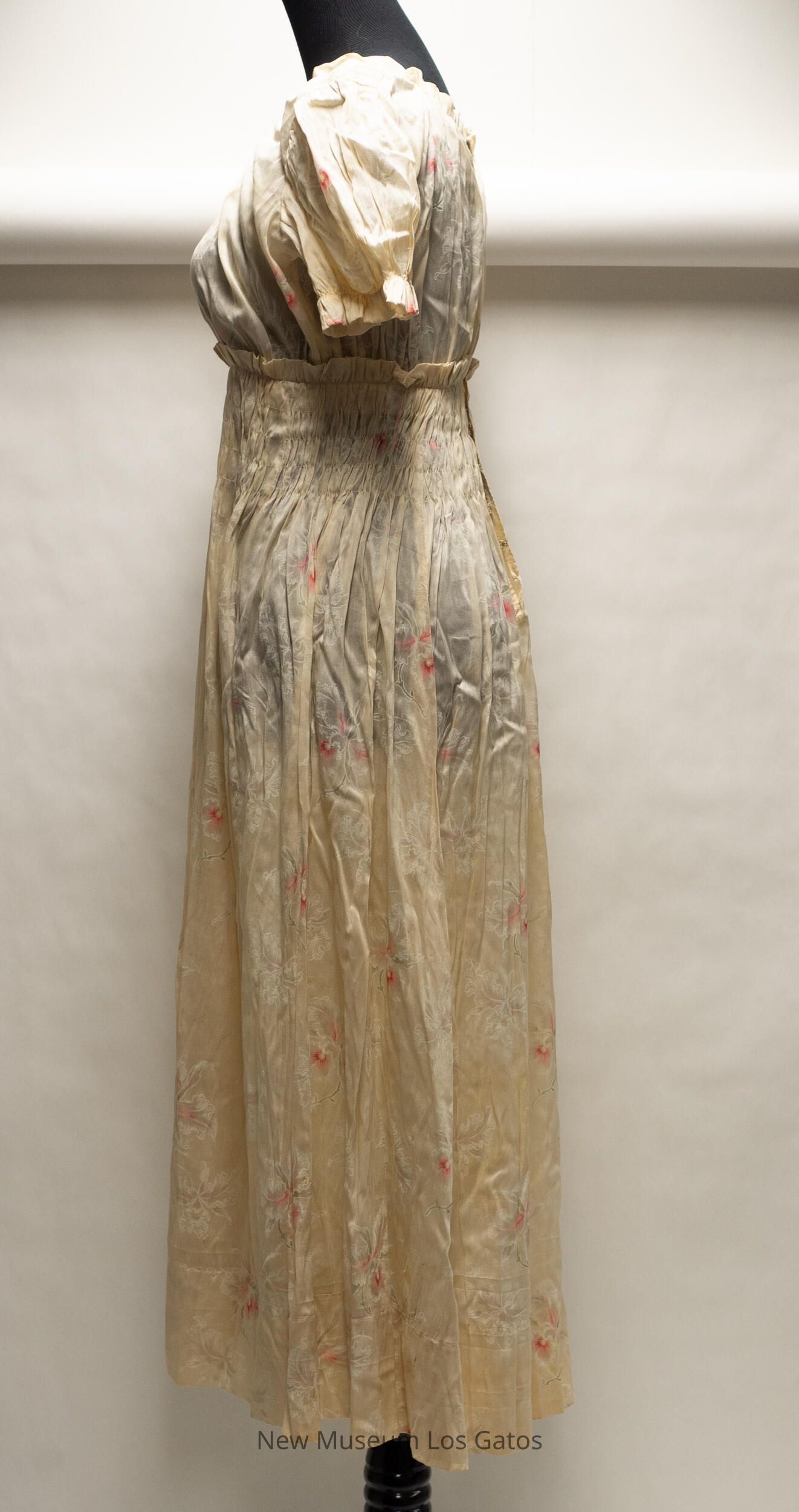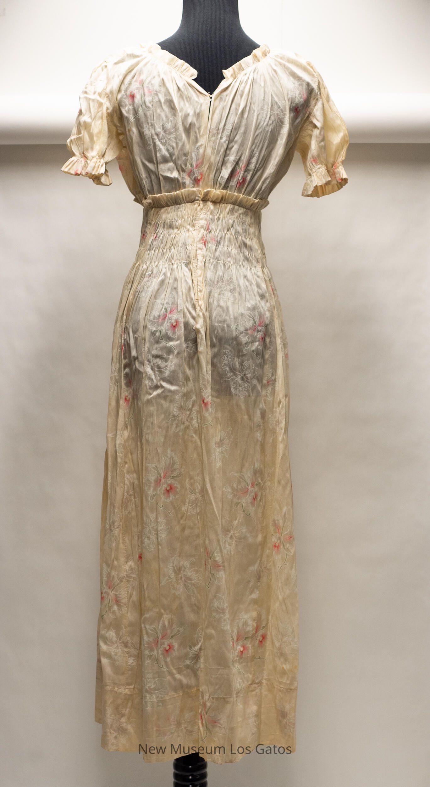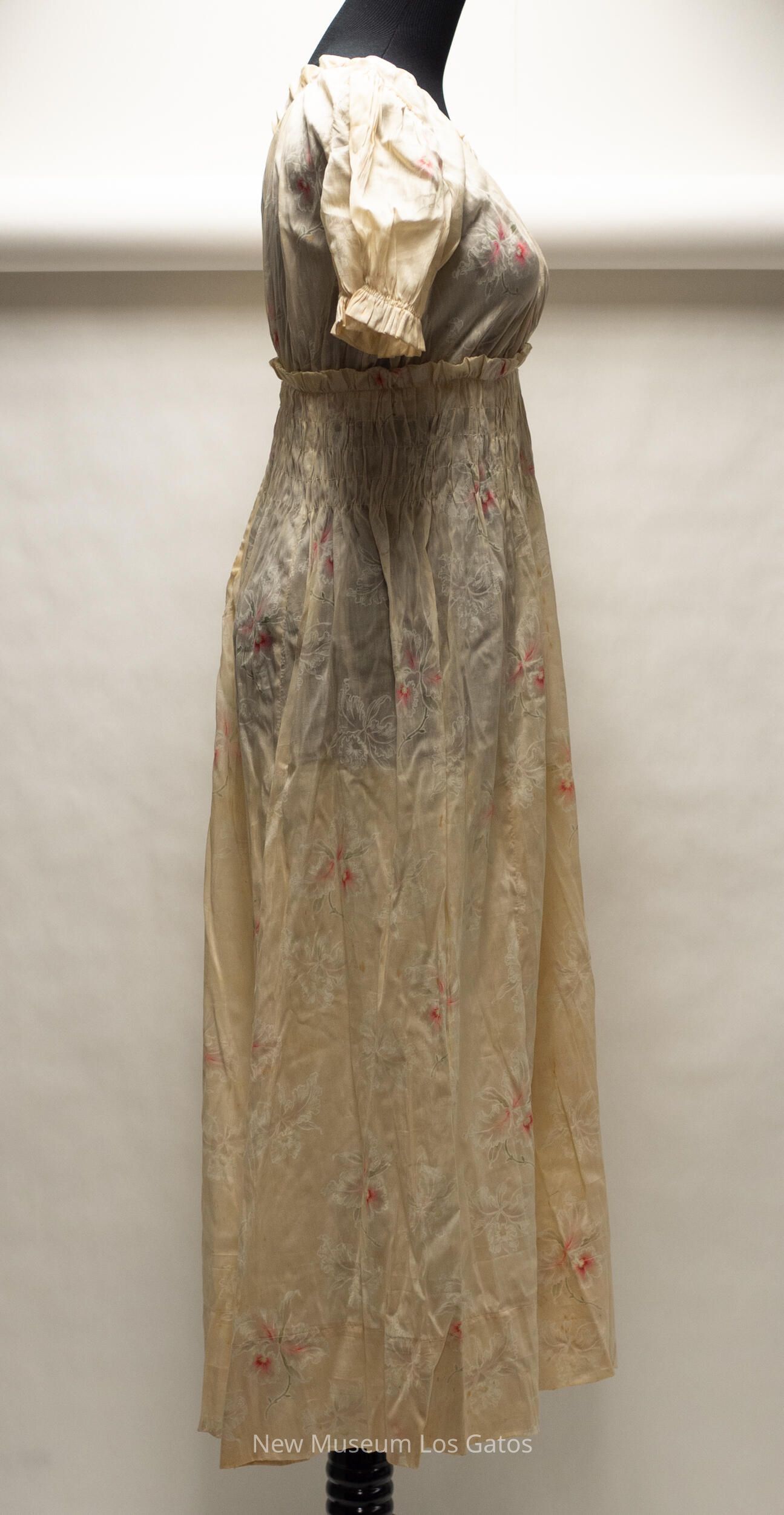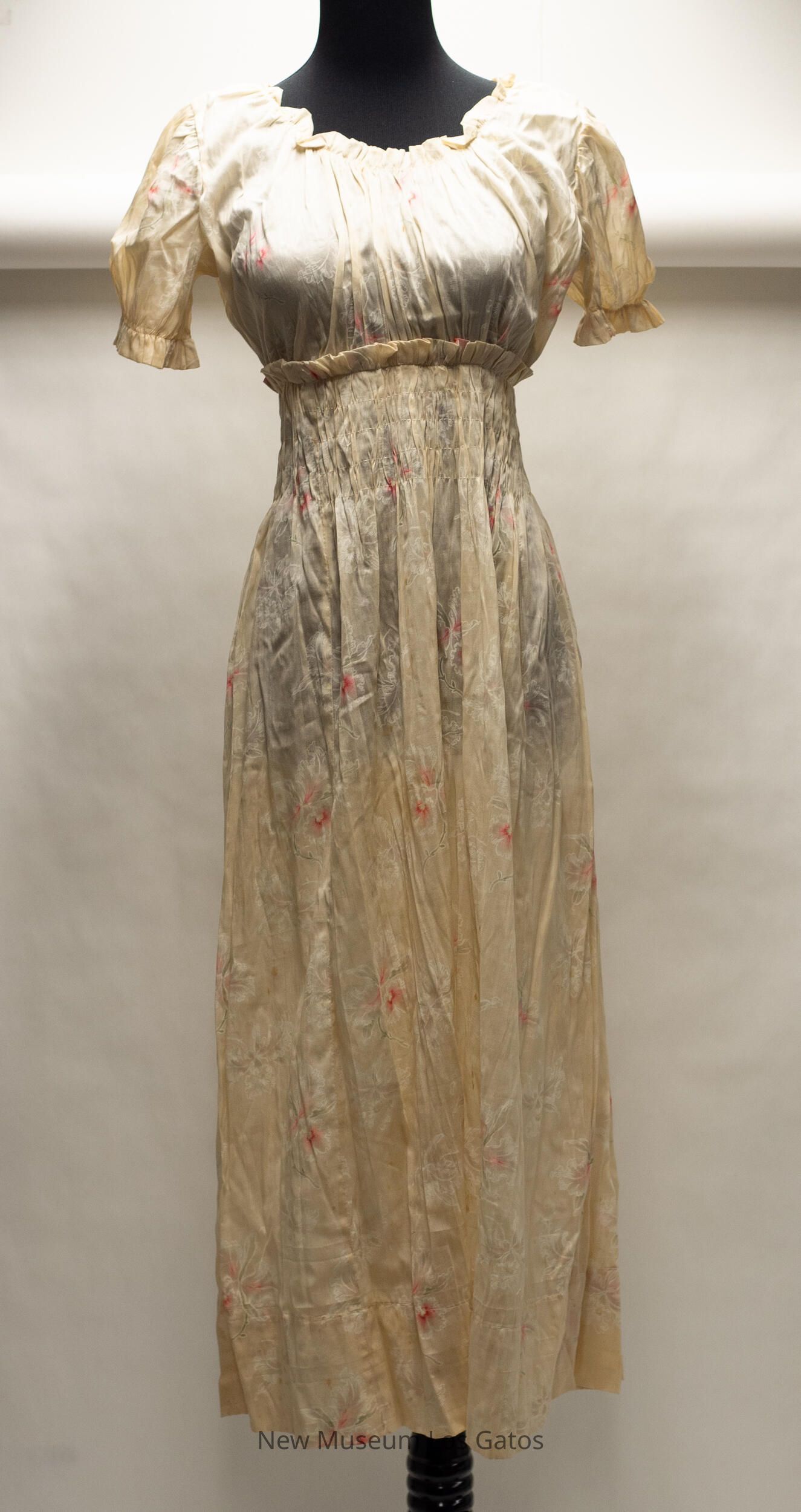 A long, beige short sleeved silk dress. There is a pink, green, and white floral print throughout the dress. The waistband of the dress has a band of ruching, with a small ruffle at the top. The end of both sleeves also have a ruffle. The dress opens up in the back, and closes with silver hook-and-eye claspsCollection