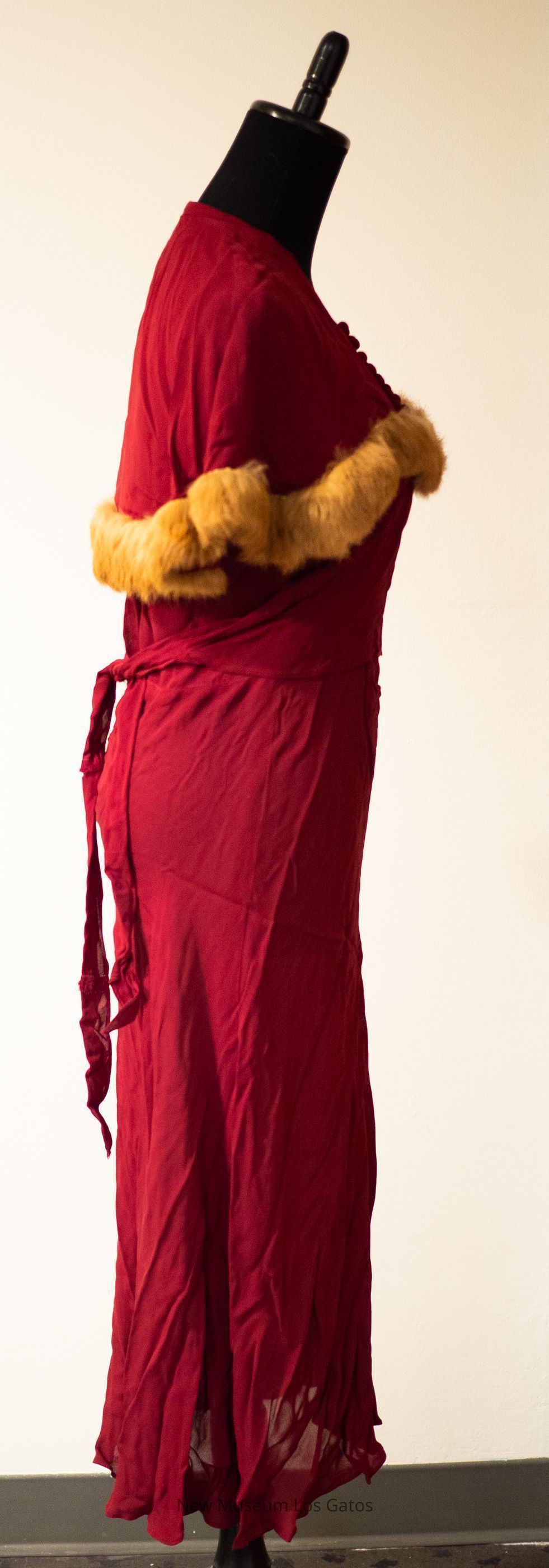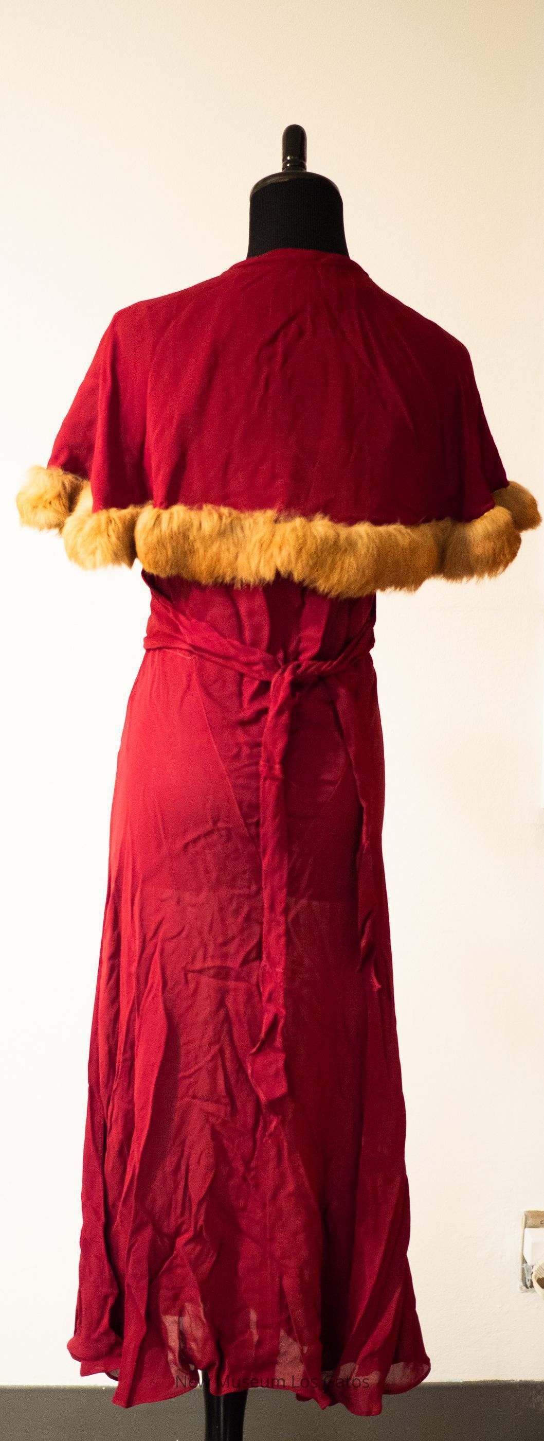 A long sleeveless maroon chiffon dress, with an attached capelet trimmed with brown fur. There are decorative buttons on the chest region. There are asymmetrical decorative seams on both the front and back.Collection