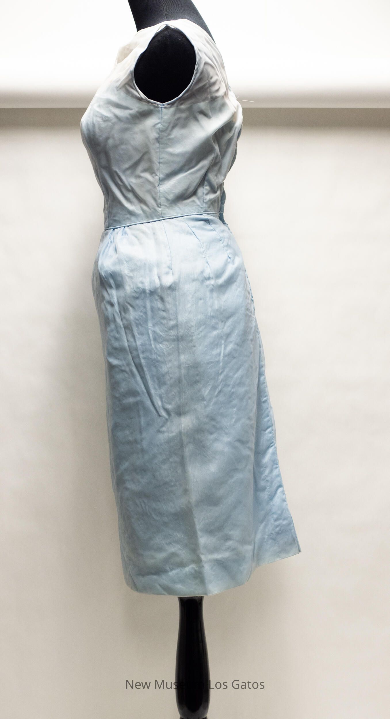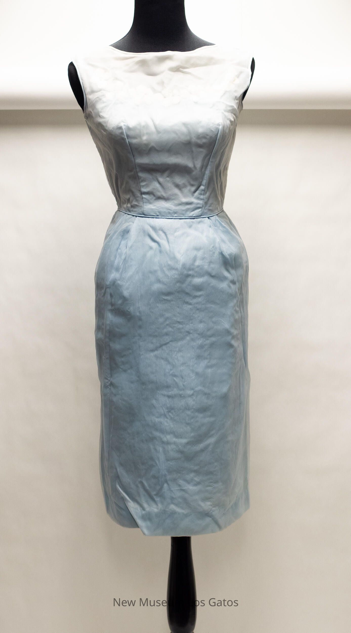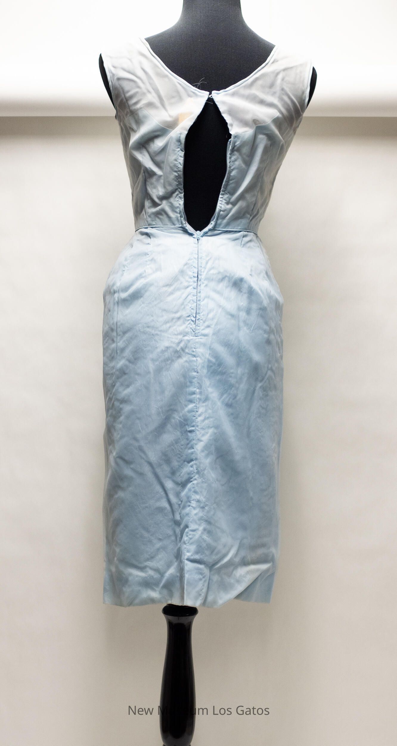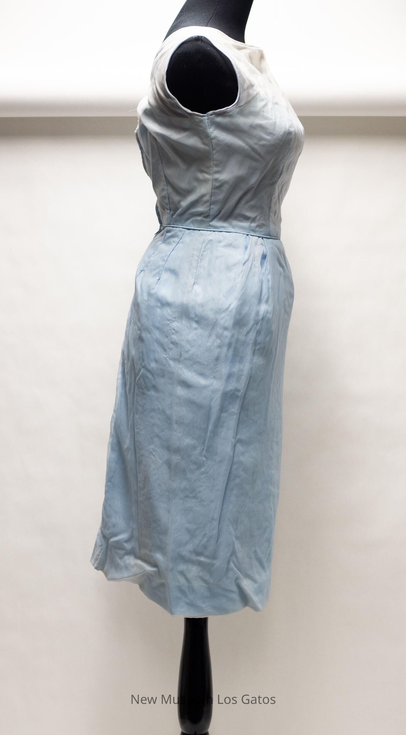 A light blue dress. The dress is long and sleeveless, with a small slit at the bottom, in the back. The shoulder and chest portion of the dress is sheer, and there are embroidered daisies along the blue neckline. The dress opens halfway down the back, and closes with a blue zipper.Collection