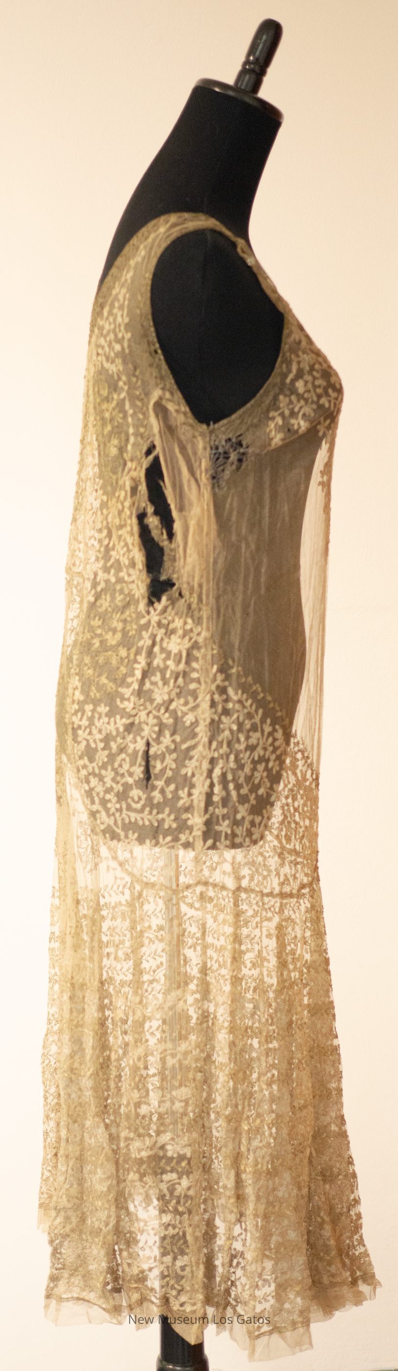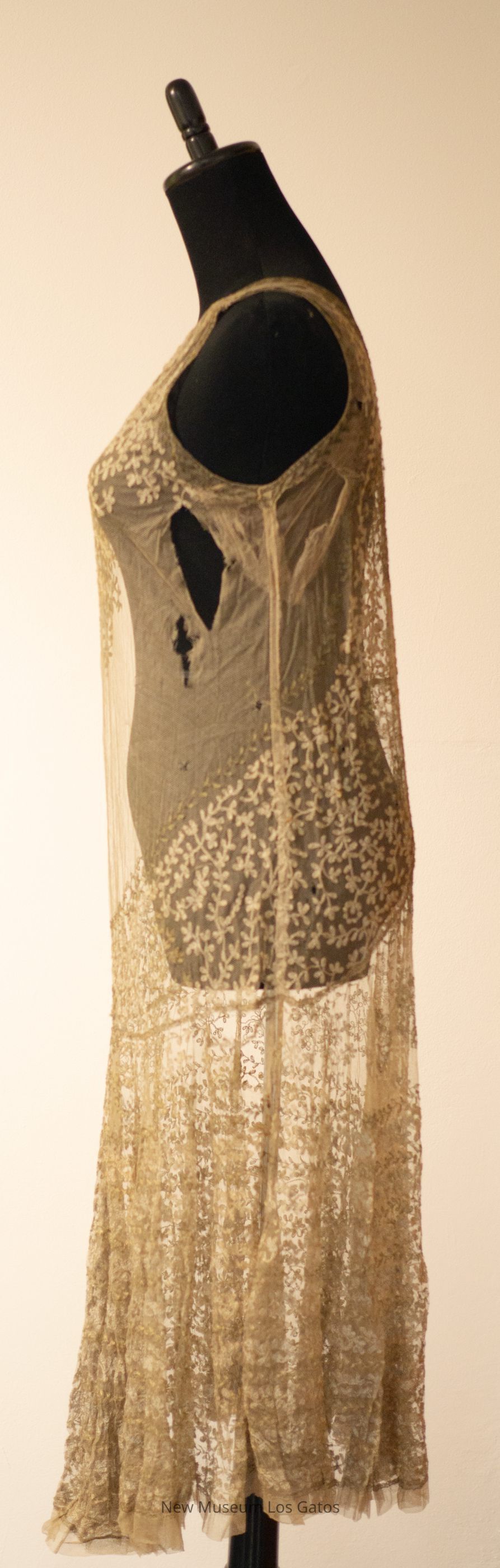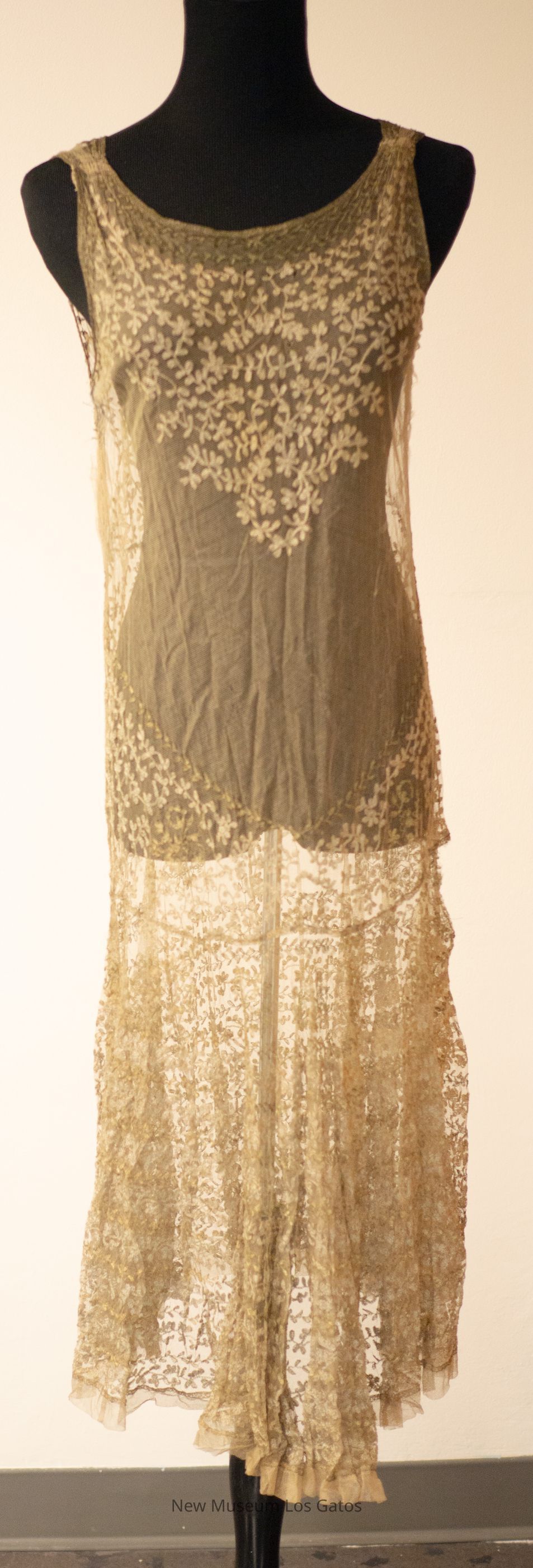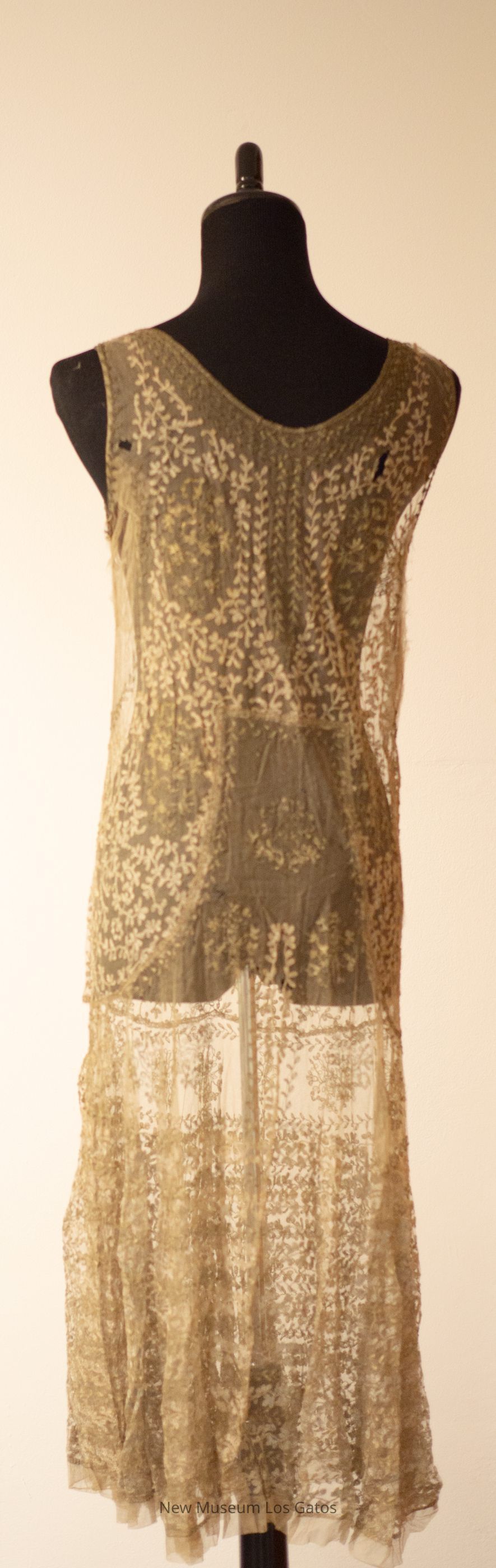 A mid-length gray-green dress, with netting and metallic leaf embroidery throughout and gathered at the neckline.