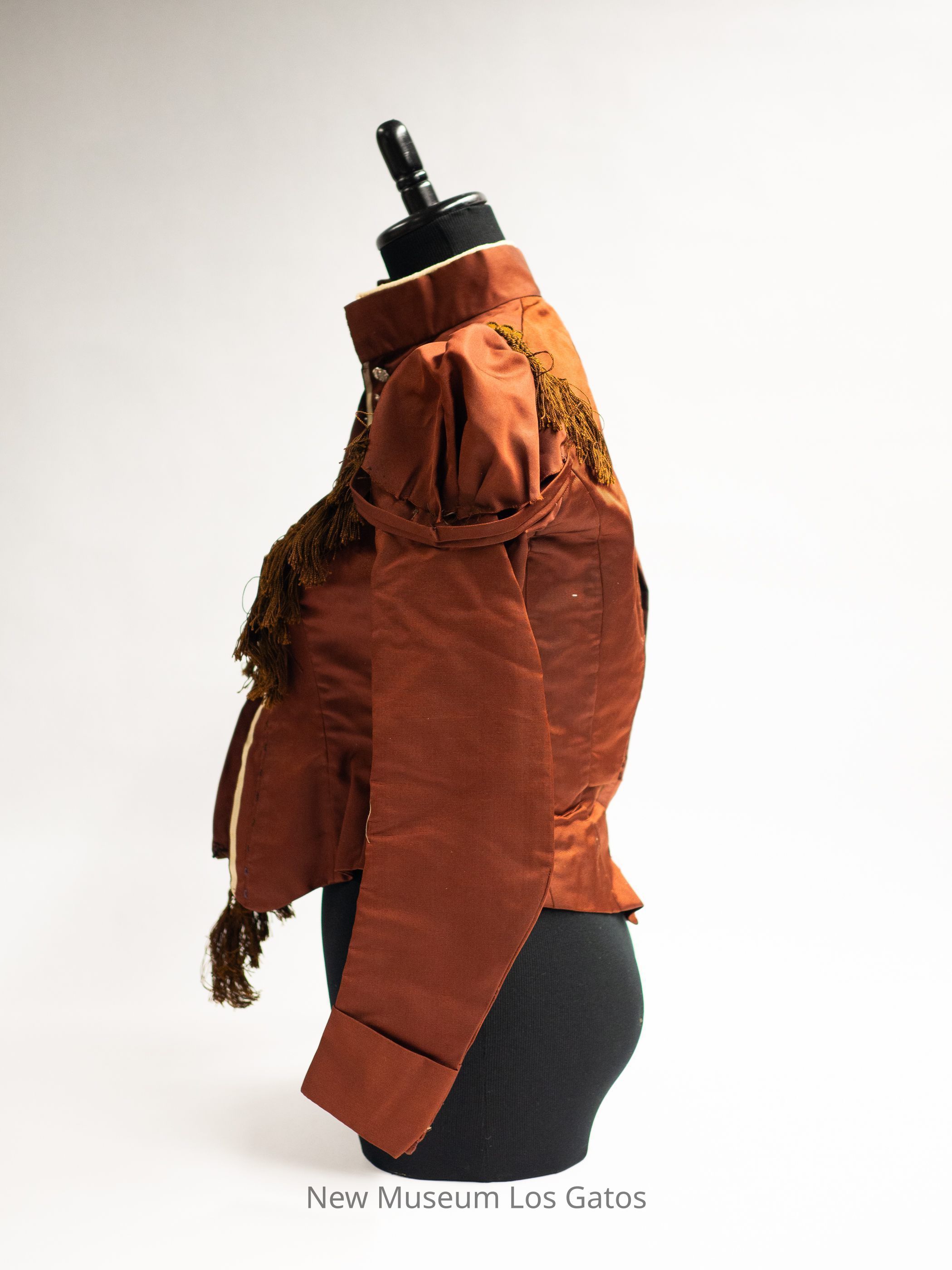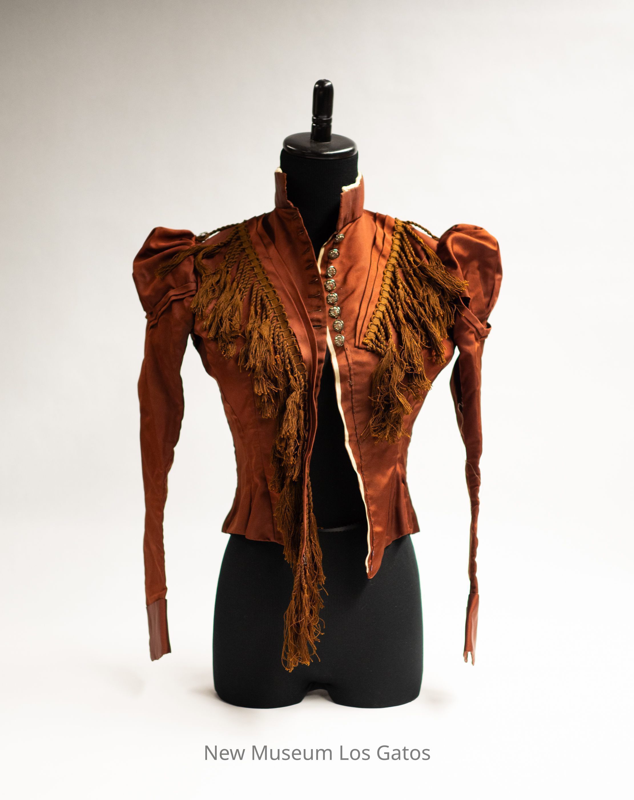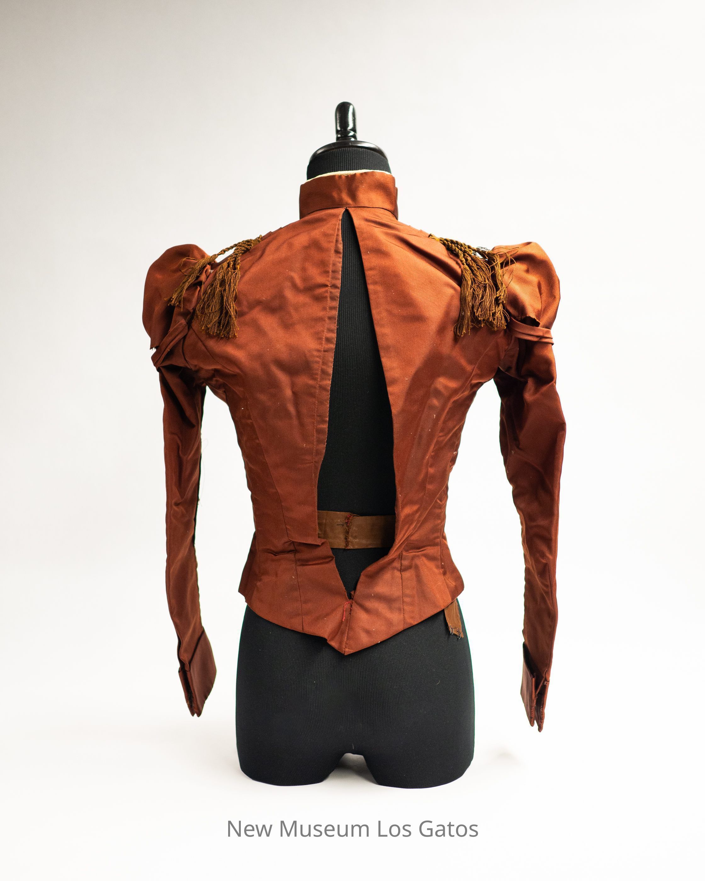 A long-sleeved, wine-colored silk dress bodice with tasseled fringe detailing. The shoulders are puffed, and there is brown fringe along both sides of the front. The back of the bodice is open in the center, where an undershirt would most likely be visible. The bodice opens in the front, and closes with a mix of 15 hook-and-eye clasps and eight large silver buttons with rhinestone and red detailing. There is an interior waistband, to provide structure to the bodice.Collection