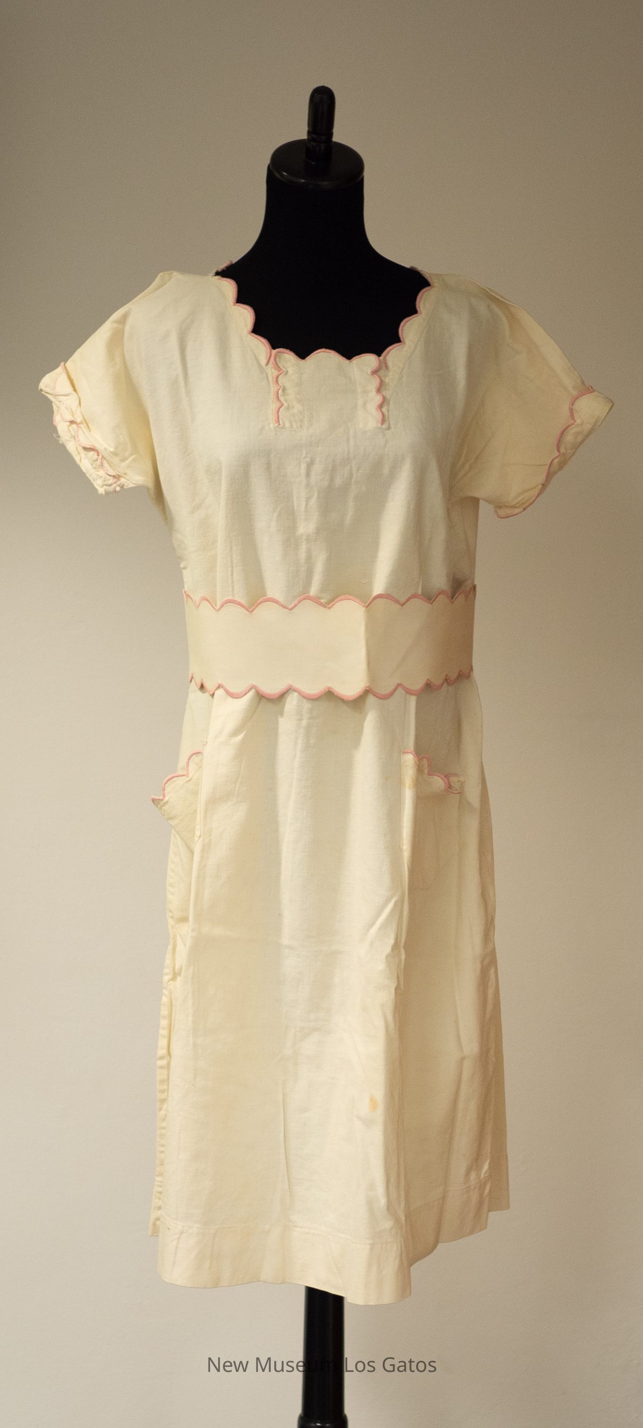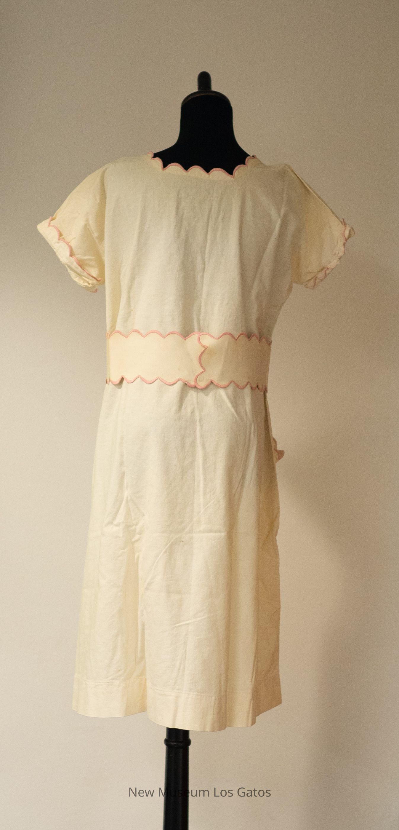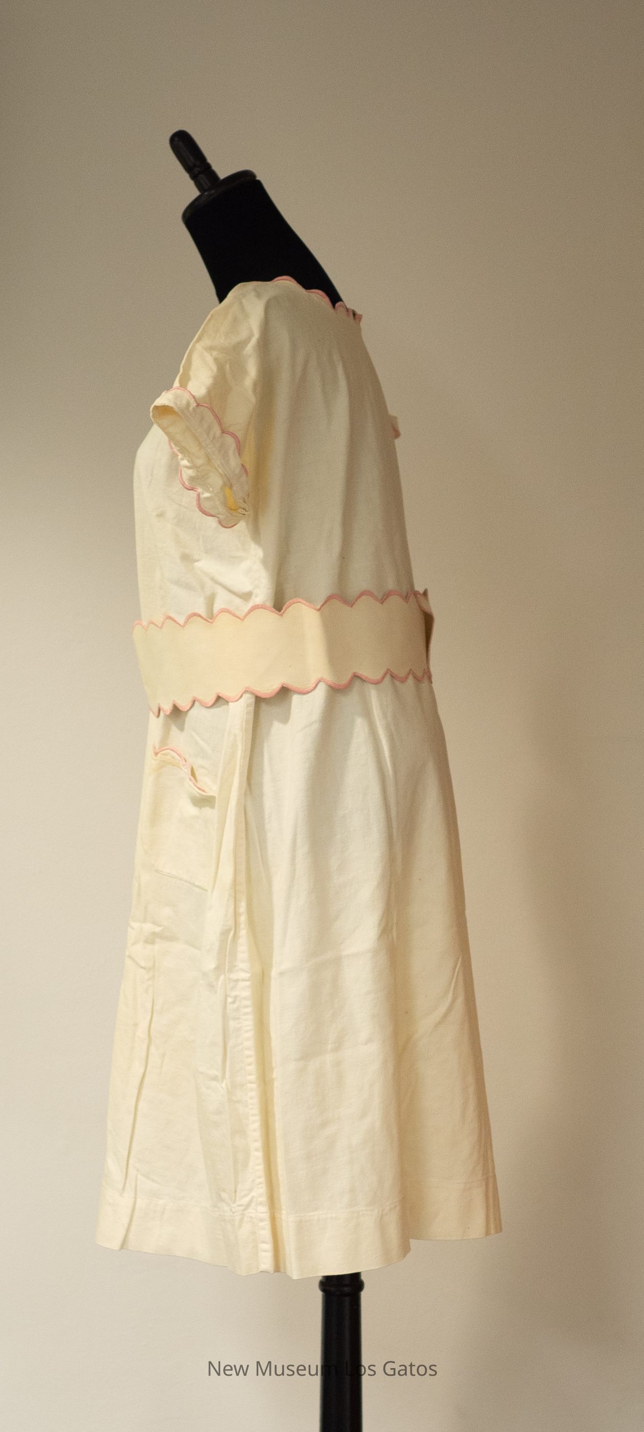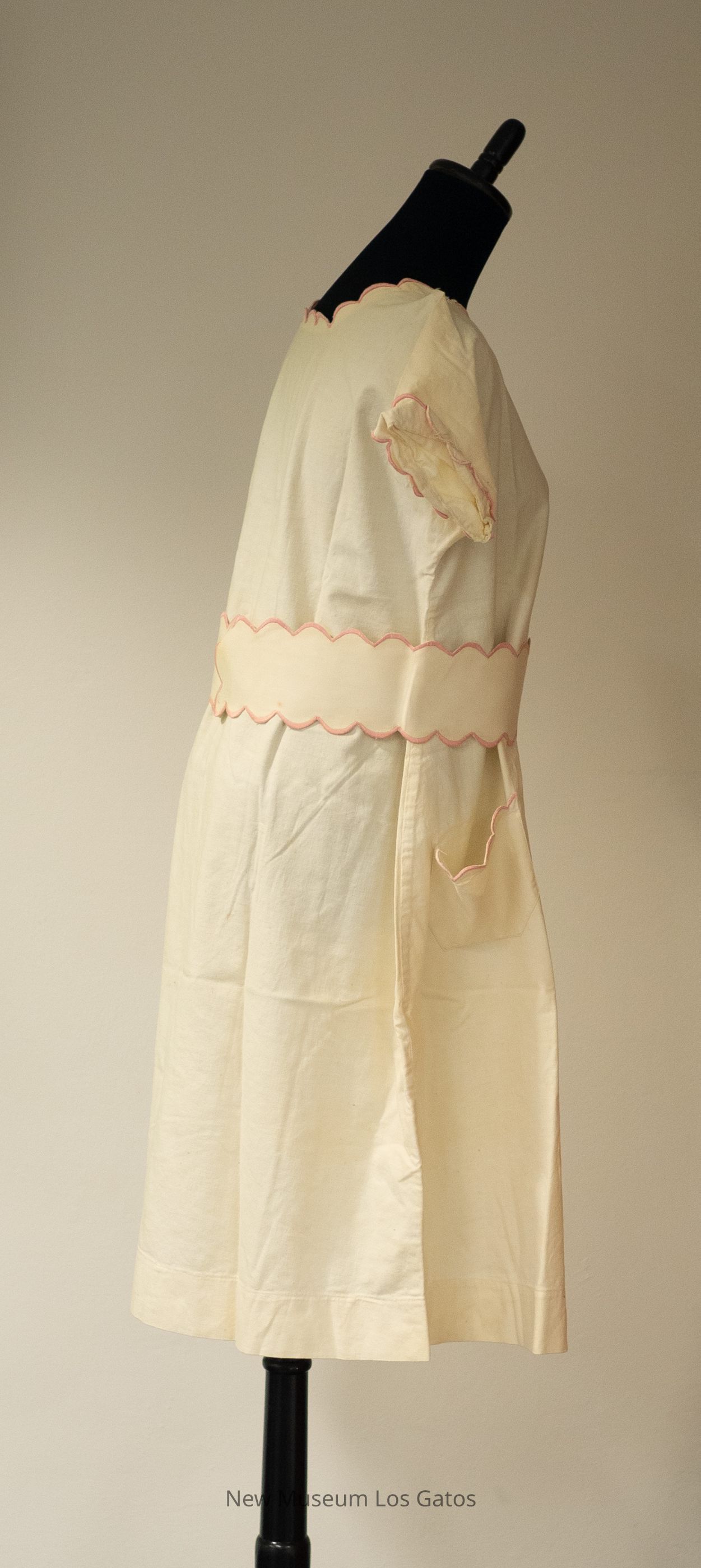 A short-sleeved, cream-colored dress. There are two pockets in the front, that have scalloped edges trimmed in pink embroidery. The sleeves, neckline, and a decorative patch on the chest also have scalloped edges trimmed in pink embroidery. There is an accompanying belt, that has completely scalloped edges trimmed in pink, that closes with two silver button snaps.Collection