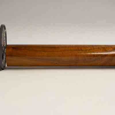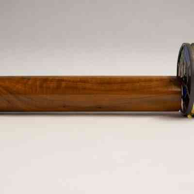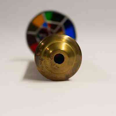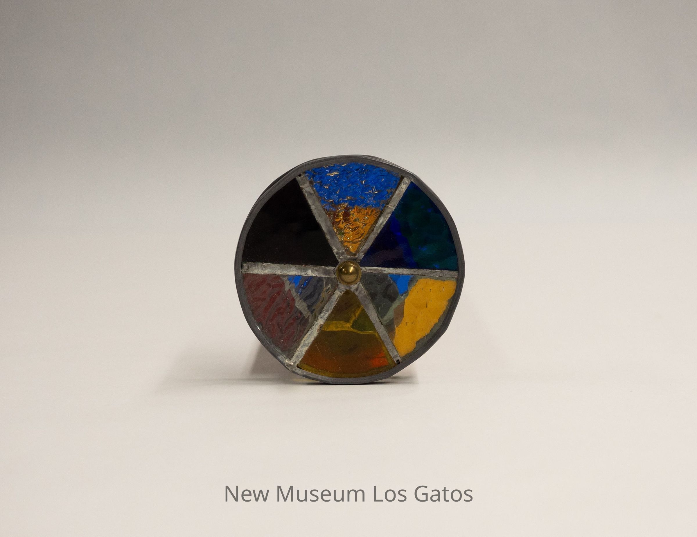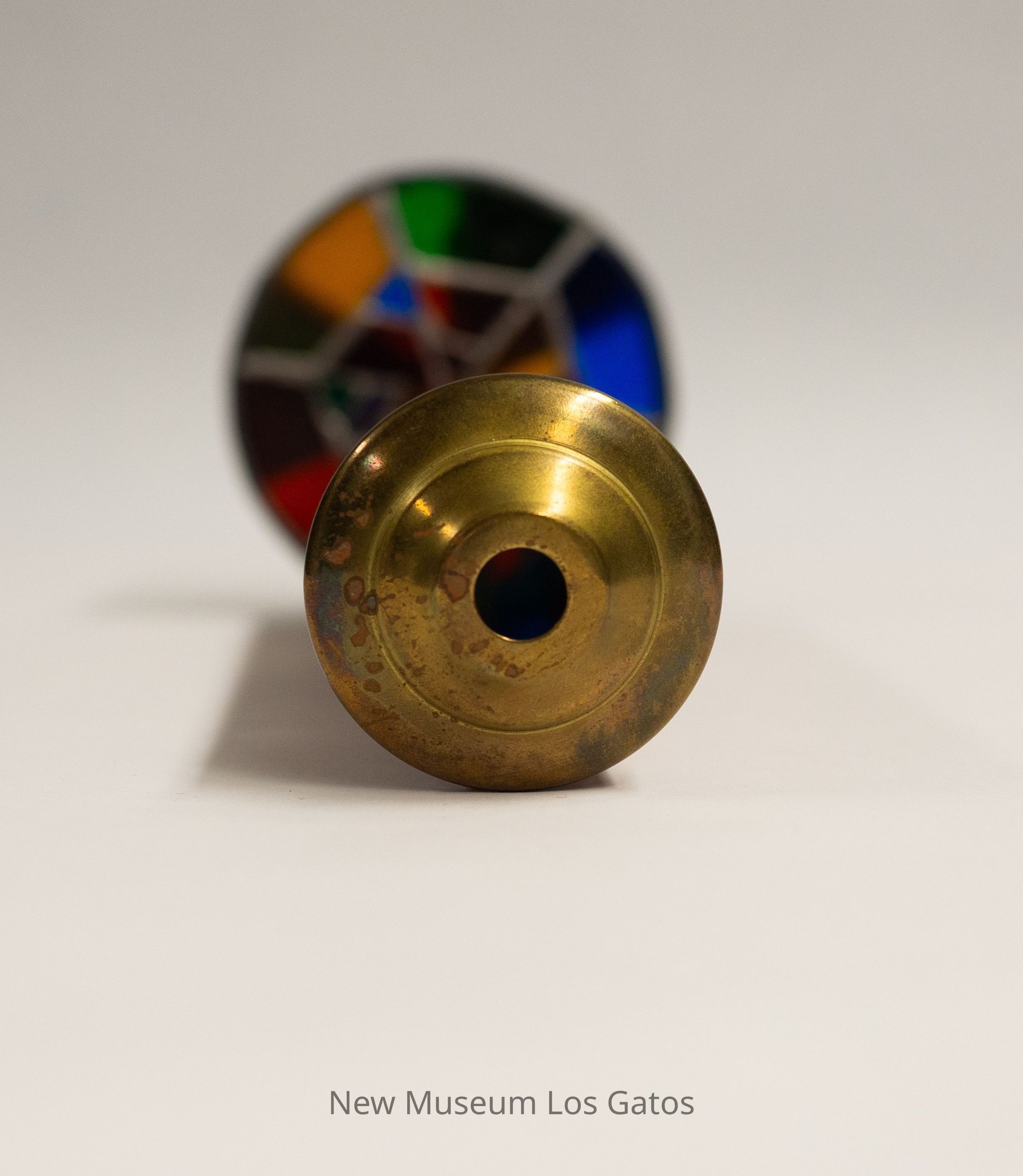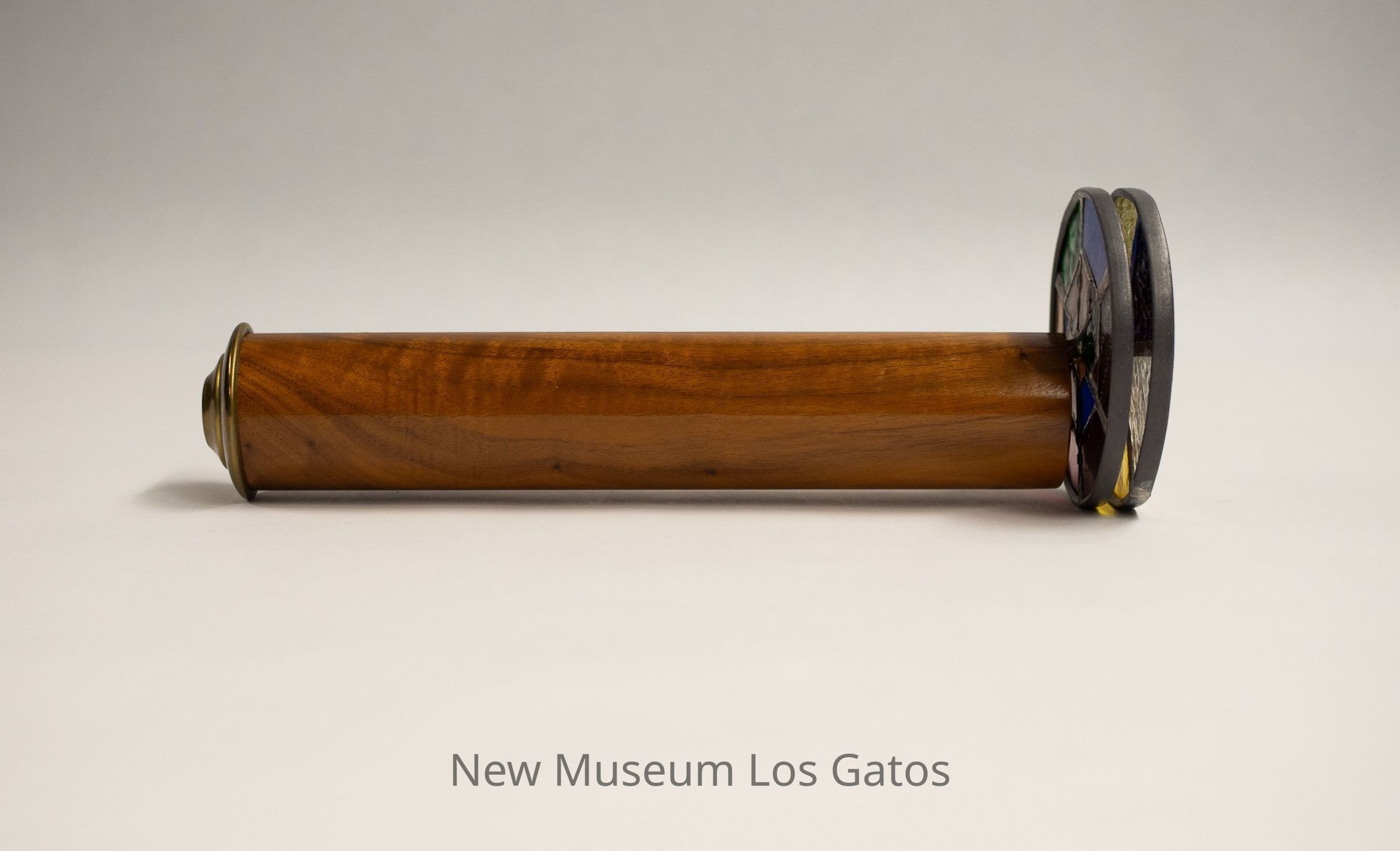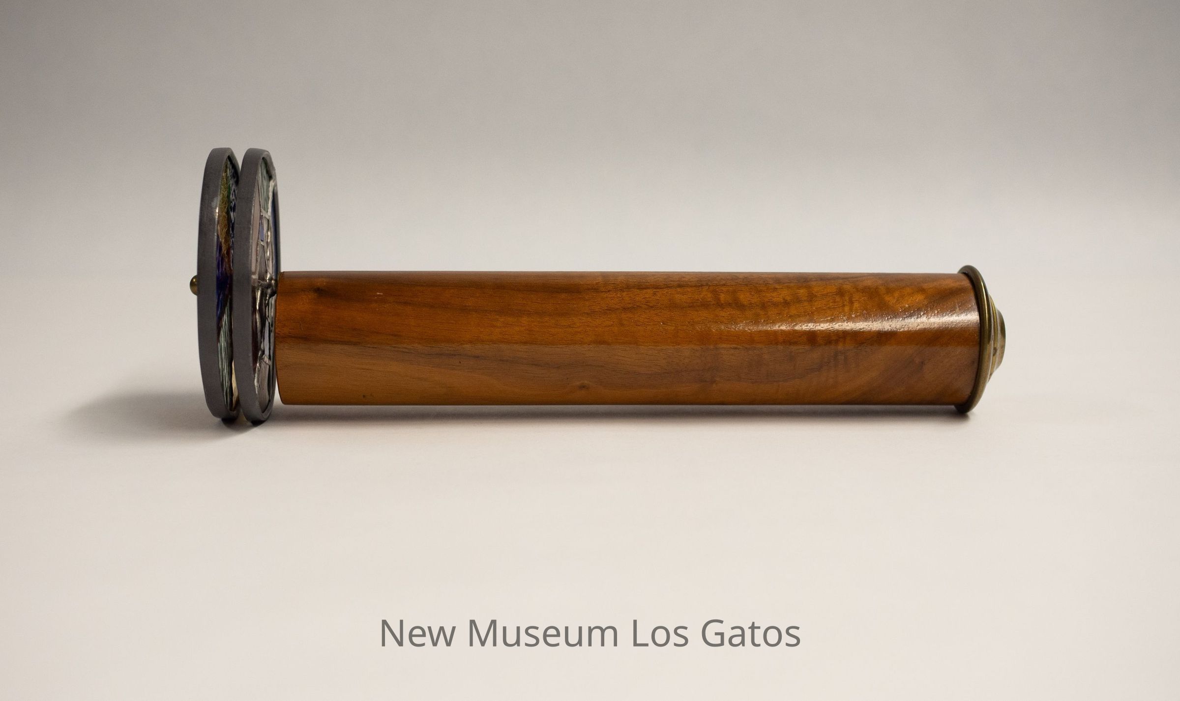 A large, stained glass kaleidoscope. The body is polished wood, and cylindrical in shape. The eyepiece is brass. There are two circular colorful stained glass view pieces; the first has six equal-sized pie slices, while the second also has six pie slices that are further subdivided into two smaller triangles.Collection