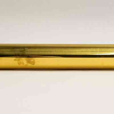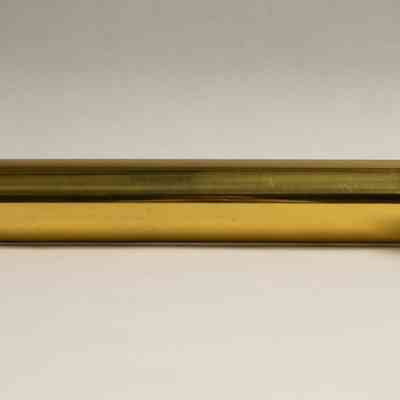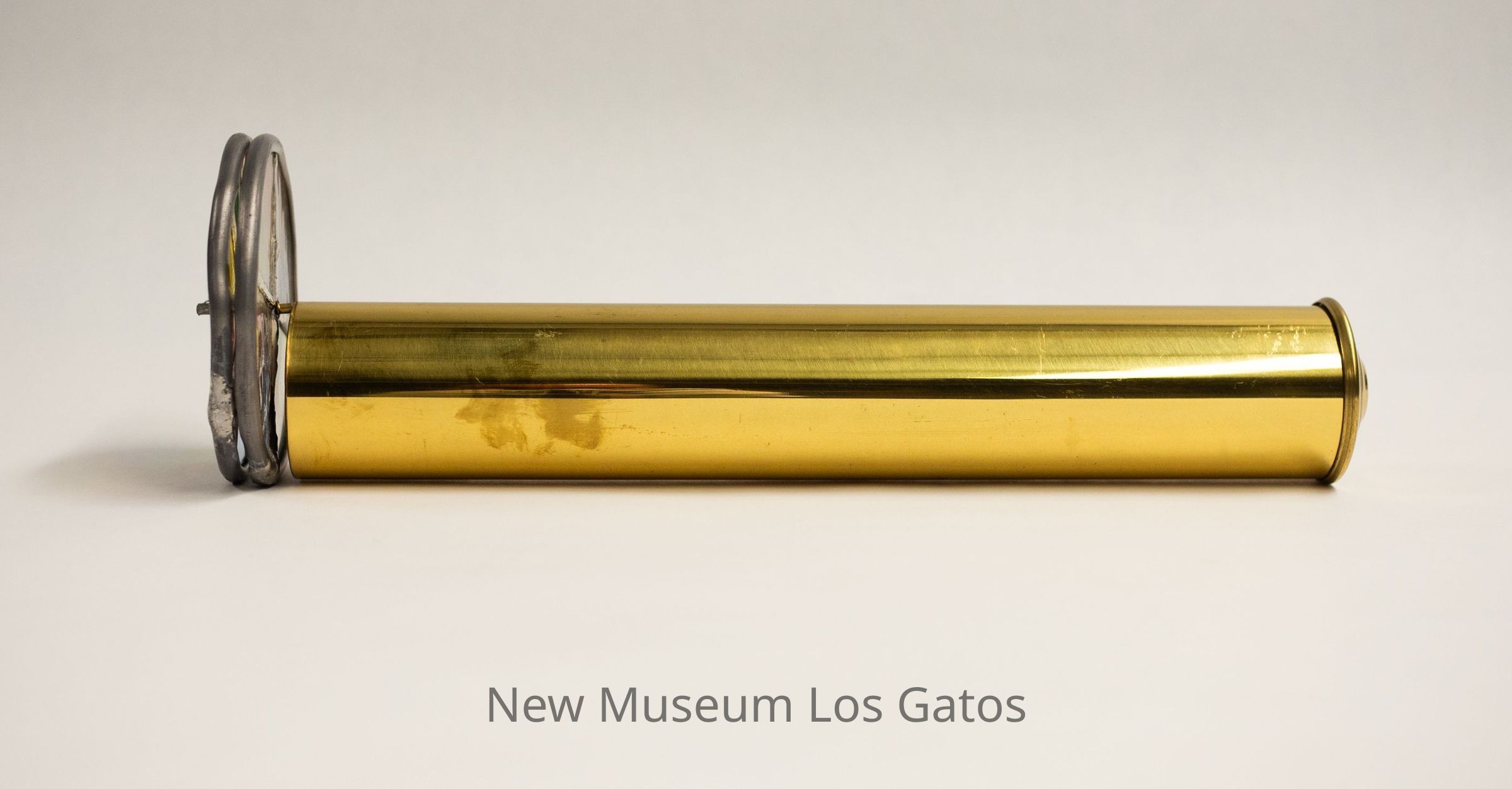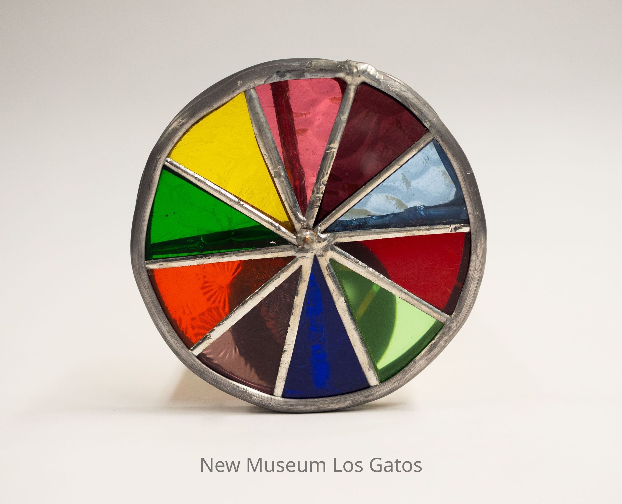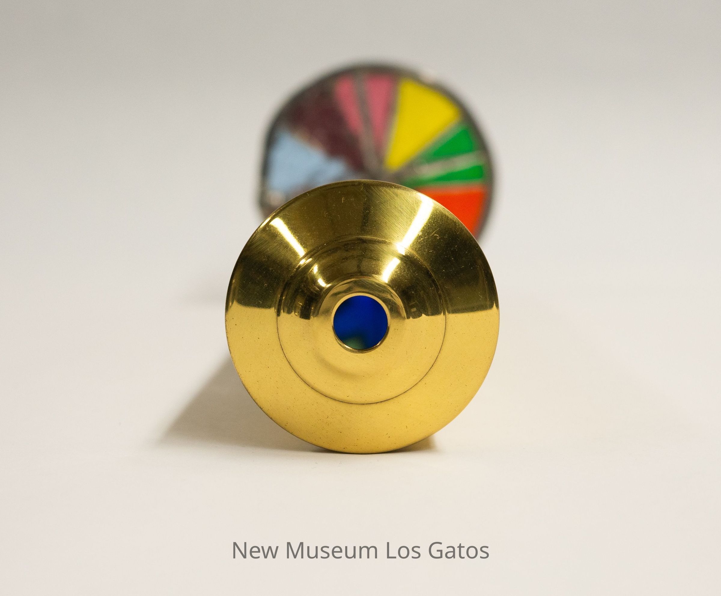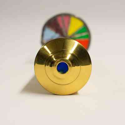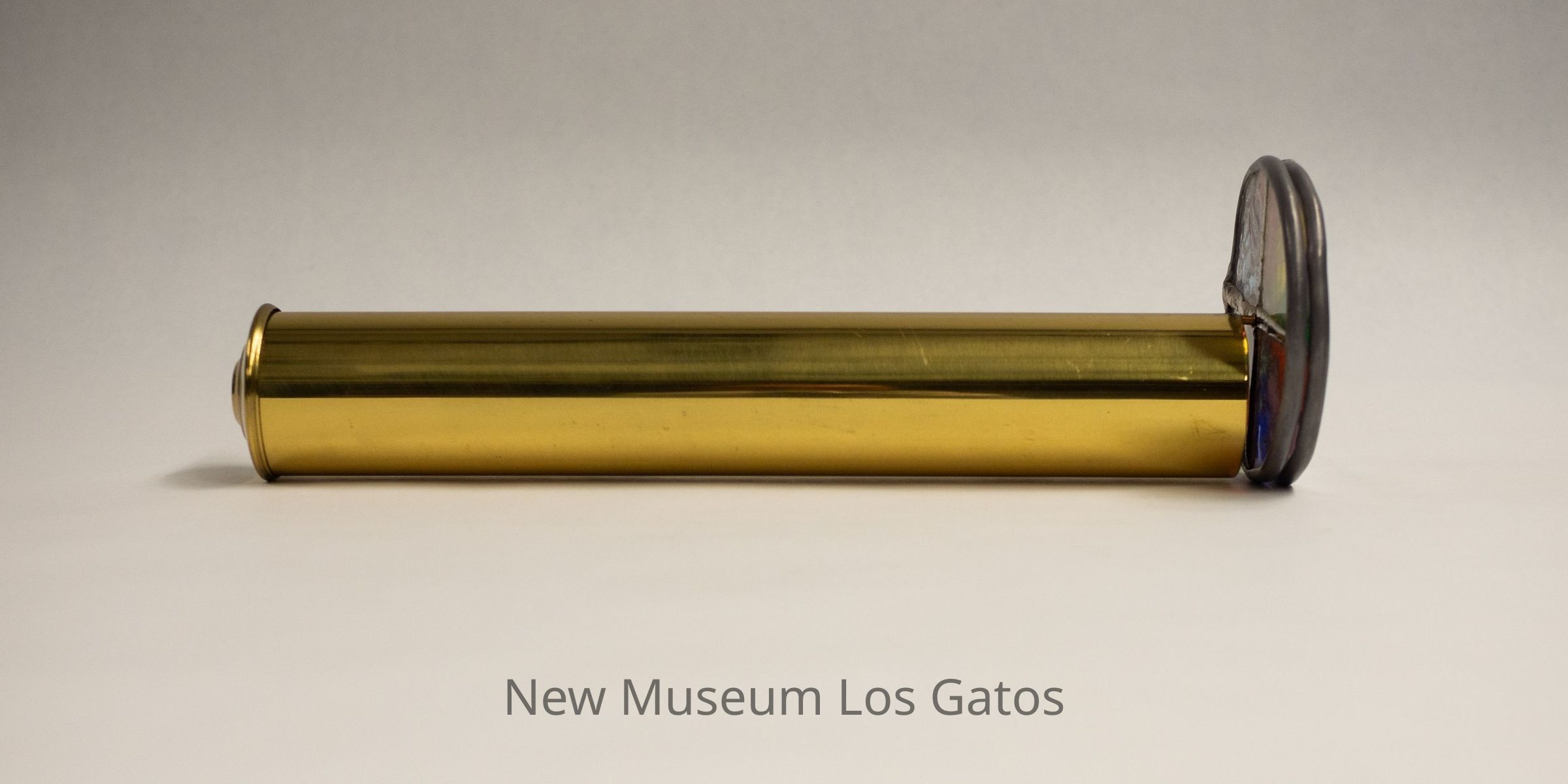 A large, stained glass kaleidoscope. The body is cylindrical, and made out of brass. The eyepiece is also brass. There are two circular moveable view pieces; the exterior piece has eight sections with different color glass, while the interior piece has four sections with different textures on clear glass.Collection