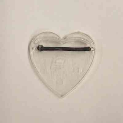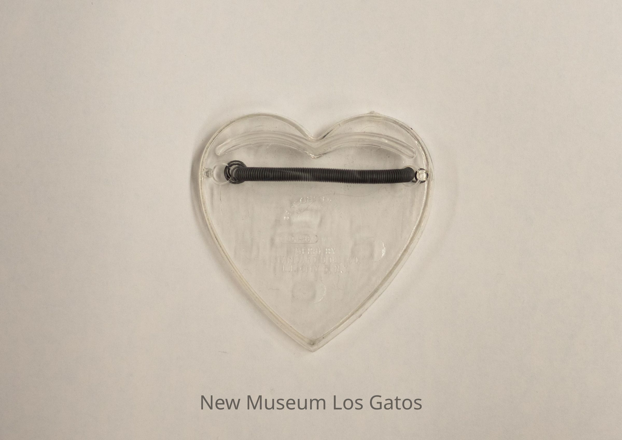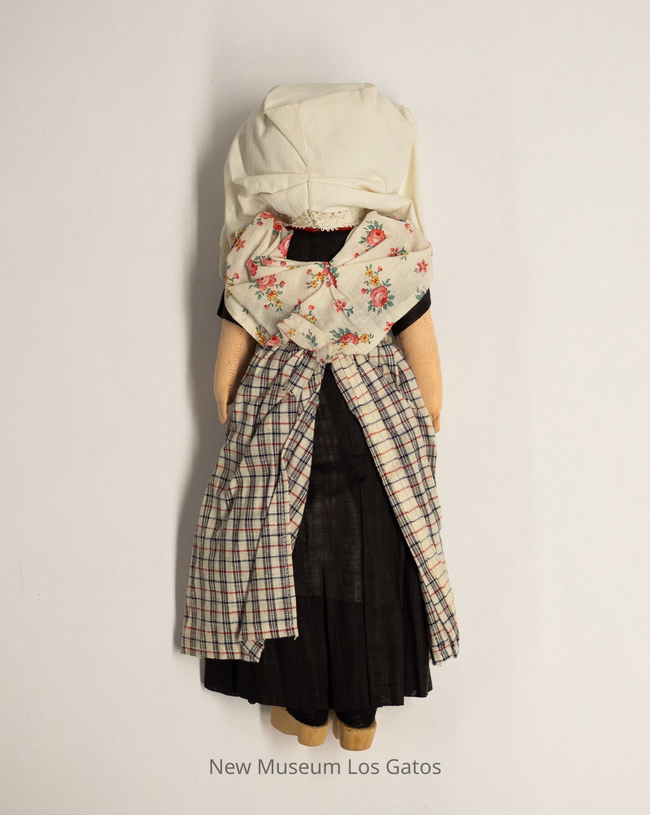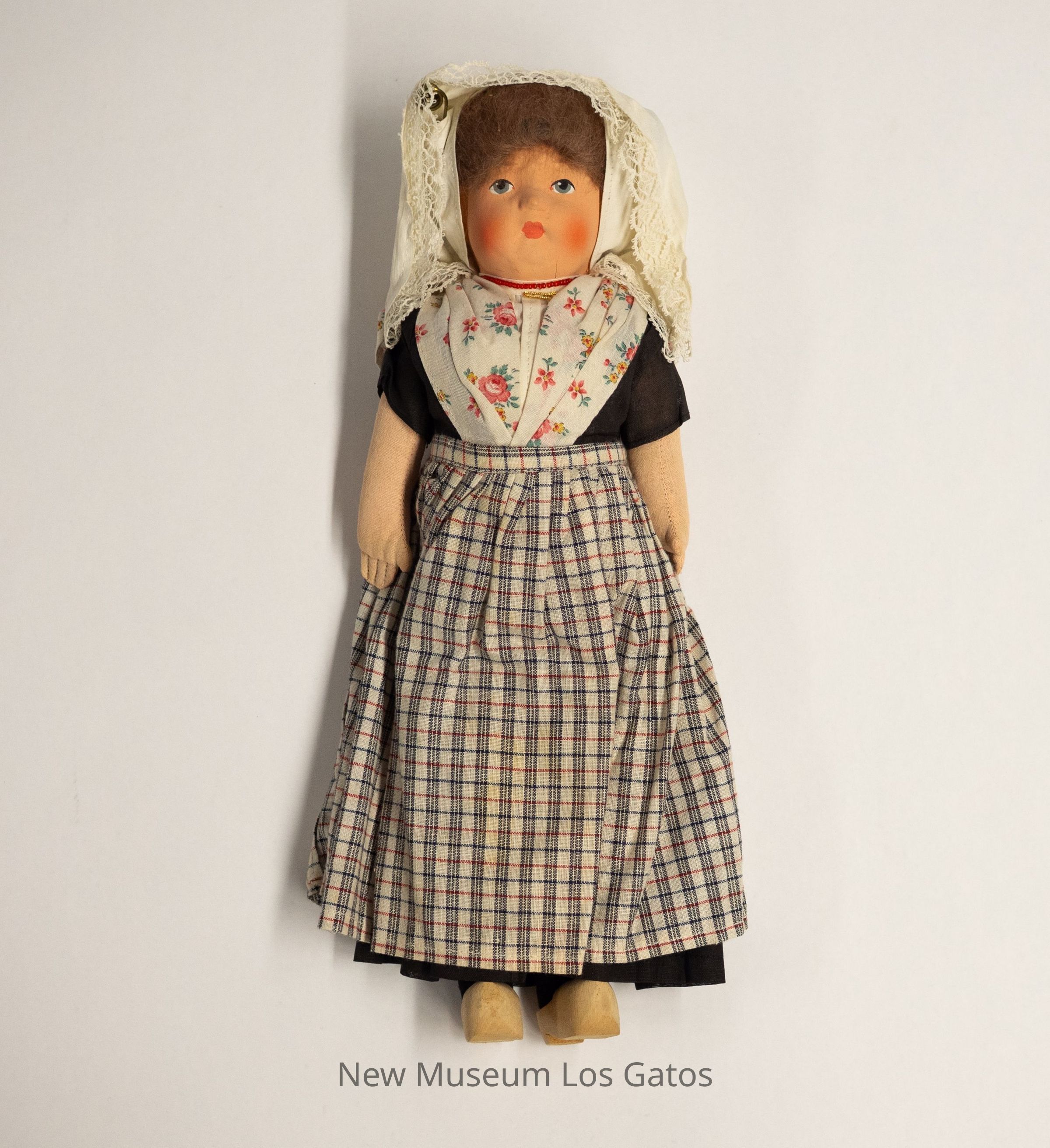 A fabric and paper mâché Dutch female doll. The doll is wearing a black dress, with a floral shawl and a white, red, black, and blue checkered apron. She is also wearing brown wooden clogs, and a white hood with lace trim. Accompanying the doll is a clear plastic stand in the shape of a heart, with a silver metal spring.Collection