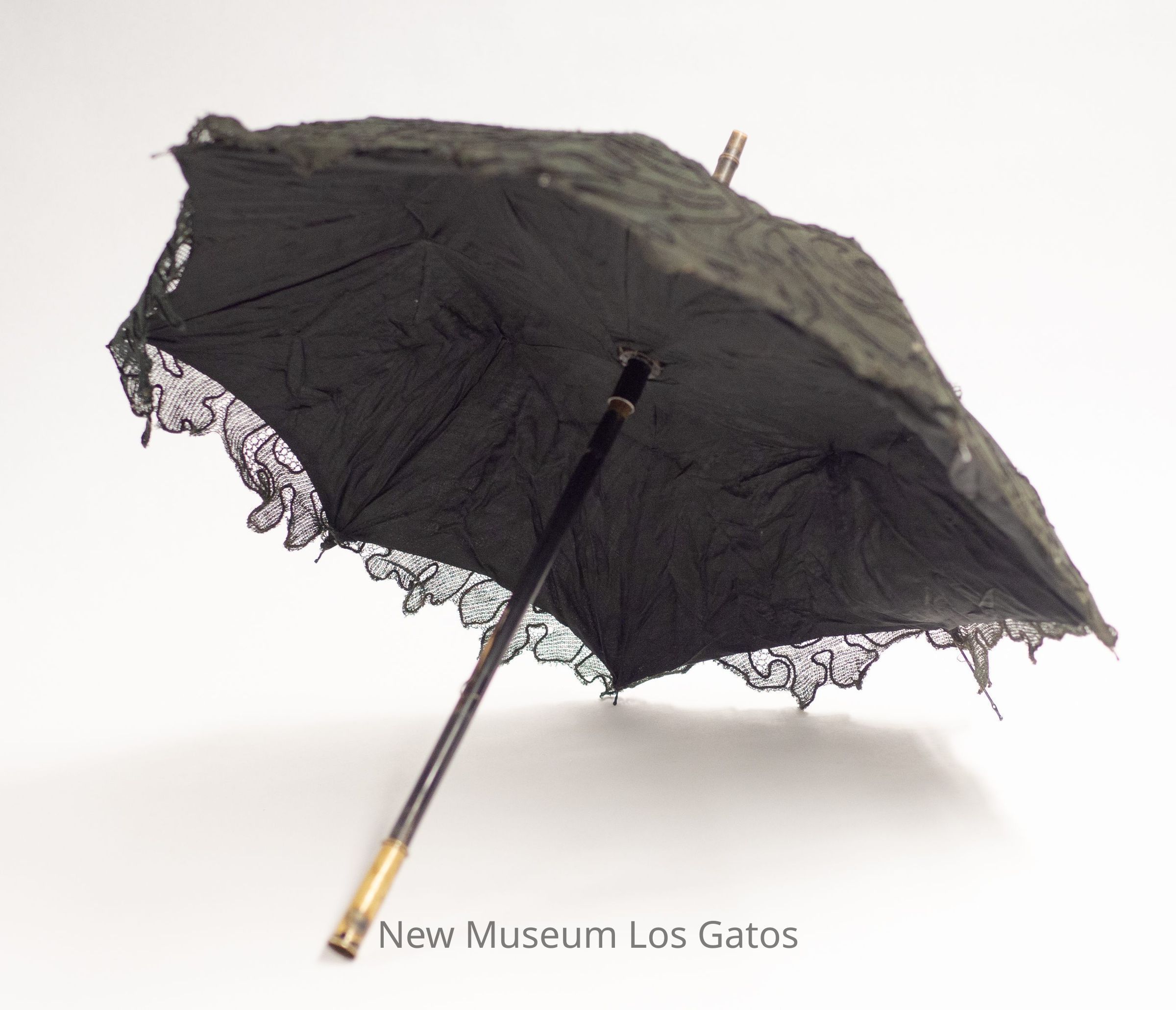 A small black umbrella with chantilly lace, and a short metal tip. The inner lining is black. The handle is designed to be foldable, but is missing the lower section of the shaft.Collection