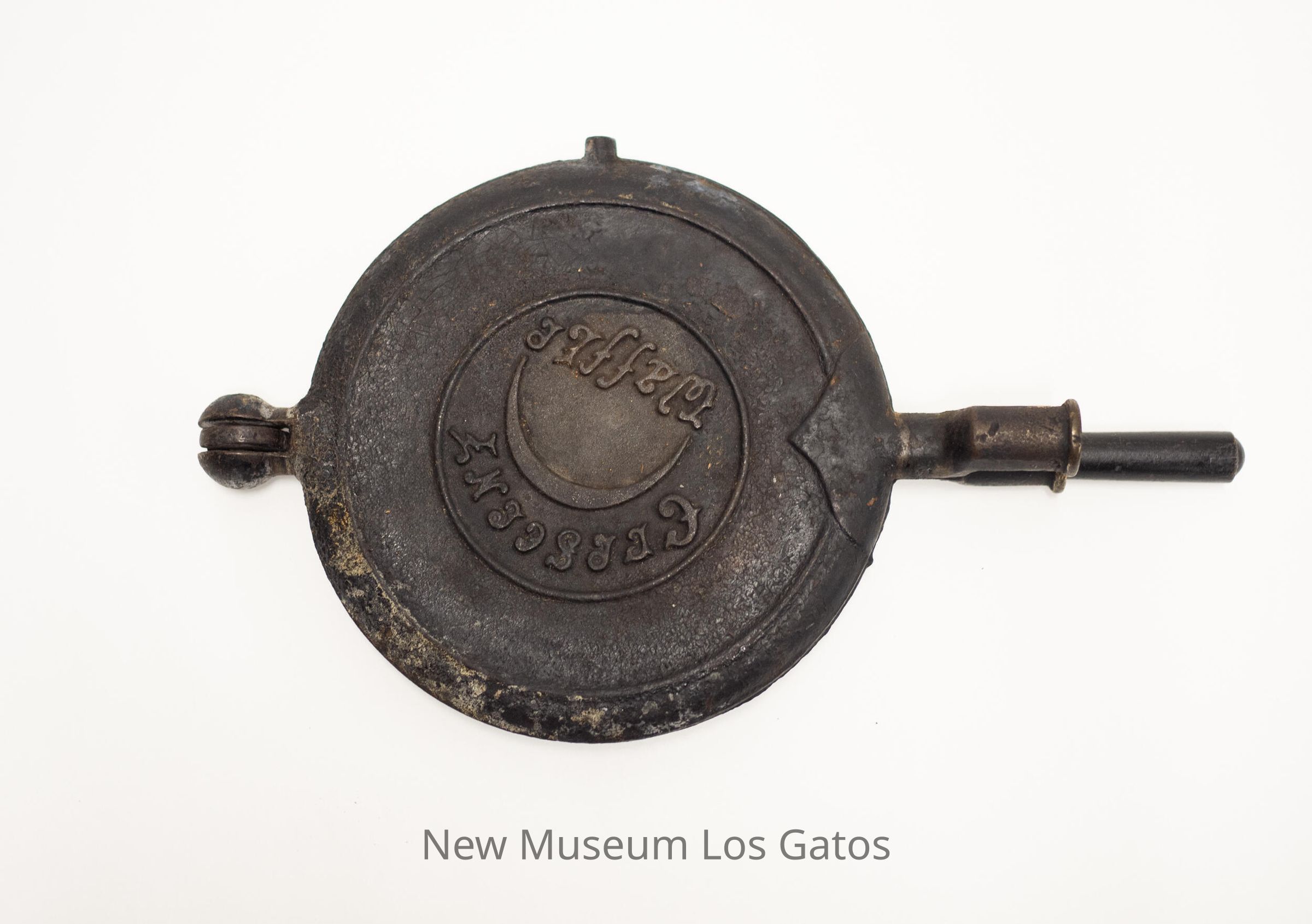 Metal waffle iron, with rotating and detachable top mold for waffles and accompanying base.