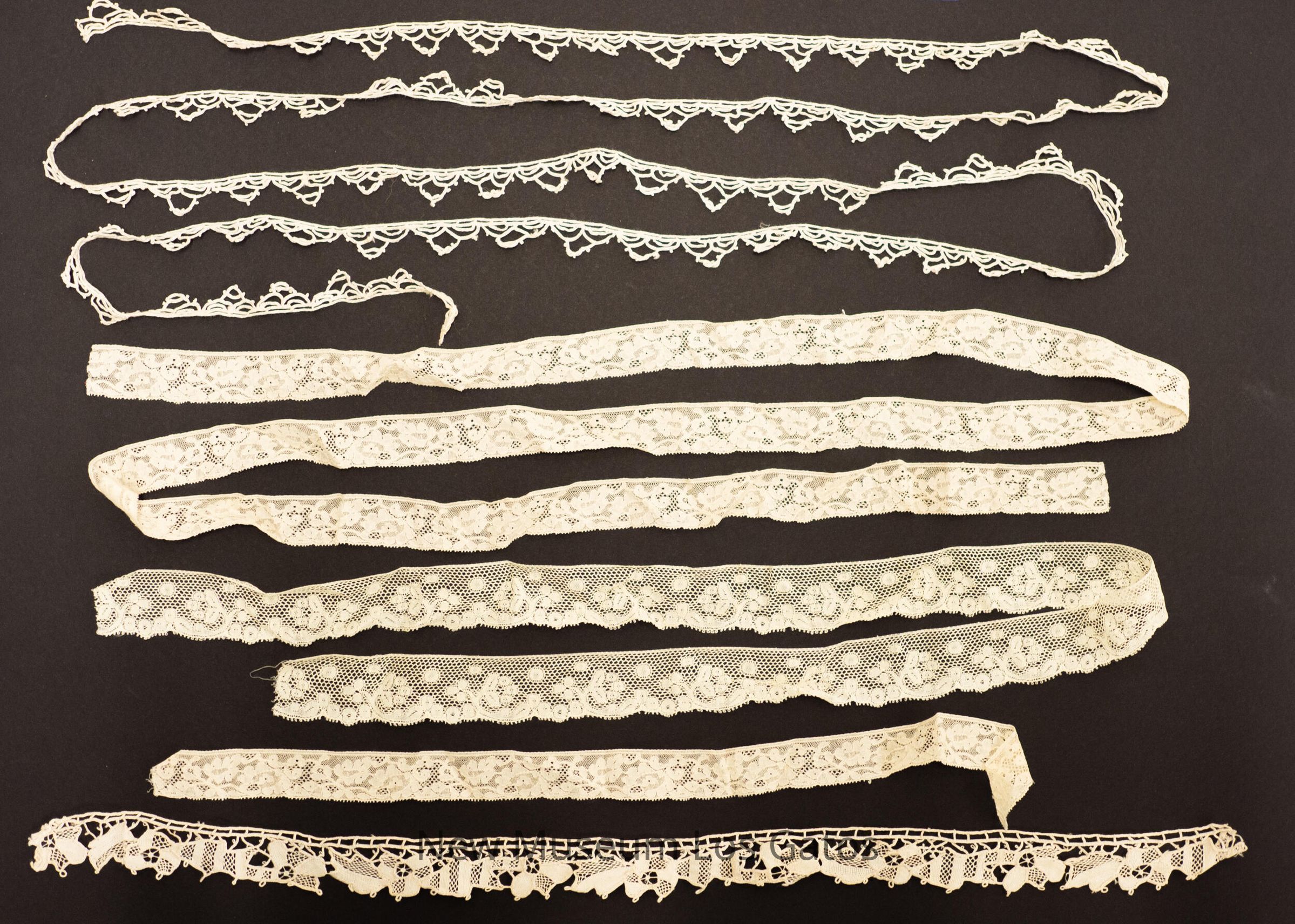 Five pieces of lace trim, in varying patterns and lengths. Four pieces have a floral pattern, while the fifth piece has a geometric pattern.