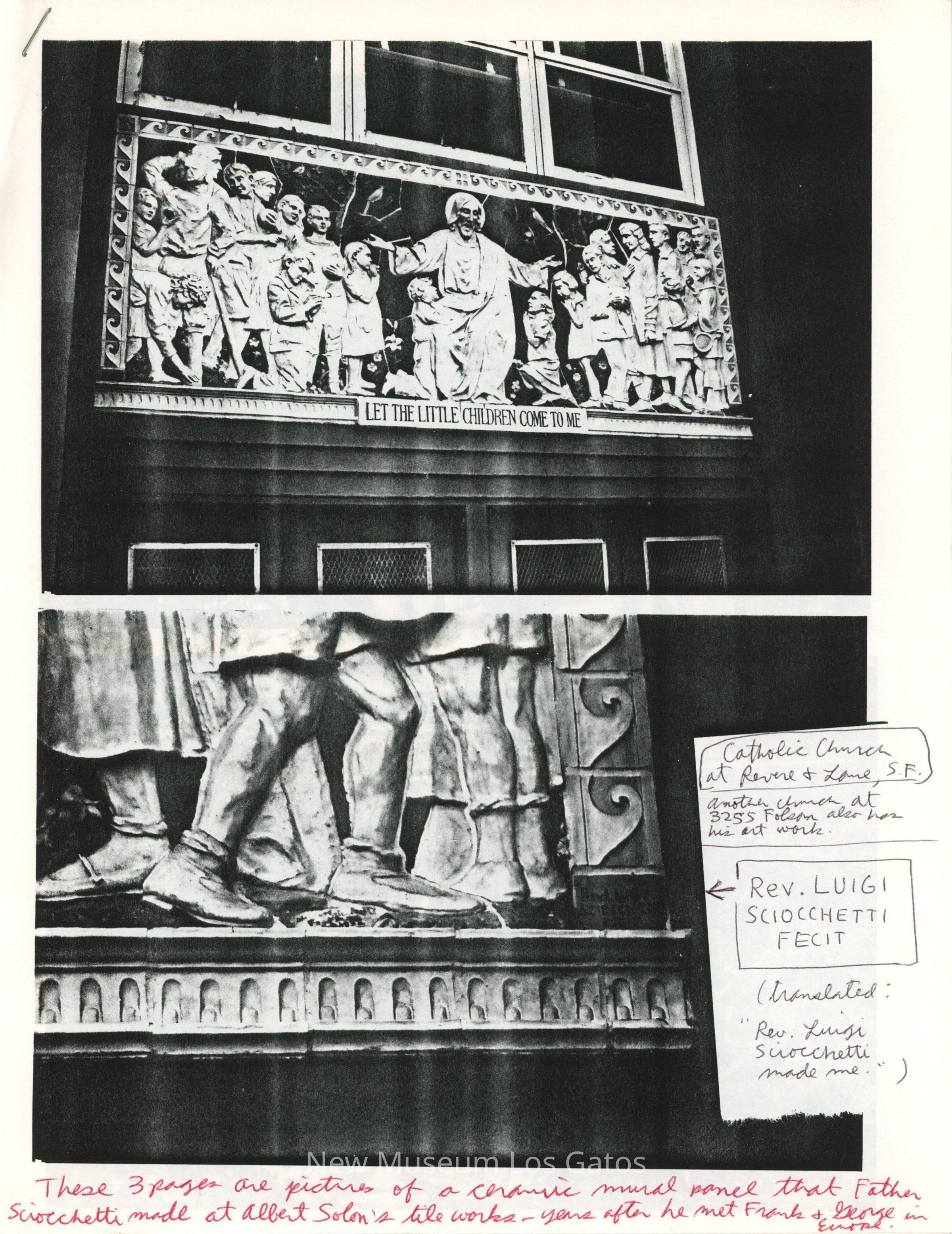 Three stapled photocopies of black and white photographs of tile work and sculpture by artist Father Luigi Sciocchetti at an unknown church in San Francisco. There are handwritten notes on the first page.Collection