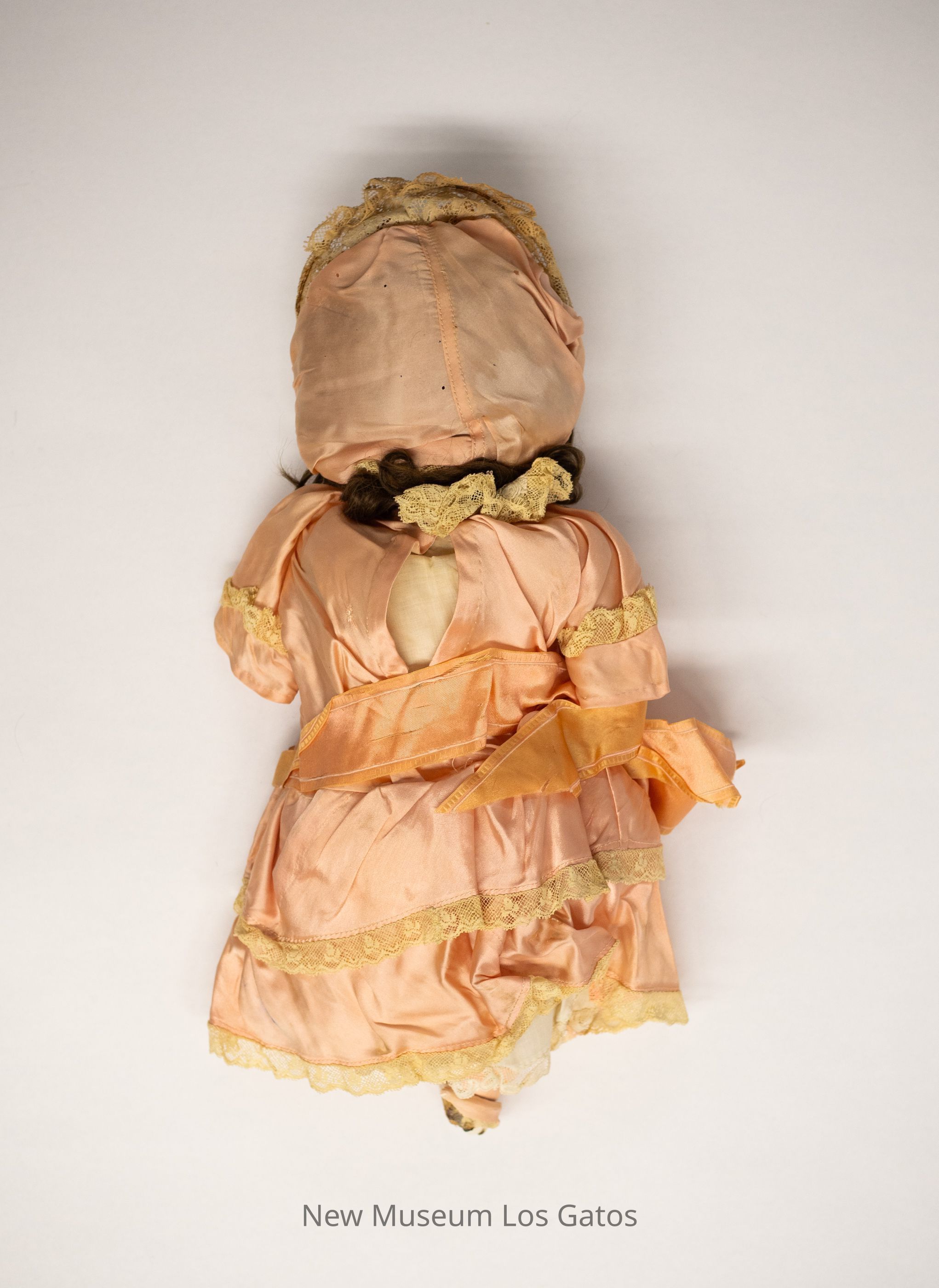 A large, bisque female doll. The doll is wearing white shoes and a pink, multi-tiered dress with white lace accents. There is a pink sash around the doll's waist, with a large pink bow on one end and a blue and purple flower on the other end. The doll has brown curly hair, underneath a pink bonnet with lace detailing. The doll's eyes open and close as the doll is raised and lowered. The doll's limbs have become completely separated from its body, and some have disjoined even further.Collection