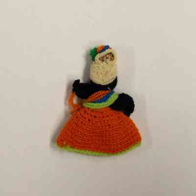 A hanging knit ornament of a woman. The woman is wearing a bright orange skirt with a green hem, and a bright blue, orange, and green sash over her shoulder. She has a white head wrap underneath a basket of fruit on her head. There is a white loop attached to her head, for hanging.Collection