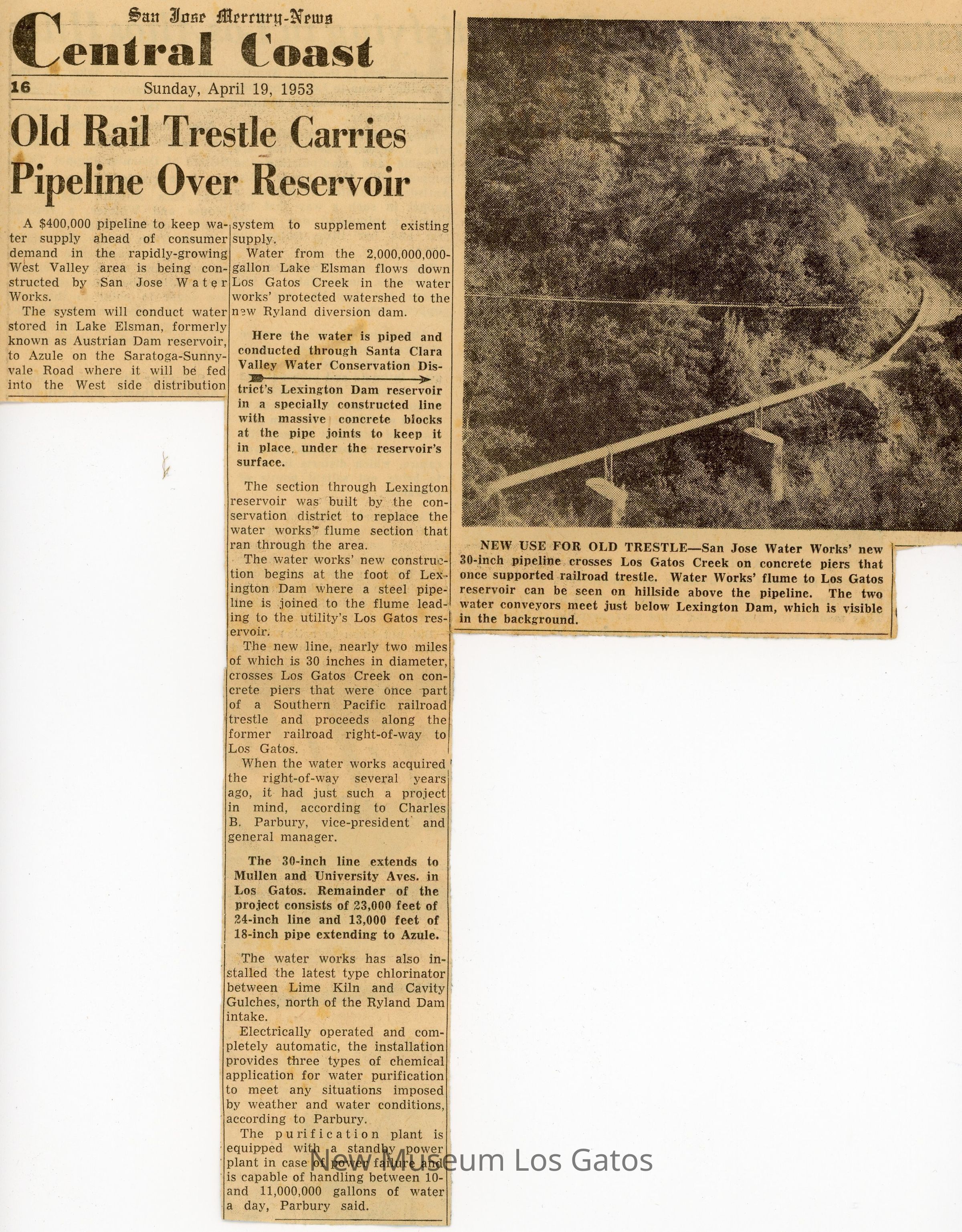 A clipping from the April 19, 1953 issue of the San Jose Mercury News, featuring an article about an old railroad trestle carrying new pipeline over the Lexington Reservoir.Collection