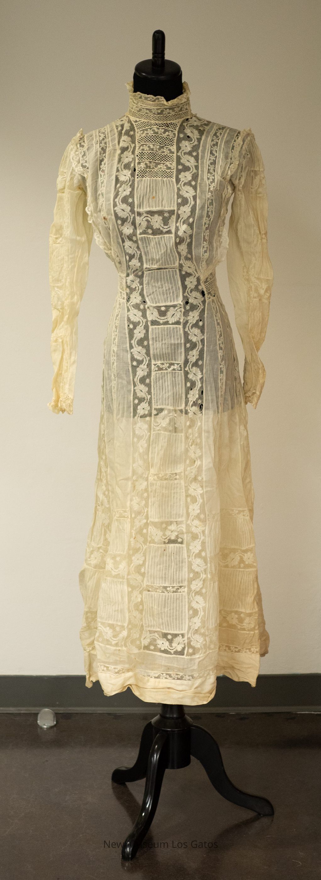 A long-sleeved, ecru batiste day dress with lace detailing. The bottom section of skirt features horizontal bands of alternating vertical stripes and floral lace, while the upper portion of the skirt and the bodice feature vertical stripes of floral lace, with a band of thin vertical stripes in the center. The sleeves have sections of thin stripes in between bands of floral lace. The dress opens in the back, and closes with a total of 22 iridescent white buttons.Collection
